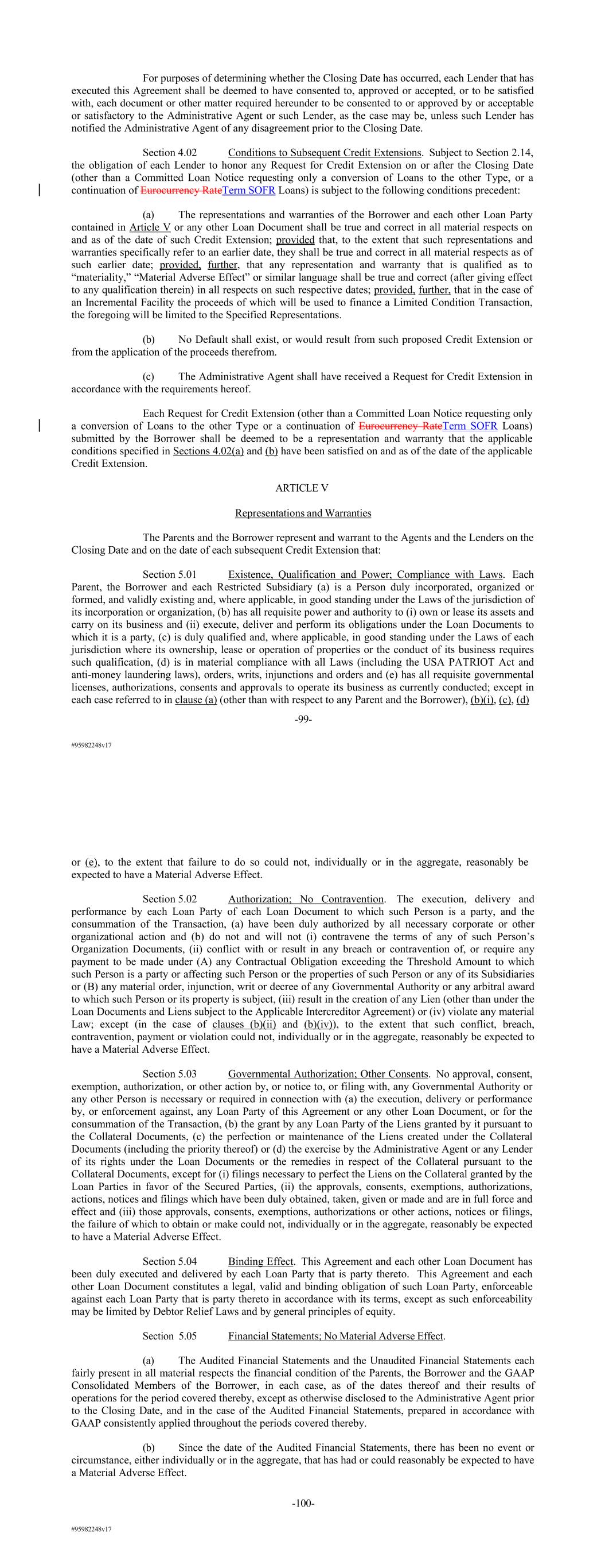 #95982248v17 For purposes of determining whether the Closing Date has occurred, each Lender that has executed this Agreement shall be deemed to have consented to, approved or accepted, or to be satisfied with, each document or other matter required hereunder to be consented to or approved by or acceptable or satisfactory to the Administrative Agent or such Lender, as the case may be, unless such Lender has notified the Administrative Agent of any disagreement prior to the Closing Date. Section 4.02 Conditions to Subsequent Credit Extensions. Subject to Section 2.14, the obligation of each Lender to honor any Request for Credit Extension on or after the Closing Date (other than a Committed Loan Notice requesting only a conversion of Loans to the other Type, or a continuation of Eurocurrency RateTerm SOFR Loans) is subject to the following conditions precedent: (a) The representations and warranties of the Borrower and each other Loan Party contained in Article V or any other Loan Document shall be true and correct in all material respects on and as of the date of such Credit Extension; provided that, to the extent that such representations and warranties specifically refer to an earlier date, they shall be true and correct in all material respects as of such earlier date; provided, further, that any representation and warranty that is qualified as to “materiality,” “Material Adverse Effect” or similar language shall be true and correct (after giving effect to any qualification therein) in all respects on such respective dates; provided, further, that in the case of an Incremental Facility the proceeds of which will be used to finance a Limited Condition Transaction, the foregoing will be limited to the Specified Representations. (b) No Default shall exist, or would result from such proposed Credit Extension or from the application of the proceeds therefrom. (c) The Administrative Agent shall have received a Request for Credit Extension in accordance with the requirements hereof. Each Request for Credit Extension (other than a Committed Loan Notice requesting only a conversion of Loans to the other Type or a continuation of Eurocurrency RateTerm SOFR Loans) submitted by the Borrower shall be deemed to be a representation and warranty that the applicable conditions specified in Sections 4.02(a) and (b) have been satisfied on and as of the date of the applicable Credit Extension. ARTICLE V Representations and Warranties The Parents and the Borrower represent and warrant to the Agents and the Lenders on the Closing Date and on the date of each subsequent Credit Extension that: Section 5.01 Existence, Qualification and Power; Compliance with Laws. Each Parent, the Borrower and each Restricted Subsidiary (a) is a Person duly incorporated, organized or formed, and validly existing and, where applicable, in good standing under the Laws of the jurisdiction of its incorporation or organization, (b) has all requisite power and authority to (i) own or lease its assets and carry on its business and (ii) execute, deliver and perform its obligations under the Loan Documents to which it is a party, (c) is duly qualified and, where applicable, in good standing under the Laws of each jurisdiction where its ownership, lease or operation of properties or the conduct of its business requires such qualification, (d) is in material compliance with all Laws (including the USA PATRIOT Act and anti-money laundering laws), orders, writs, injunctions and orders and (e) has all requisite governmental licenses, authorizations, consents and approvals to operate its business as currently conducted; except in each case referred to in clause (a) (other than with respect to any Parent and the Borrower), (b)(i), (c), (d) -99- #95982248v17 or (e), to the extent that failure to do so could not, individually or in the aggregate, reasonably be expected to have a Material Adverse Effect. Section 5.02 Authorization; No Contravention. The execution, delivery and performance by each Loan Party of each Loan Document to which such Person is a party, and the consummation of the Transaction, (a) have been duly authorized by all necessary corporate or other organizational action and (b) do not and will not (i) contravene the terms of any of such Person’s Organization Documents, (ii) conflict with or result in any breach or contravention of, or require any payment to be made under (A) any Contractual Obligation exceeding the Threshold Amount to which such Person is a party or affecting such Person or the properties of such Person or any of its Subsidiaries or (B) any material order, injunction, writ or decree of any Governmental Authority or any arbitral award to which such Person or its property is subject, (iii) result in the creation of any Lien (other than under the Loan Documents and Liens subject to the Applicable Intercreditor Agreement) or (iv) violate any material Law; except (in the case of clauses (b)(ii) and (b)(iv)), to the extent that such conflict, breach, contravention, payment or violation could not, individually or in the aggregate, reasonably be expected to have a Material Adverse Effect. Section 5.03 Governmental Authorization; Other Consents. No approval, consent, exemption, authorization, or other action by, or notice to, or filing with, any Governmental Authority or any other Person is necessary or required in connection with (a) the execution, delivery or performance by, or enforcement against, any Loan Party of this Agreement or any other Loan Document, or for the consummation of the Transaction, (b) the grant by any Loan Party of the Liens granted by it pursuant to the Collateral Documents, (c) the perfection or maintenance of the Liens created under the Collateral Documents (including the priority thereof) or (d) the exercise by the Administrative Agent or any Lender of its rights under the Loan Documents or the remedies in respect of the Collateral pursuant to the Collateral Documents, except for (i)