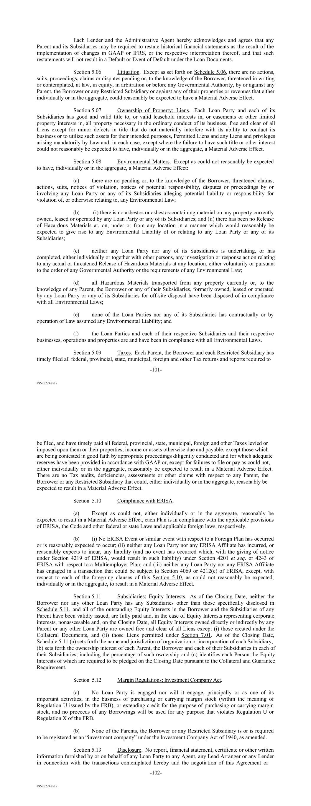 #95982248v17 Each Lender and the Administrative Agent hereby acknowledges and agrees that any Parent and its Subsidiaries may be required to restate historical financial statements as the result of the implementation of changes in GAAP or IFRS, or the respective interpretation thereof, and that such restatements will not result in a Default or Event of Default under the Loan Documents. Section 5.06 Litigation. Except as set forth on Schedule 5.06, there are no actions, suits, proceedings, claims or disputes pending or, to the knowledge of the Borrower, threatened in writing or contemplated, at law, in equity, in arbitration or before any Governmental Authority, by or against any Parent, the Borrower or any Restricted Subsidiary or against any of their properties or revenues that either individually or in the aggregate, could reasonably be expected to have a Material Adverse Effect. Section 5.07 Ownership of Property; Liens. Each Loan Party and each of its Subsidiaries has good and valid title to, or valid leasehold interests in, or easements or other limited property interests in, all property necessary in the ordinary conduct of its business, free and clear of all Liens except for minor defects in title that do not materially interfere with its ability to conduct its business or to utilize such assets for their intended purposes, Permitted Liens and any Liens and privileges arising mandatorily by Law and, in each case, except where the failure to have such title or other interest could not reasonably be expected to have, individually or in the aggregate, a Material Adverse Effect. Section 5.08 Environmental Matters. Except as could not reasonably be expected to have, individually or in the aggregate, a Material Adverse Effect: (a) there are no pending or, to the knowledge of the Borrower, threatened claims, actions, suits, notices of violation, notices of potential responsibility, disputes or proceedings by or involving any Loan Party or any of its Subsidiaries alleging potential liability or responsibility for violation of, or otherwise relating to, any Environmental Law; (b) (i) there is no asbestos or asbestos-containing material on any property currently owned, leased or operated by any Loan Party or any of its Subsidiaries; and (ii) there has been no Release of Hazardous Materials at, on, under or from any location in a manner which would reasonably be expected to give rise to any Environmental Liability of or relating to any Loan Party or any of its Subsidiaries; (c) neither any Loan Party nor any of its Subsidiaries is undertaking, or has completed, either individually or together with other persons, any investigation or response action relating to any actual or threatened Release of Hazardous Materials at any location, either voluntarily or pursuant to the order of any Governmental Authority or the requirements of any Environmental Law; (d) all Hazardous Materials transported from any property currently or, to the knowledge of any Parent, the Borrower or any of their Subsidiaries, formerly owned, leased or operated by any Loan Party or any of its Subsidiaries for off-site disposal have been disposed of in compliance with all Environmental Laws; (e) none of the Loan Parties nor any of its Subsidiaries has contractually or by operation of Law assumed any Environmental Liability; and (f) the Loan Parties and each of their respective Subsidiaries and their respective businesses, operations and properties are and have been in compliance with all Environmental Laws. Section 5.09 Taxes. Each Parent, the Borrower and each Restricted Subsidiary has timely filed all federal, provincial, state, municipal, foreign and other Tax returns and reports required to -101- #95982248v17 be filed, and have timely paid all federal, provincial, state, municipal, foreign and other Taxes levied or imposed upon them or their properties, income or assets otherwise due and payable, except those which are being contested in good faith by appropriate proceedings diligently conducted and for which adequate reserves have been provided in accordance with GAAP or, except for failures to file or pay as could not, either individually or in the aggregate, reasonably be expected to result in a Material Adverse Effect. There are no Tax audits, deficiencies, assessments or other claims with respect to any Parent, the Borrower or any Restricted Subsidiary that could, either individually or in the aggregate, reasonably be expected to result in a Material Adverse Effect. Section 5.10 Compliance with ERISA. (a) Except as could not, either individually or in the aggregate, reasonably be expected to result in a Material Adverse Effect, each Plan is in compliance with the applicable provisions of ERISA, the Code and other federal or state Laws and applicable foreign laws, respectively. (b) (i) No ERISA Event or similar event with respect to a Foreign Plan has occurred or is reasonably expected to occur; (ii) neither any Loan Party nor any ERISA Affiliate has incurred, or reasonably expects to incur, any liability (and no event has occurred which, with the giving of notice under Section 4219 of ERISA, would result in such liability) under Section 4201 et seq. or 4243 of ERISA with respect to a Multiemployer Plan; and (iii) neither any Loan Party nor any ERISA Affiliate has engaged in a transaction that could be subject to Section 4069 or 4212(c) of ERISA, except, with respect to each of the foregoing clauses of this Section 5.10, as could not reasonably be expected, individually or in the aggregate, to result in a Material Adverse Effect. Section 5.11 Subsidiaries; Equity Interests. As of the Closing Date, neither the Borrower nor any other Loan Party has any Subsidiaries other than those specifically disclosed in Schedule 5.11, and all of the outstanding Equity Interests in the Borrower and the Subsidiaries of any Parent have been validly issued, are fully paid and, in the case of Equity Interests representing corporate inter