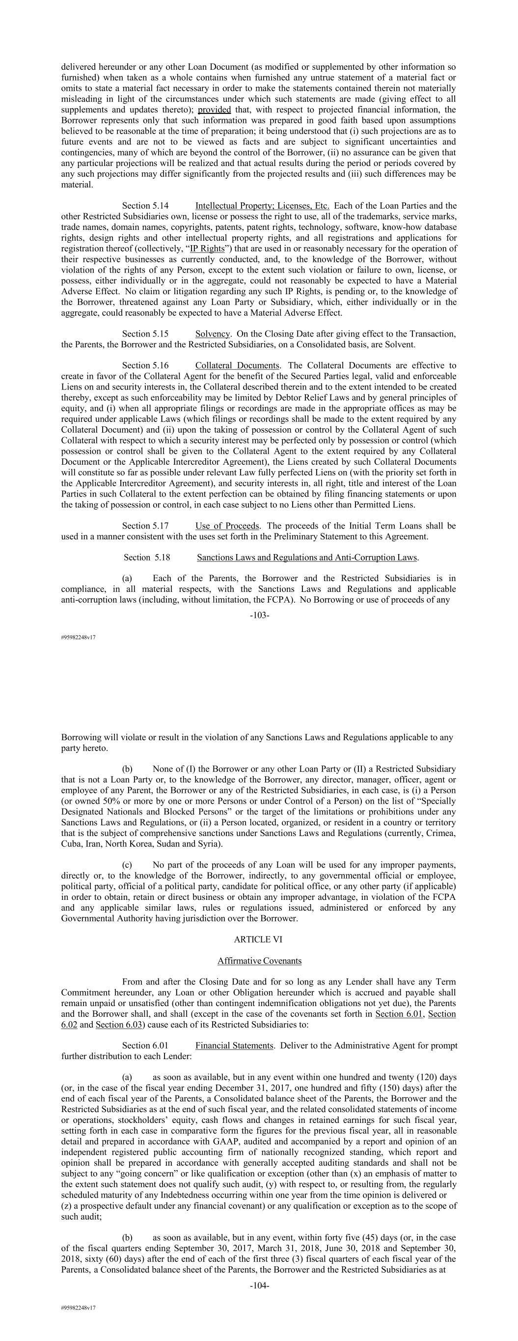 #95982248v17 delivered hereunder or any other Loan Document (as modified or supplemented by other information so furnished) when taken as a whole contains when furnished any untrue statement of a material fact or omits to state a material fact necessary in order to make the statements contained therein not materially misleading in light of the circumstances under which such statements are made (giving effect to all supplements and updates thereto); provided that, with respect to projected financial information, the Borrower represents only that such information was prepared in good faith based upon assumptions believed to be reasonable at the time of preparation; it being understood that (i) such projections are as to future events and are not to be viewed as facts and are subject to significant uncertainties and contingencies, many of which are beyond the control of the Borrower, (ii) no assurance can be given that any particular projections will be realized and that actual results during the period or periods covered by any such projections may differ significantly from the projected results and (iii) such differences may be material. Section 5.14 Intellectual Property; Licenses, Etc. Each of the Loan Parties and the other Restricted Subsidiaries own, license or possess the right to use, all of the trademarks, service marks, trade names, domain names, copyrights, patents, patent rights, technology, software, know-how database rights, design rights and other intellectual property rights, and all registrations and applications for registration thereof (collectively, “IP Rights”) that are used in or reasonably necessary for the operation of their respective businesses as currently conducted, and, to the knowledge of the Borrower, without violation of the rights of any Person, except to the extent such violation or failure to own, license, or possess, either individually or in the aggregate, could not reasonably be expected to have a Material Adverse Effect. No claim or litigation regarding any such IP Rights, is pending or, to the knowledge of the Borrower, threatened against any Loan Party or Subsidiary, which, either individually or in the aggregate, could reasonably be expected to have a Material Adverse Effect. Section 5.15 Solvency. On the Closing Date after giving effect to the Transaction, the Parents, the Borrower and the Restricted Subsidiaries, on a Consolidated basis, are Solvent. Section 5.16 Collateral Documents. The Collateral Documents are effective to create in favor of the Collateral Agent for the benefit of the Secured Parties legal, valid and enforceable Liens on and security interests in, the Collateral described therein and to the extent intended to be created thereby, except as such enforceability may be limited by Debtor Relief Laws and by general principles of equity, and (i) when all appropriate filings or recordings are made in the appropriate offices as may be required under applicable Laws (which filings or recordings shall be made to the extent required by any Collateral Document) and (ii) upon the taking of possession or control by the Collateral Agent of such Collateral with respect to which a security interest may be perfected only by possession or control (which possession or control shall be given to the Collateral Agent to the extent required by any Collateral Document or the Applicable Intercreditor Agreement), the Liens created by such Collateral Documents will constitute so far as possible under relevant Law fully perfected Liens on (with the priority set forth in the Applicable Intercreditor Agreement), and security interests in, all right, title and interest of the Loan Parties in such Collateral to the extent perfection can be obtained by filing financing statements or upon the taking of possession or control, in each case subject to no Liens other than Permitted Liens. Section 5.17 Use of Proceeds. The proceeds of the Initial Term Loans shall be used in a manner consistent with the uses set forth in the Preliminary Statement to this Agreement. Section 5.18 Sanctions Laws and Regulations and Anti-Corruption Laws. (a) Each of the Parents, the Borrower and the Restricted Subsidiaries is in compliance, in all material respects, with the Sanctions Laws and Regulations and applicable anti-corruption laws (including, without limitation, the FCPA). No Borrowing or use of proceeds of any -103- #95982248v17 Borrowing will violate or result in the violation of any Sanctions Laws and Regulations applicable to any party hereto. (b) None of (I) the Borrower or any other Loan Party or (II) a Restricted Subsidiary that is not a Loan Party or, to the knowledge of the Borrower, any director, manager, officer, agent or employee of any Parent, the Borrower or any of the Restricted Subsidiaries, in each case, is (i) a Person (or owned 50% or more by one or more Persons or under Control of a Person) on the list of “Specially Designated Nationals and Blocked Persons” or the target of the limitations or prohibitions under any Sanctions Laws and Regulations, or (ii) a Person located, organized, or resident in a country or territory that is the subject of comprehensive sanctions under Sanctions Laws and Regulations (currently, Crimea, Cuba, Iran, North Korea, Sudan and Syria). (c) No part of the proceeds of any Loan will be used for any improper payments, directly or, to the knowledge of the Borrower, indirectly, to any governmental official or employee, political party, official of a political party, candidate for political office, or any other party (if applicable) in order to obtain, retain or direct business or obtain any improper advantage, in violation of the FCPA and any applicable similar laws, rules or regulations issued, administered or enforced by any Governmental Authority having jurisdiction over the Borrower. ARTICLE VI Affirmative Covenants From and after the Closing Date and for so long as any Lender shall have any Term Commitment hereunder, any Loa
