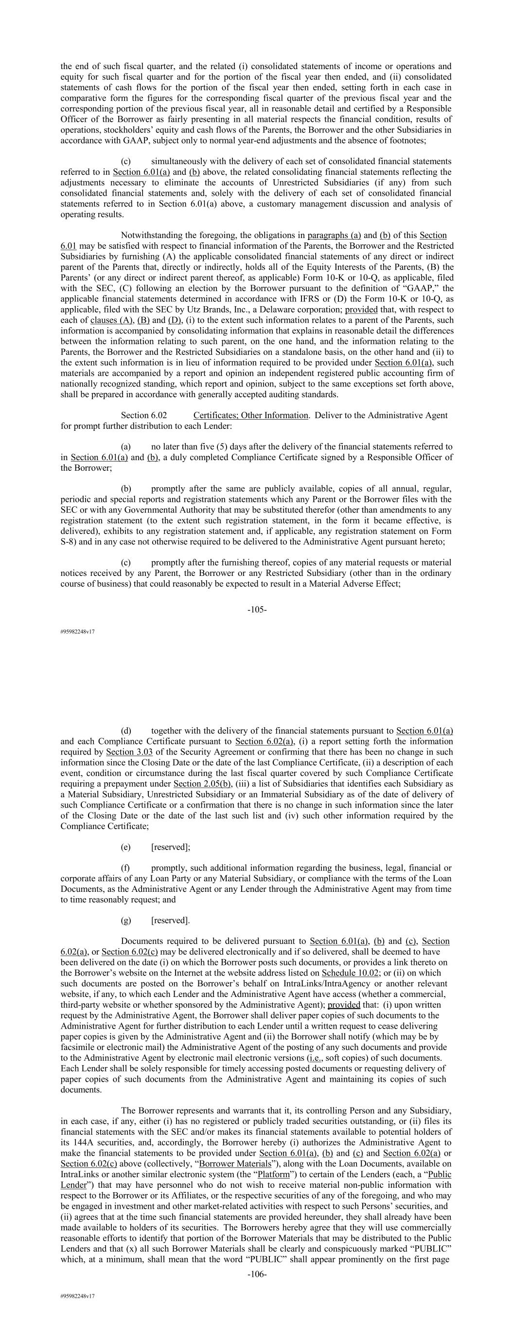 #95982248v17 the end of such fiscal quarter, and the related (i) consolidated statements of income or operations and equity for such fiscal quarter and for the portion of the fiscal year then ended, and (ii) consolidated statements of cash flows for the portion of the fiscal year then ended, setting forth in each case in comparative form the figures for the corresponding fiscal quarter of the previous fiscal year and the corresponding portion of the previous fiscal year, all in reasonable detail and certified by a Responsible Officer of the Borrower as fairly presenting in all material respects the financial condition, results of operations, stockholders’ equity and cash flows of the Parents, the Borrower and the other Subsidiaries in accordance with GAAP, subject only to normal year-end adjustments and the absence of footnotes; (c) simultaneously with the delivery of each set of consolidated financial statements referred to in Section 6.01(a) and (b) above, the related consolidating financial statements reflecting the adjustments necessary to eliminate the accounts of Unrestricted Subsidiaries (if any) from such consolidated financial statements and, solely with the delivery of each set of consolidated financial statements referred to in Section 6.01(a) above, a customary management discussion and analysis of operating results. Notwithstanding the foregoing, the obligations in paragraphs (a) and (b) of this Section 6.01 may be satisfied with respect to financial information of the Parents, the Borrower and the Restricted Subsidiaries by furnishing (A) the applicable consolidated financial statements of any direct or indirect parent of the Parents that, directly or indirectly, holds all of the Equity Interests of the Parents, (B) the Parents’ (or any direct or indirect parent thereof, as applicable) Form 10-K or 10-Q, as applicable, filed with the SEC, (C) following an election by the Borrower pursuant to the definition of “GAAP,” the applicable financial statements determined in accordance with IFRS or (D) the Form 10-K or 10-Q, as applicable, filed with the SEC by Utz Brands, Inc., a Delaware corporation; provided that, with respect to each of clauses (A), (B) and (D), (i) to the extent such information relates to a parent of the Parents, such information is accompanied by consolidating information that explains in reasonable detail the differences between the information relating to such parent, on the one hand, and the information relating to the Parents, the Borrower and the Restricted Subsidiaries on a standalone basis, on the other hand and (ii) to the extent such information is in lieu of information required to be provided under Section 6.01(a), such materials are accompanied by a report and opinion an independent registered public accounting firm of nationally recognized standing, which report and opinion, subject to the same exceptions set forth above, shall be prepared in accordance with generally accepted auditing standards. Section 6.02 Certificates; Other Information. Deliver to the Administrative Agent for prompt further distribution to each Lender: (a) no later than five (5) days after the delivery of the financial statements referred to in Section 6.01(a) and (b), a duly completed Compliance Certificate signed by a Responsible Officer of the Borrower; (b) promptly after the same are publicly available, copies of all annual, regular, periodic and special reports and registration statements which any Parent or the Borrower files with the SEC or with any Governmental Authority that may be substituted therefor (other than amendments to any registration statement (to the extent such registration statement, in the form it became effective, is delivered), exhibits to any registration statement and, if applicable, any registration statement on Form S-8) and in any case not otherwise required to be delivered to the Administrative Agent pursuant hereto; (c) promptly after the furnishing thereof, copies of any material requests or material notices received by any Parent, the Borrower or any Restricted Subsidiary (other than in the ordinary course of business) that could reasonably be expected to result in a Material Adverse Effect; -105- #95982248v17 (d) together with the delivery of the financial statements pursuant to Section 6.01(a) and each Compliance Certificate pursuant to Section 6.02(a), (i) a report setting forth the information required by Section 3.03 of the Security Agreement or confirming that there has been no change in such information since the Closing Date or the date of the last Compliance Certificate, (ii) a description of each event, condition or circumstance during the last fiscal quarter covered by such Compliance Certificate requiring a prepayment under Section 2.05(b), (iii) a list of Subsidiaries that identifies each Subsidiary as a Material Subsidiary, Unrestricted Subsidiary or an Immaterial Subsidiary as of the date of delivery of such Compliance Certificate or a confirmation that there is no change in such information since the later of the Closing Date or the date of the last such list and (iv) such other information required by the Compliance Certificate; (e) [reserved]; (f) promptly, such additional information regarding the business, legal, financial or corporate affairs of any Loan Party or any Material Subsidiary, or compliance with the terms of the Loan Documents, as the Administrative Agent or any Lender through the Administrative Agent may from time to time reasonably request; and (g) [reserved]. Documents required to be delivered pursuant to Section 6.01(a), (b) and (c), Section 6.02(a), or Section 6.02(c) may be delivered electronically and if so delivered, shall be deemed to have been delivered on the date (i) on which the Borrower posts such documents, or provides a link thereto on the Borrower’s website on the Internet at the website address listed on Schedule 10.02; or (ii) on which such documents are posted on the Borrower’s