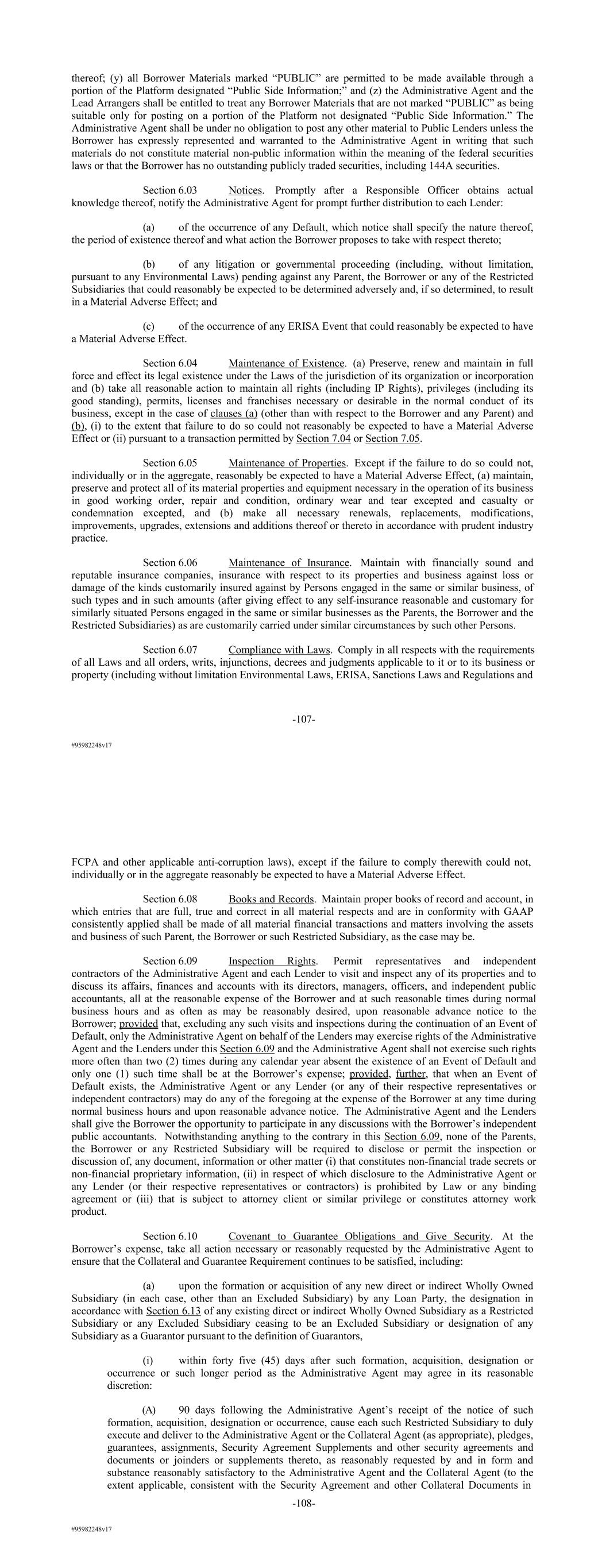 #95982248v17 thereof; (y) all Borrower Materials marked “PUBLIC” are permitted to be made available through a portion of the Platform designated “Public Side Information;” and (z) the Administrative Agent and the Lead Arrangers shall be entitled to treat any Borrower Materials that are not marked “PUBLIC” as being suitable only for posting on a portion of the Platform not designated “Public Side Information.” The Administrative Agent shall be under no obligation to post any other material to Public Lenders unless the Borrower has expressly represented and warranted to the Administrative Agent in writing that such materials do not constitute material non-public information within the meaning of the federal securities laws or that the Borrower has no outstanding publicly traded securities, including 144A securities. Section 6.03 Notices. Promptly after a Responsible Officer obtains actual knowledge thereof, notify the Administrative Agent for prompt further distribution to each Lender: (a) of the occurrence of any Default, which notice shall specify the nature thereof, the period of existence thereof and what action the Borrower proposes to take with respect thereto; (b) of any litigation or governmental proceeding (including, without limitation, pursuant to any Environmental Laws) pending against any Parent, the Borrower or any of the Restricted Subsidiaries that could reasonably be expected to be determined adversely and, if so determined, to result in a Material Adverse Effect; and (c) of the occurrence of any ERISA Event that could reasonably be expected to have a Material Adverse Effect. Section 6.04 Maintenance of Existence. (a) Preserve, renew and maintain in full force and effect its legal existence under the Laws of the jurisdiction of its organization or incorporation and (b) take all reasonable action to maintain all rights (including IP Rights), privileges (including its good standing), permits, licenses and franchises necessary or desirable in the normal conduct of its business, except in the case of clauses (a) (other than with respect to the Borrower and any Parent) and (b), (i) to the extent that failure to do so could not reasonably be expected to have a Material Adverse Effect or (ii) pursuant to a transaction permitted by Section 7.04 or Section 7.05. Section 6.05 Maintenance of Properties. Except if the failure to do so could not, individually or in the aggregate, reasonably be expected to have a Material Adverse Effect, (a) maintain, preserve and protect all of its material properties and equipment necessary in the operation of its business in good working order, repair and condition, ordinary wear and tear excepted and casualty or condemnation excepted, and (b) make all necessary renewals, replacements, modifications, improvements, upgrades, extensions and additions thereof or thereto in accordance with prudent industry practice. Section 6.06 Maintenance of Insurance. Maintain with financially sound and reputable insurance companies, insurance with respect to its properties and business against loss or damage of the kinds customarily insured against by Persons engaged in the same or similar business, of such types and in such amounts (after giving effect to any self-insurance reasonable and customary for similarly situated Persons engaged in the same or similar businesses as the Parents, the Borrower and the Restricted Subsidiaries) as are customarily carried under similar circumstances by such other Persons. Section 6.07 Compliance with Laws. Comply in all respects with the requirements of all Laws and all orders, writs, injunctions, decrees and judgments applicable to it or to its business or property (including without limitation Environmental Laws, ERISA, Sanctions Laws and Regulations and -107- #95982248v17 FCPA and other applicable anti-corruption laws), except if the failure to comply therewith could not, individually or in the aggregate reasonably be expected to have a Material Adverse Effect. Section 6.08 Books and Records. Maintain proper books of record and account, in which entries that are full, true and correct in all material respects and are in conformity with GAAP consistently applied shall be made of all material financial transactions and matters involving the assets and business of such Parent, the Borrower or such Restricted Subsidiary, as the case may be. Section 6.09 Inspection Rights. Permit representatives and independent contractors of the Administrative Agent and each Lender to visit and inspect any of its properties and to discuss its affairs, finances and accounts with its directors, managers, officers, and independent public accountants, all at the reasonable expense of the Borrower and at such reasonable times during normal business hours and as often as may be reasonably desired, upon reasonable advance notice to the Borrower; provided that, excluding any such visits and inspections during the continuation of an Event of Default, only the Administrative Agent on behalf of the Lenders may exercise rights of the Administrative Agent and the Lenders under this Section 6.09 and the Administrative Agent shall not exercise such rights more often than two (2) times during any calendar year absent the existence of an Event of Default and only one (1) such time shall be at the Borrower’s expense; provided, further, that when an Event of Default exists, the Administrative Agent or any Lender (or any of their respective representatives or independent contractors) may do any of the foregoing at the expense of the Borrower at any time during normal business hours and upon reasonable advance notice. The Administrative Agent and the Lenders shall give the Borrower the opportunity to participate in any discussions with the Borrower’s independent public accountants. Notwithstanding anything to the contrary in this Section 6.09, none of the Parents, the Borrower or any Restricted Subsidiary will be required to disclose or permit the i