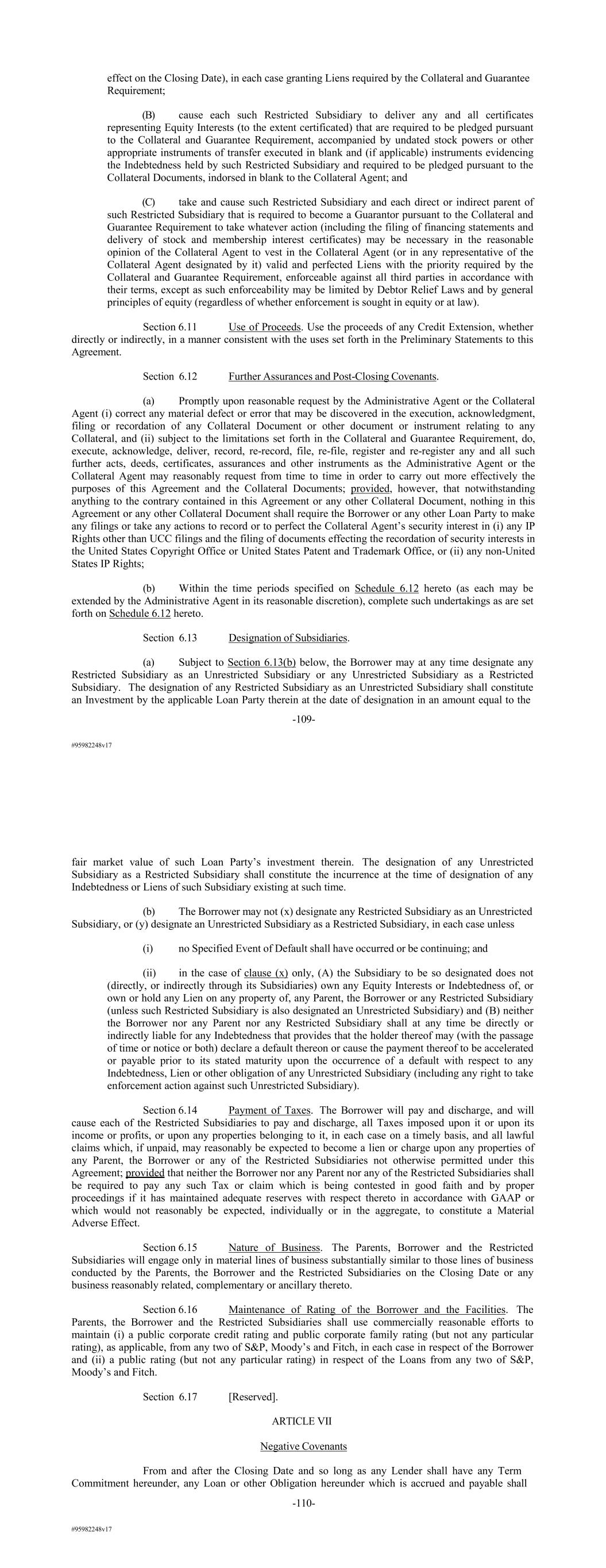 #95982248v17 effect on the Closing Date), in each case granting Liens required by the Collateral and Guarantee Requirement; (B) cause each such Restricted Subsidiary to deliver any and all certificates representing Equity Interests (to the extent certificated) that are required to be pledged pursuant to the Collateral and Guarantee Requirement, accompanied by undated stock powers or other appropriate instruments of transfer executed in blank and (if applicable) instruments evidencing the Indebtedness held by such Restricted Subsidiary and required to be pledged pursuant to the Collateral Documents, indorsed in blank to the Collateral Agent; and (C) take and cause such Restricted Subsidiary and each direct or indirect parent of such Restricted Subsidiary that is required to become a Guarantor pursuant to the Collateral and Guarantee Requirement to take whatever action (including the filing of financing statements and delivery of stock and membership interest certificates) may be necessary in the reasonable opinion of the Collateral Agent to vest in the Collateral Agent (or in any representative of the Collateral Agent designated by it) valid and perfected Liens with the priority required by the Collateral and Guarantee Requirement, enforceable against all third parties in accordance with their terms, except as such enforceability may be limited by Debtor Relief Laws and by general principles of equity (regardless of whether enforcement is sought in equity or at law). Section 6.11 Use of Proceeds. Use the proceeds of any Credit Extension, whether directly or indirectly, in a manner consistent with the uses set forth in the Preliminary Statements to this Agreement. Section 6.12 Further Assurances and Post-Closing Covenants. (a) Promptly upon reasonable request by the Administrative Agent or the Collateral Agent (i) correct any material defect or error that may be discovered in the execution, acknowledgment, filing or recordation of any Collateral Document or other document or instrument relating to any Collateral, and (ii) subject to the limitations set forth in the Collateral and Guarantee Requirement, do, execute, acknowledge, deliver, record, re-record, file, re-file, register and re-register any and all such further acts, deeds, certificates, assurances and other instruments as the Administrative Agent or the Collateral Agent may reasonably request from time to time in order to carry out more effectively the purposes of this Agreement and the Collateral Documents; provided, however, that notwithstanding anything to the contrary contained in this Agreement or any other Collateral Document, nothing in this Agreement or any other Collateral Document shall require the Borrower or any other Loan Party to make any filings or take any actions to record or to perfect the Collateral Agent’s security interest in (i) any IP Rights other than UCC filings and the filing of documents effecting the recordation of security interests in the United States Copyright Office or United States Patent and Trademark Office, or (ii) any non-United States IP Rights; (b) Within the time periods specified on Schedule 6.12 hereto (as each may be extended by the Administrative Agent in its reasonable discretion), complete such undertakings as are set forth on Schedule 6.12 hereto. Section 6.13 Designation of Subsidiaries. (a) Subject to Section 6.13(b) below, the Borrower may at any time designate any Restricted Subsidiary as an Unrestricted Subsidiary or any Unrestricted Subsidiary as a Restricted Subsidiary. The designation of any Restricted Subsidiary as an Unrestricted Subsidiary shall constitute an Investment by the applicable Loan Party therein at the date of designation in an amount equal to the -109- #95982248v17 fair market value of such Loan Party’s investment therein. The designation of any Unrestricted Subsidiary as a Restricted Subsidiary shall constitute the incurrence at the time of designation of any Indebtedness or Liens of such Subsidiary existing at such time. (b) The Borrower may not (x) designate any Restricted Subsidiary as an Unrestricted Subsidiary, or (y) designate an Unrestricted Subsidiary as a Restricted Subsidiary, in each case unless (i) no Specified Event of Default shall have occurred or be continuing; and (ii) in the case of clause (x) only, (A) the Subsidiary to be so designated does not (directly, or indirectly through its Subsidiaries) own any Equity Interests or Indebtedness of, or own or hold any Lien on any property of, any Parent, the Borrower or any Restricted Subsidiary (unless such Restricted Subsidiary is also designated an Unrestricted Subsidiary) and (B) neither the Borrower nor any Parent nor any Restricted Subsidiary shall at any time be directly or indirectly liable for any Indebtedness that provides that the holder thereof may (with the passage of time or notice or both) declare a default thereon or cause the payment thereof to be accelerated or payable prior to its stated maturity upon the occurrence of a default with respect to any Indebtedness, Lien or other obligation of any Unrestricted Subsidiary (including any right to take enforcement action against such Unrestricted Subsidiary). Section 6.14 Payment of Taxes. The Borrower will pay and discharge, and will cause each of the Restricted Subsidiaries to pay and discharge, all Taxes imposed upon it or upon its income or profits, or upon any properties belonging to it, in each case on a timely basis, and all lawful claims which, if unpaid, may reasonably be expected to become a lien or charge upon any properties of any Parent, the Borrower or any of the Restricted Subsidiaries not otherwise permitted under this Agreement; provided that neither the Borrower nor any Parent nor any of the Restricted Subsidiaries shall be required to pay any such Tax or claim which is being contested in good faith and by proper proceedings if it has maintained adequate reserves with respect thereto in accordance with GAAP or which w