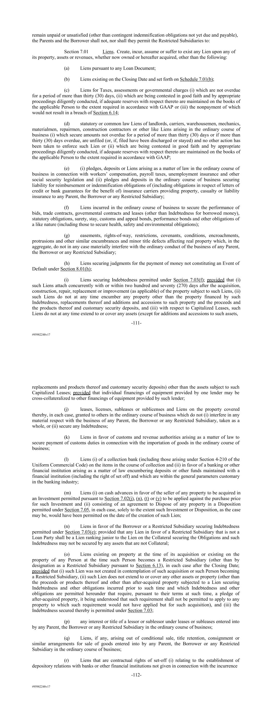 #95982248v17 remain unpaid or unsatisfied (other than contingent indemnification obligations not yet due and payable), the Parents and the Borrower shall not, nor shall they permit the Restricted Subsidiaries to: Section 7.01 Liens. Create, incur, assume or suffer to exist any Lien upon any of its property, assets or revenues, whether now owned or hereafter acquired, other than the following: (a) Liens pursuant to any Loan Document; (b) Liens existing on the Closing Date and set forth on Schedule 7.01(b); (c) Liens for Taxes, assessments or governmental charges (i) which are not overdue for a period of more than thirty (30) days, (ii) which are being contested in good faith and by appropriate proceedings diligently conducted, if adequate reserves with respect thereto are maintained on the books of the applicable Person to the extent required in accordance with GAAP or (iii) the nonpayment of which would not result in a breach of Section 6.14; (d) statutory or common law Liens of landlords, carriers, warehousemen, mechanics, materialmen, repairmen, construction contractors or other like Liens arising in the ordinary course of business (i) which secure amounts not overdue for a period of more than thirty (30) days or if more than thirty (30) days overdue, are unfiled (or, if, filed have been discharged or stayed) and no other action has been taken to enforce such Lien or (ii) which are being contested in good faith and by appropriate proceedings diligently conducted, if adequate reserves with respect thereto are maintained on the books of the applicable Person to the extent required in accordance with GAAP; (e) (i) pledges, deposits or Liens arising as a matter of law in the ordinary course of business in connection with workers’ compensation, payroll taxes, unemployment insurance and other social security legislation and (ii) pledges and deposits in the ordinary course of business securing liability for reimbursement or indemnification obligations of (including obligations in respect of letters of credit or bank guarantees for the benefit of) insurance carriers providing property, casualty or liability insurance to any Parent, the Borrower or any Restricted Subsidiary; (f) Liens incurred in the ordinary course of business to secure the performance of bids, trade contracts, governmental contracts and leases (other than Indebtedness for borrowed money), statutory obligations, surety, stay, customs and appeal bonds, performance bonds and other obligations of a like nature (including those to secure health, safety and environmental obligations); (g) easements, rights-of-way, restrictions, covenants, conditions, encroachments, protrusions and other similar encumbrances and minor title defects affecting real property which, in the aggregate, do not in any case materially interfere with the ordinary conduct of the business of any Parent, the Borrower or any Restricted Subsidiary; (h) Liens securing judgments for the payment of money not constituting an Event of Default under Section 8.01(h); (i) Liens securing Indebtedness permitted under Section 7.03(f); provided that (i) such Liens attach concurrently with or within two hundred and seventy (270) days after the acquisition, construction, repair, replacement or improvement (as applicable) of the property subject to such Liens, (ii) such Liens do not at any time encumber any property other than the property financed by such Indebtedness, replacements thereof and additions and accessions to such property and the proceeds and the products thereof and customary security deposits, and (iii) with respect to Capitalized Leases, such Liens do not at any time extend to or cover any assets (except for additions and accessions to such assets, -111- #95982248v17 replacements and products thereof and customary security deposits) other than the assets subject to such Capitalized Leases; provided that individual financings of equipment provided by one lender may be cross-collateralized to other financings of equipment provided by such lender; (j) leases, licenses, subleases or sublicenses and Liens on the property covered thereby, in each case, granted to others in the ordinary course of business which do not (i) interfere in any material respect with the business of any Parent, the Borrower or any Restricted Subsidiary, taken as a whole, or (ii) secure any Indebtedness; (k) Liens in favor of customs and revenue authorities arising as a matter of law to secure payment of customs duties in connection with the importation of goods in the ordinary course of business; (l) Liens (i) of a collection bank (including those arising under Section 4-210 of the Uniform Commercial Code) on the items in the course of collection and (ii) in favor of a banking or other financial institution arising as a matter of law encumbering deposits or other funds maintained with a financial institution (including the right of set off) and which are within the general parameters customary in the banking industry; (m) Liens (i) on cash advances in favor of the seller of any property to be acquired in an Investment permitted pursuant to Section 7.02(j), (n), (t) or (y) to be applied against the purchase price for such Investment and (ii) consisting of an agreement to Dispose of any property in a Disposition permitted under Section 7.05, in each case, solely to the extent such Investment or Disposition, as the case may be, would have been permitted on the date of the creation of such Lien; (n) Liens in favor of the Borrower or a Restricted Subsidiary securing Indebtedness permitted under Section 7.03(e); provided that any Lien in favor of a Restricted Subsidiary that is not a Loan Party shall be a Lien ranking junior to the Lien on the Collateral securing the Obligations and such Indebtedness may not be secured by any assets that are not Collateral; (o) Liens existing on property at the time of its acquisition or existing on the property of any Person at the time such Person becomes a Res