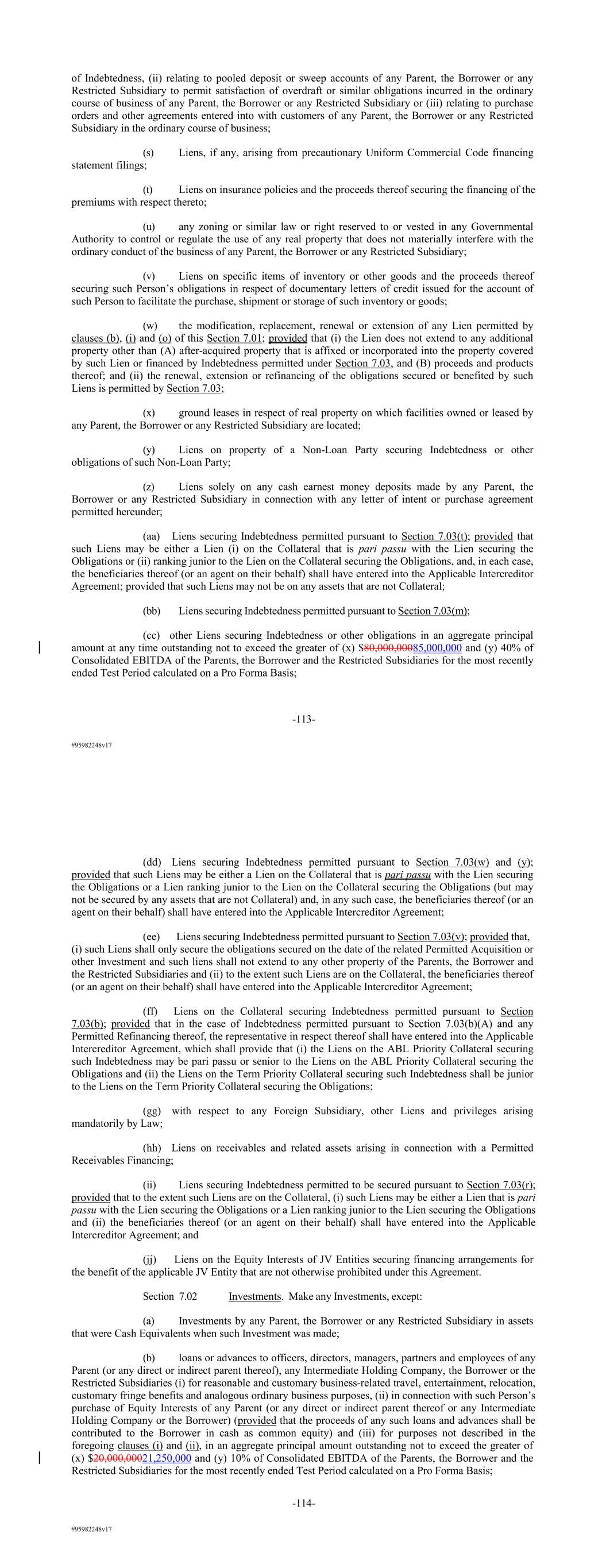 #95982248v17 of Indebtedness, (ii) relating to pooled deposit or sweep accounts of any Parent, the Borrower or any Restricted Subsidiary to permit satisfaction of overdraft or similar obligations incurred in the ordinary course of business of any Parent, the Borrower or any Restricted Subsidiary or (iii) relating to purchase orders and other agreements entered into with customers of any Parent, the Borrower or any Restricted Subsidiary in the ordinary course of business; (s) Liens, if any, arising from precautionary Uniform Commercial Code financing statement filings; (t) Liens on insurance policies and the proceeds thereof securing the financing of the premiums with respect thereto; (u) any zoning or similar law or right reserved to or vested in any Governmental Authority to control or regulate the use of any real property that does not materially interfere with the ordinary conduct of the business of any Parent, the Borrower or any Restricted Subsidiary; (v) Liens on specific items of inventory or other goods and the proceeds thereof securing such Person’s obligations in respect of documentary letters of credit issued for the account of such Person to facilitate the purchase, shipment or storage of such inventory or goods; (w) the modification, replacement, renewal or extension of any Lien permitted by clauses (b), (i) and (o) of this Section 7.01; provided that (i) the Lien does not extend to any additional property other than (A) after-acquired property that is affixed or incorporated into the property covered by such Lien or financed by Indebtedness permitted under Section 7.03, and (B) proceeds and products thereof; and (ii) the renewal, extension or refinancing of the obligations secured or benefited by such Liens is permitted by Section 7.03; (x) ground leases in respect of real property on which facilities owned or leased by any Parent, the Borrower or any Restricted Subsidiary are located; (y) Liens on property of a Non-Loan Party securing Indebtedness or other obligations of such Non-Loan Party; (z) Liens solely on any cash earnest money deposits made by any Parent, the Borrower or any Restricted Subsidiary in connection with any letter of intent or purchase agreement permitted hereunder; (aa) Liens securing Indebtedness permitted pursuant to Section 7.03(t); provided that such Liens may be either a Lien (i) on the Collateral that is pari passu with the Lien securing the Obligations or (ii) ranking junior to the Lien on the Collateral securing the Obligations, and, in each case, the beneficiaries thereof (or an agent on their behalf) shall have entered into the Applicable Intercreditor Agreement; provided that such Liens may not be on any assets that are not Collateral; (bb) Liens securing Indebtedness permitted pursuant to Section 7.03(m); (cc) other Liens securing Indebtedness or other obligations in an aggregate principal amount at any time outstanding not to exceed the greater of (x) $80,000,00085,000,000 and (y) 40% of Consolidated EBITDA of the Parents, the Borrower and the Restricted Subsidiaries for the most recently ended Test Period calculated on a Pro Forma Basis; -113- #95982248v17 (dd) Liens securing Indebtedness permitted pursuant to Section 7.03(w) and (y); provided that such Liens may be either a Lien on the Collateral that is pari passu with the Lien securing the Obligations or a Lien ranking junior to the Lien on the Collateral securing the Obligations (but may not be secured by any assets that are not Collateral) and, in any such case, the beneficiaries thereof (or an agent on their behalf) shall have entered into the Applicable Intercreditor Agreement; (ee) Liens securing Indebtedness permitted pursuant to Section 7.03(v); provided that, (i) such Liens shall only secure the obligations secured on the date of the related Permitted Acquisition or other Investment and such liens shall not extend to any other property of the Parents, the Borrower and the Restricted Subsidiaries and (ii) to the extent such Liens are on the Collateral, the beneficiaries thereof (or an agent on their behalf) shall have entered into the Applicable Intercreditor Agreement; (ff) Liens on the Collateral securing Indebtedness permitted pursuant to Section 7.03(b); provided that in the case of Indebtedness permitted pursuant to Section 7.03(b)(A) and any Permitted Refinancing thereof, the representative in respect thereof shall have entered into the Applicable Intercreditor Agreement, which shall provide that (i) the Liens on the ABL Priority Collateral securing such Indebtedness may be pari passu or senior to the Liens on the ABL Priority Collateral securing the Obligations and (ii) the Liens on the Term Priority Collateral securing such Indebtedness shall be junior to the Liens on the Term Priority Collateral securing the Obligations; (gg) with respect to any Foreign Subsidiary, other Liens and privileges arising mandatorily by Law; (hh) Liens on receivables and related assets arising in connection with a Permitted Receivables Financing; (ii) Liens securing Indebtedness permitted to be secured pursuant to Section 7.03(r); provided that to the extent such Liens are on the Collateral, (i) such Liens may be either a Lien that is pari passu with the Lien securing the Obligations or a Lien ranking junior to the Lien securing the Obligations and (ii) the beneficiaries thereof (or an agent on their behalf) shall have entered into the Applicable Intercreditor Agreement; and (jj) Liens on the Equity Interests of JV Entities securing financing arrangements for the benefit of the applicable JV Entity that are not otherwise prohibited under this Agreement. Section 7.02 Investments. Make any Investments, except: (a) Investments by any Parent, the Borrower or any Restricted Subsidiary in assets that were Cash Equivalents when such Investment was made; (b) loans or advances to officers, directors, managers, partners and employees of any Parent (or any direct or indirect parent thereof), any Interm