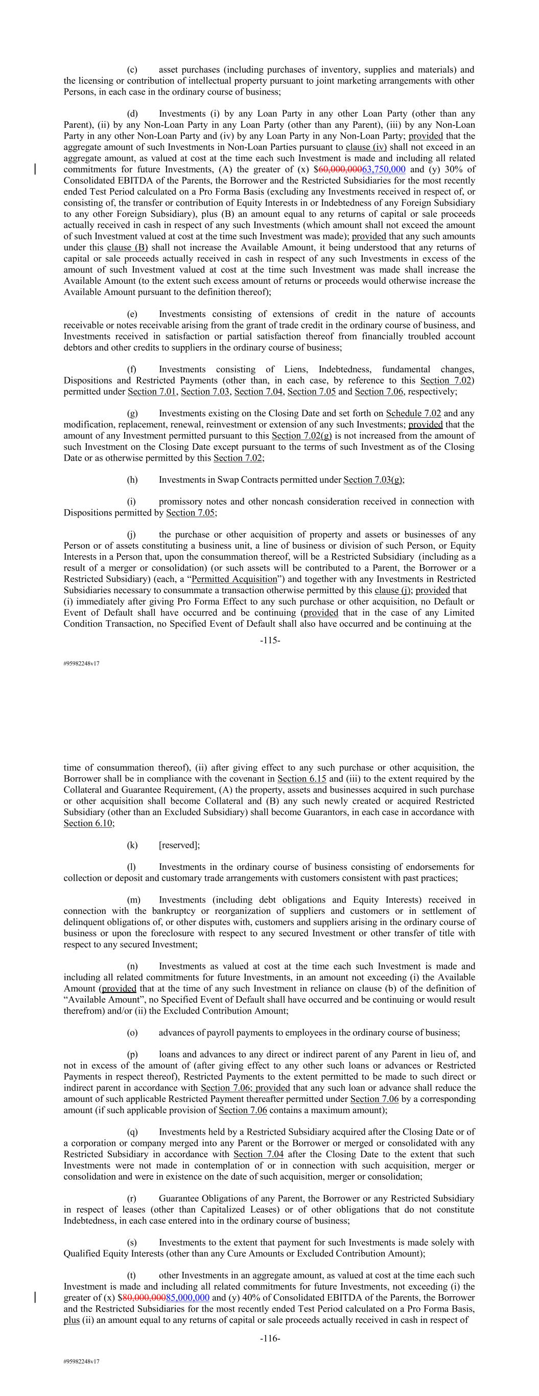 #95982248v17 (c) asset purchases (including purchases of inventory, supplies and materials) and the licensing or contribution of intellectual property pursuant to joint marketing arrangements with other Persons, in each case in the ordinary course of business; (d) Investments (i) by any Loan Party in any other Loan Party (other than any Parent), (ii) by any Non-Loan Party in any Loan Party (other than any Parent), (iii) by any Non-Loan Party in any other Non-Loan Party and (iv) by any Loan Party in any Non-Loan Party; provided that the aggregate amount of such Investments in Non-Loan Parties pursuant to clause (iv) shall not exceed in an aggregate amount, as valued at cost at the time each such Investment is made and including all related commitments for future Investments, (A) the greater of (x) $60,000,00063,750,000 and (y) 30% of Consolidated EBITDA of the Parents, the Borrower and the Restricted Subsidiaries for the most recently ended Test Period calculated on a Pro Forma Basis (excluding any Investments received in respect of, or consisting of, the transfer or contribution of Equity Interests in or Indebtedness of any Foreign Subsidiary to any other Foreign Subsidiary), plus (B) an amount equal to any returns of capital or sale proceeds actually received in cash in respect of any such Investments (which amount shall not exceed the amount of such Investment valued at cost at the time such Investment was made); provided that any such amounts under this clause (B) shall not increase the Available Amount, it being understood that any returns of capital or sale proceeds actually received in cash in respect of any such Investments in excess of the amount of such Investment valued at cost at the time such Investment was made shall increase the Available Amount (to the extent such excess amount of returns or proceeds would otherwise increase the Available Amount pursuant to the definition thereof); (e) Investments consisting of extensions of credit in the nature of accounts receivable or notes receivable arising from the grant of trade credit in the ordinary course of business, and Investments received in satisfaction or partial satisfaction thereof from financially troubled account debtors and other credits to suppliers in the ordinary course of business; (f) Investments consisting of Liens, Indebtedness, fundamental changes, Dispositions and Restricted Payments (other than, in each case, by reference to this Section 7.02) permitted under Section 7.01, Section 7.03, Section 7.04, Section 7.05 and Section 7.06, respectively; (g) Investments existing on the Closing Date and set forth on Schedule 7.02 and any modification, replacement, renewal, reinvestment or extension of any such Investments; provided that the amount of any Investment permitted pursuant to this Section 7.02(g) is not increased from the amount of such Investment on the Closing Date except pursuant to the terms of such Investment as of the Closing Date or as otherwise permitted by this Section 7.02; (h) Investments in Swap Contracts permitted under Section 7.03(g); (i) promissory notes and other noncash consideration received in connection with Dispositions permitted by Section 7.05; (j) the purchase or other acquisition of property and assets or businesses of any Person or of assets constituting a business unit, a line of business or division of such Person, or Equity Interests in a Person that, upon the consummation thereof, will be a Restricted Subsidiary (including as a result of a merger or consolidation) (or such assets will be contributed to a Parent, the Borrower or a Restricted Subsidiary) (each, a “Permitted Acquisition”) and together with any Investments in Restricted Subsidiaries necessary to consummate a transaction otherwise permitted by this clause (j); provided that (i) immediately after giving Pro Forma Effect to any such purchase or other acquisition, no Default or Event of Default shall have occurred and be continuing (provided that in the case of any Limited Condition Transaction, no Specified Event of Default shall also have occurred and be continuing at the -115- #95982248v17 time of consummation thereof), (ii) after giving effect to any such purchase or other acquisition, the Borrower shall be in compliance with the covenant in Section 6.15 and (iii) to the extent required by the Collateral and Guarantee Requirement, (A) the property, assets and businesses acquired in such purchase or other acquisition shall become Collateral and (B) any such newly created or acquired Restricted Subsidiary (other than an Excluded Subsidiary) shall become Guarantors, in each case in accordance with Section 6.10; (k) [reserved]; (l) Investments in the ordinary course of business consisting of endorsements for collection or deposit and customary trade arrangements with customers consistent with past practices; (m) Investments (including debt obligations and Equity Interests) received in connection with the bankruptcy or reorganization of suppliers and customers or in settlement of delinquent obligations of, or other disputes with, customers and suppliers arising in the ordinary course of business or upon the foreclosure with respect to any secured Investment or other transfer of title with respect to any secured Investment; (n) Investments as valued at cost at the time each such Investment is made and including all related commitments for future Investments, in an amount not exceeding (i) the Available Amount (provided that at the time of any such Investment in reliance on clause (b) of the definition of “Available Amount”, no Specified Event of Default shall have occurred and be continuing or would result therefrom) and/or (ii) the Excluded Contribution Amount; (o) advances of payroll payments to employees in the ordinary course of business; (p) loans and advances to any direct or indirect parent of any Parent in lieu of, and not in excess of the amount of (after giving effect to any other such loans or advances 
