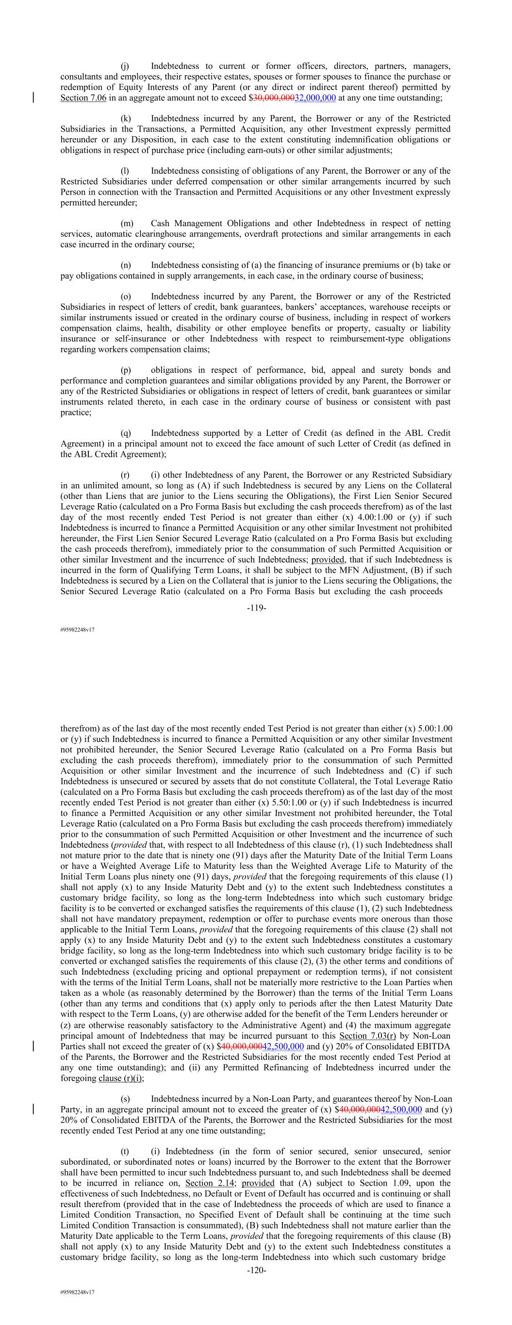 #95982248v17 (j) Indebtedness to current or former officers, directors, partners, managers, consultants and employees, their respective estates, spouses or former spouses to finance the purchase or redemption of Equity Interests of any Parent (or any direct or indirect parent thereof) permitted by Section 7.06 in an aggregate amount not to exceed $30,000,00032,000,000 at any one time outstanding; (k) Indebtedness incurred by any Parent, the Borrower or any of the Restricted Subsidiaries in the Transactions, a Permitted Acquisition, any other Investment expressly permitted hereunder or any Disposition, in each case to the extent constituting indemnification obligations or obligations in respect of purchase price (including earn-outs) or other similar adjustments; (l) Indebtedness consisting of obligations of any Parent, the Borrower or any of the Restricted Subsidiaries under deferred compensation or other similar arrangements incurred by such Person in connection with the Transaction and Permitted Acquisitions or any other Investment expressly permitted hereunder; (m) Cash Management Obligations and other Indebtedness in respect of netting services, automatic clearinghouse arrangements, overdraft protections and similar arrangements in each case incurred in the ordinary course; (n) Indebtedness consisting of (a) the financing of insurance premiums or (b) take or pay obligations contained in supply arrangements, in each case, in the ordinary course of business; (o) Indebtedness incurred by any Parent, the Borrower or any of the Restricted Subsidiaries in respect of letters of credit, bank guarantees, bankers’ acceptances, warehouse receipts or similar instruments issued or created in the ordinary course of business, including in respect of workers compensation claims, health, disability or other employee benefits or property, casualty or liability insurance or self-insurance or other Indebtedness with respect to reimbursement-type obligations regarding workers compensation claims; (p) obligations in respect of performance, bid, appeal and surety bonds and performance and completion guarantees and similar obligations provided by any Parent, the Borrower or any of the Restricted Subsidiaries or obligations in respect of letters of credit, bank guarantees or similar instruments related thereto, in each case in the ordinary course of business or consistent with past practice; (q) Indebtedness supported by a Letter of Credit (as defined in the ABL Credit Agreement) in a principal amount not to exceed the face amount of such Letter of Credit (as defined in the ABL Credit Agreement); (r) (i) other Indebtedness of any Parent, the Borrower or any Restricted Subsidiary in an unlimited amount, so long as (A) if such Indebtedness is secured by any Liens on the Collateral (other than Liens that are junior to the Liens securing the Obligations), the First Lien Senior Secured Leverage Ratio (calculated on a Pro Forma Basis but excluding the cash proceeds therefrom) as of the last day of the most recently ended Test Period is not greater than either (x) 4.00:1.00 or (y) if such Indebtedness is incurred to finance a Permitted Acquisition or any other similar Investment not prohibited hereunder, the First Lien Senior Secured Leverage Ratio (calculated on a Pro Forma Basis but excluding the cash proceeds therefrom), immediately prior to the consummation of such Permitted Acquisition or other similar Investment and the incurrence of such Indebtedness; provided, that if such Indebtedness is incurred in the form of Qualifying Term Loans, it shall be subject to the MFN Adjustment, (B) if such Indebtedness is secured by a Lien on the Collateral that is junior to the Liens securing the Obligations, the Senior Secured Leverage Ratio (calculated on a Pro Forma Basis but excluding the cash proceeds -119- #95982248v17 therefrom) as of the last day of the most recently ended Test Period is not greater than either (x) 5.00:1.00 or (y) if such Indebtedness is incurred to finance a Permitted Acquisition or any other similar Investment not prohibited hereunder, the Senior Secured Leverage Ratio (calculated on a Pro Forma Basis but excluding the cash proceeds therefrom), immediately prior to the consummation of such Permitted Acquisition or other similar Investment and the incurrence of such Indebtedness and (C) if such Indebtedness is unsecured or secured by assets that do not constitute Collateral, the Total Leverage Ratio (calculated on a Pro Forma Basis but excluding the cash proceeds therefrom) as of the last day of the most recently ended Test Period is not greater than either (x) 5.50:1.00 or (y) if such Indebtedness is incurred to finance a Permitted Acquisition or any other similar Investment not prohibited hereunder, the Total Leverage Ratio (calculated on a Pro Forma Basis but excluding the cash proceeds therefrom) immediately prior to the consummation of such Permitted Acquisition or other Investment and the incurrence of such Indebtedness (provided that, with respect to all Indebtedness of this clause (r), (1) such Indebtedness shall not mature prior to the date that is ninety one (91) days after the Maturity Date of the Initial Term Loans or have a Weighted Average Life to Maturity less than the Weighted Average Life to Maturity of the Initial Term Loans plus ninety one (91) days, provided that the foregoing requirements of this clause (1) shall not apply (x) to any Inside Maturity Debt and (y) to the extent such Indebtedness constitutes a customary bridge facility, so long as the long-term Indebtedness into which such customary bridge facility is to be converted or exchanged satisfies the requirements of this clause (1), (2) such Indebtedness shall not have mandatory prepayment, redemption or offer to purchase events more onerous than those applicable to the Initial Term Loans, provided that the foregoing requirements of this clause (2) shall not apply (x) to any Inside Maturity Debt and (y) to the extent 