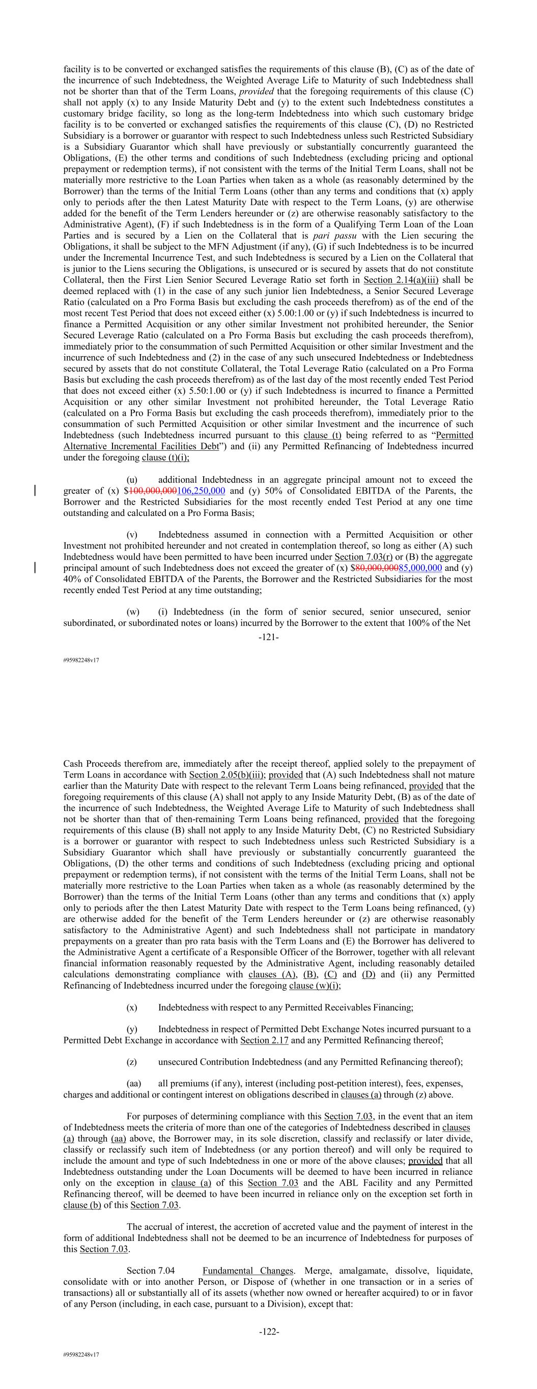 #95982248v17 facility is to be converted or exchanged satisfies the requirements of this clause (B), (C) as of the date of the incurrence of such Indebtedness, the Weighted Average Life to Maturity of such Indebtedness shall not be shorter than that of the Term Loans, provided that the foregoing requirements of this clause (C) shall not apply (x) to any Inside Maturity Debt and (y) to the extent such Indebtedness constitutes a customary bridge facility, so long as the long-term Indebtedness into which such customary bridge facility is to be converted or exchanged satisfies the requirements of this clause (C), (D) no Restricted Subsidiary is a borrower or guarantor with respect to such Indebtedness unless such Restricted Subsidiary is a Subsidiary Guarantor which shall have previously or substantially concurrently guaranteed the Obligations, (E) the other terms and conditions of such Indebtedness (excluding pricing and optional prepayment or redemption terms), if not consistent with the terms of the Initial Term Loans, shall not be materially more restrictive to the Loan Parties when taken as a whole (as reasonably determined by the Borrower) than the terms of the Initial Term Loans (other than any terms and conditions that (x) apply only to periods after the then Latest Maturity Date with respect to the Term Loans, (y) are otherwise added for the benefit of the Term Lenders hereunder or (z) are otherwise reasonably satisfactory to the Administrative Agent), (F) if such Indebtedness is in the form of a Qualifying Term Loan of the Loan Parties and is secured by a Lien on the Collateral that is pari passu with the Lien securing the Obligations, it shall be subject to the MFN Adjustment (if any), (G) if such Indebtedness is to be incurred under the Incremental Incurrence Test, and such Indebtedness is secured by a Lien on the Collateral that is junior to the Liens securing the Obligations, is unsecured or is secured by assets that do not constitute Collateral, then the First Lien Senior Secured Leverage Ratio set forth in Section 2.14(a)(iii) shall be deemed replaced with (1) in the case of any such junior lien Indebtedness, a Senior Secured Leverage Ratio (calculated on a Pro Forma Basis but excluding the cash proceeds therefrom) as of the end of the most recent Test Period that does not exceed either (x) 5.00:1.00 or (y) if such Indebtedness is incurred to finance a Permitted Acquisition or any other similar Investment not prohibited hereunder, the Senior Secured Leverage Ratio (calculated on a Pro Forma Basis but excluding the cash proceeds therefrom), immediately prior to the consummation of such Permitted Acquisition or other similar Investment and the incurrence of such Indebtedness and (2) in the case of any such unsecured Indebtedness or Indebtedness secured by assets that do not constitute Collateral, the Total Leverage Ratio (calculated on a Pro Forma Basis but excluding the cash proceeds therefrom) as of the last day of the most recently ended Test Period that does not exceed either (x) 5.50:1.00 or (y) if such Indebtedness is incurred to finance a Permitted Acquisition or any other similar Investment not prohibited hereunder, the Total Leverage Ratio (calculated on a Pro Forma Basis but excluding the cash proceeds therefrom), immediately prior to the consummation of such Permitted Acquisition or other similar Investment and the incurrence of such Indebtedness (such Indebtedness incurred pursuant to this clause (t) being referred to as “Permitted Alternative Incremental Facilities Debt”) and (ii) any Permitted Refinancing of Indebtedness incurred under the foregoing clause (t)(i); (u) additional Indebtedness in an aggregate principal amount not to exceed the greater of (x) $100,000,000106,250,000 and (y) 50% of Consolidated EBITDA of the Parents, the Borrower and the Restricted Subsidiaries for the most recently ended Test Period at any one time outstanding and calculated on a Pro Forma Basis; (v) Indebtedness assumed in connection with a Permitted Acquisition or other Investment not prohibited hereunder and not created in contemplation thereof, so long as either (A) such Indebtedness would have been permitted to have been incurred under Section 7.03(r) or (B) the aggregate principal amount of such Indebtedness does not exceed the greater of (x) $80,000,00085,000,000 and (y) 40% of Consolidated EBITDA of the Parents, the Borrower and the Restricted Subsidiaries for the most recently ended Test Period at any time outstanding; (w) (i) Indebtedness (in the form of senior secured, senior unsecured, senior subordinated, or subordinated notes or loans) incurred by the Borrower to the extent that 100% of the Net -121- #95982248v17 Cash Proceeds therefrom are, immediately after the receipt thereof, applied solely to the prepayment of Term Loans in accordance with Section 2.05(b)(iii); provided that (A) such Indebtedness shall not mature earlier than the Maturity Date with respect to the relevant Term Loans being refinanced, provided that the foregoing requirements of this clause (A) shall not apply to any Inside Maturity Debt, (B) as of the date of the incurrence of such Indebtedness, the Weighted Average Life to Maturity of such Indebtedness shall not be shorter than that of then-remaining Term Loans being refinanced, provided that the foregoing requirements of this clause (B) shall not apply to any Inside Maturity Debt, (C) no Restricted Subsidiary is a borrower or guarantor with respect to such Indebtedness unless such Restricted Subsidiary is a Subsidiary Guarantor which shall have previously or substantially concurrently guaranteed the Obligations, (D) the other terms and conditions of such Indebtedness (excluding pricing and optional prepayment or redemption terms), if not consistent with the terms of the Initial Term Loans, shall not be materially more restrictive to the Loan Parties when taken as a whole (as reasonably determined by the Borrower) than the terms of the Initial 