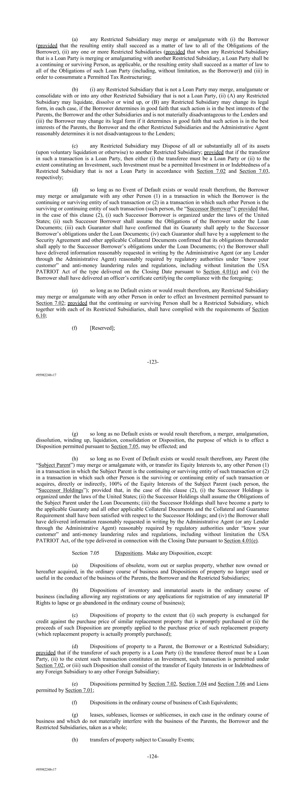 #95982248v17 (a) any Restricted Subsidiary may merge or amalgamate with (i) the Borrower (provided that the resulting entity shall succeed as a matter of law to all of the Obligations of the Borrower), (ii) any one or more Restricted Subsidiaries (provided that when any Restricted Subsidiary that is a Loan Party is merging or amalgamating with another Restricted Subsidiary, a Loan Party shall be a continuing or surviving Person, as applicable, or the resulting entity shall succeed as a matter of law to all of the Obligations of such Loan Party (including, without limitation, as the Borrower)) and (iii) in order to consummate a Permitted Tax Restructuring; (b) (i) any Restricted Subsidiary that is not a Loan Party may merge, amalgamate or consolidate with or into any other Restricted Subsidiary that is not a Loan Party, (ii) (A) any Restricted Subsidiary may liquidate, dissolve or wind up, or (B) any Restricted Subsidiary may change its legal form, in each case, if the Borrower determines in good faith that such action is in the best interests of the Parents, the Borrower and the other Subsidiaries and is not materially disadvantageous to the Lenders and (iii) the Borrower may change its legal form if it determines in good faith that such action is in the best interests of the Parents, the Borrower and the other Restricted Subsidiaries and the Administrative Agent reasonably determines it is not disadvantageous to the Lenders; (c) any Restricted Subsidiary may Dispose of all or substantially all of its assets (upon voluntary liquidation or otherwise) to another Restricted Subsidiary; provided that if the transferor in such a transaction is a Loan Party, then either (i) the transferee must be a Loan Party or (ii) to the extent constituting an Investment, such Investment must be a permitted Investment in or Indebtedness of a Restricted Subsidiary that is not a Loan Party in accordance with Section 7.02 and Section 7.03, respectively; (d) so long as no Event of Default exists or would result therefrom, the Borrower may merge or amalgamate with any other Person (1) in a transaction in which the Borrower is the continuing or surviving entity of such transaction or (2) in a transaction in which such other Person is the surviving or continuing entity of such transaction (such person, the “Successor Borrower”); provided that, in the case of this clause (2), (i) such Successor Borrower is organized under the laws of the United States; (ii) such Successor Borrower shall assume the Obligations of the Borrower under the Loan Documents; (iii) each Guarantor shall have confirmed that its Guaranty shall apply to the Successor Borrower’s obligations under the Loan Documents; (iv) each Guarantor shall have by a supplement to the Security Agreement and other applicable Collateral Documents confirmed that its obligations thereunder shall apply to the Successor Borrower’s obligations under the Loan Documents; (v) the Borrower shall have delivered information reasonably requested in writing by the Administrative Agent (or any Lender through the Administrative Agent) reasonably required by regulatory authorities under “know your customer” and anti-money laundering rules and regulations, including without limitation the USA PATRIOT Act of the type delivered on the Closing Date pursuant to Section 4.01(e) and (vi) the Borrower shall have delivered an officer’s certificate certifying the compliance with the foregoing; (e) so long as no Default exists or would result therefrom, any Restricted Subsidiary may merge or amalgamate with any other Person in order to effect an Investment permitted pursuant to Section 7.02; provided that the continuing or surviving Person shall be a Restricted Subsidiary, which together with each of its Restricted Subsidiaries, shall have complied with the requirements of Section 6.10; (f) [Reserved]; -123- #95982248v17 (g) so long as no Default exists or would result therefrom, a merger, amalgamation, dissolution, winding up, liquidation, consolidation or Disposition, the purpose of which is to effect a Disposition permitted pursuant to Section 7.05, may be effected; and (h) so long as no Event of Default exists or would result therefrom, any Parent (the “Subject Parent”) may merge or amalgamate with, or transfer its Equity Interests to, any other Person (1) in a transaction in which the Subject Parent is the continuing or surviving entity of such transaction or (2) in a transaction in which such other Person is the surviving or continuing entity of such transaction or acquires, directly or indirectly, 100% of the Equity Interests of the Subject Parent (such person, the “Successor Holdings”); provided that, in the case of this clause (2), (i) the Successor Holdings is organized under the laws of the United States; (ii) the Successor Holdings shall assume the Obligations of the Subject Parent under the Loan Documents; (iii) the Successor Holdings shall have become a party to the applicable Guaranty and all other applicable Collateral Documents and the Collateral and Guarantee Requirement shall have been satisfied with respect to the Successor Holdings; and (iv) the Borrower shall have delivered information reasonably requested in writing by the Administrative Agent (or any Lender through the Administrative Agent) reasonably required by regulatory authorities under “know your customer” and anti-money laundering rules and regulations, including without limitation the USA PATRIOT Act, of the type delivered in connection with the Closing Date pursuant to Section 4.01(e). Section 7.05 Dispositions. Make any Disposition, except: (a) Dispositions of obsolete, worn out or surplus property, whether now owned or hereafter acquired, in the ordinary course of business and Dispositions of property no longer used or useful in the conduct of the business of the Parents, the Borrower and the Restricted Subsidiaries; (b) Dispositions of inventory and immaterial assets in the ordi