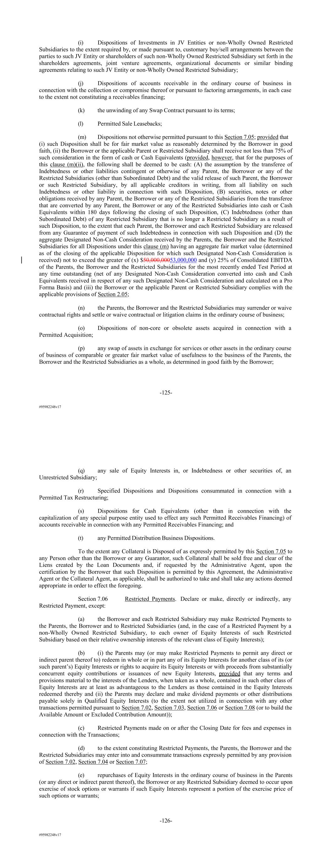 #95982248v17 (i) Dispositions of Investments in JV Entities or non-Wholly Owned Restricted Subsidiaries to the extent required by, or made pursuant to, customary buy/sell arrangements between the parties to such JV Entity or shareholders of such non-Wholly Owned Restricted Subsidiary set forth in the shareholders agreements, joint venture agreements, organizational documents or similar binding agreements relating to such JV Entity or non-Wholly Owned Restricted Subsidiary; (j) Dispositions of accounts receivable in the ordinary course of business in connection with the collection or compromise thereof or pursuant to factoring arrangements, in each case to the extent not constituting a receivables financing; (k) the unwinding of any Swap Contract pursuant to its terms; (l) Permitted Sale Leasebacks; (m) Dispositions not otherwise permitted pursuant to this Section 7.05; provided that (i) such Disposition shall be for fair market value as reasonably determined by the Borrower in good faith, (ii) the Borrower or the applicable Parent or Restricted Subsidiary shall receive not less than 75% of such consideration in the form of cash or Cash Equivalents (provided, however, that for the purposes of this clause (m)(ii), the following shall be deemed to be cash: (A) the assumption by the transferee of Indebtedness or other liabilities contingent or otherwise of any Parent, the Borrower or any of the Restricted Subsidiaries (other than Subordinated Debt) and the valid release of such Parent, the Borrower or such Restricted Subsidiary, by all applicable creditors in writing, from all liability on such Indebtedness or other liability in connection with such Disposition, (B) securities, notes or other obligations received by any Parent, the Borrower or any of the Restricted Subsidiaries from the transferee that are converted by any Parent, the Borrower or any of the Restricted Subsidiaries into cash or Cash Equivalents within 180 days following the closing of such Disposition, (C) Indebtedness (other than Subordinated Debt) of any Restricted Subsidiary that is no longer a Restricted Subsidiary as a result of such Disposition, to the extent that each Parent, the Borrower and each Restricted Subsidiary are released from any Guarantee of payment of such Indebtedness in connection with such Disposition and (D) the aggregate Designated Non-Cash Consideration received by the Parents, the Borrower and the Restricted Subsidiaries for all Dispositions under this clause (m) having an aggregate fair market value (determined as of the closing of the applicable Disposition for which such Designated Non-Cash Consideration is received) not to exceed the greater of (x) $50,000,00053,000,000 and (y) 25% of Consolidated EBITDA of the Parents, the Borrower and the Restricted Subsidiaries for the most recently ended Test Period at any time outstanding (net of any Designated Non-Cash Consideration converted into cash and Cash Equivalents received in respect of any such Designated Non-Cash Consideration and calculated on a Pro Forma Basis) and (iii) the Borrower or the applicable Parent or Restricted Subsidiary complies with the applicable provisions of Section 2.05; (n) the Parents, the Borrower and the Restricted Subsidiaries may surrender or waive contractual rights and settle or waive contractual or litigation claims in the ordinary course of business; (o) Dispositions of non-core or obsolete assets acquired in connection with a Permitted Acquisition; (p) any swap of assets in exchange for services or other assets in the ordinary course of business of comparable or greater fair market value of usefulness to the business of the Parents, the Borrower and the Restricted Subsidiaries as a whole, as determined in good faith by the Borrower; -125- #95982248v17 (q) any sale of Equity Interests in, or Indebtedness or other securities of, an Unrestricted Subsidiary; (r) Specified Dispositions and Dispositions consummated in connection with a Permitted Tax Restructuring; (s) Dispositions for Cash Equivalents (other than in connection with the capitalization of any special purpose entity used to effect any such Permitted Receivables Financing) of accounts receivable in connection with any Permitted Receivables Financing; and (t) any Permitted Distribution Business Dispositions. To the extent any Collateral is Disposed of as expressly permitted by this Section 7.05 to any Person other than the Borrower or any Guarantor, such Collateral shall be sold free and clear of the Liens created by the Loan Documents and, if requested by the Administrative Agent, upon the certification by the Borrower that such Disposition is permitted by this Agreement, the Administrative Agent or the Collateral Agent, as applicable, shall be authorized to take and shall take any actions deemed appropriate in order to effect the foregoing. Section 7.06 Restricted Payments. Declare or make, directly or indirectly, any Restricted Payment, except: (a) the Borrower and each Restricted Subsidiary may make Restricted Payments to the Parents, the Borrower and to Restricted Subsidiaries (and, in the case of a Restricted Payment by a non-Wholly Owned Restricted Subsidiary, to each owner of Equity Interests of such Restricted Subsidiary based on their relative ownership interests of the relevant class of Equity Interests); (b) (i) the Parents may (or may make Restricted Payments to permit any direct or indirect parent thereof to) redeem in whole or in part any of its Equity Interests for another class of its (or such parent’s) Equity Interests or rights to acquire its Equity Interests or with proceeds from substantially concurrent equity contributions or issuances of new Equity Interests, provided that any terms and provisions material to the interests of the Lenders, when taken as a whole, contained in such other class of Equity Interests are at least as advantageous to the Lenders as those contained in the Equity Interests redeemed thereby and (ii) the Parents m