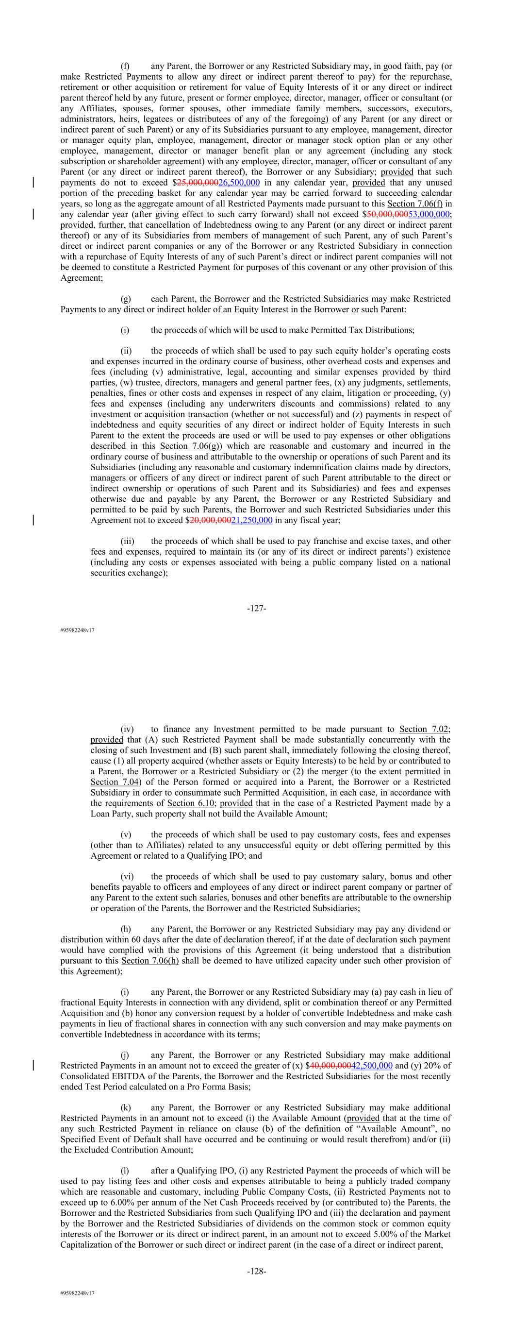 #95982248v17 (f) any Parent, the Borrower or any Restricted Subsidiary may, in good faith, pay (or make Restricted Payments to allow any direct or indirect parent thereof to pay) for the repurchase, retirement or other acquisition or retirement for value of Equity Interests of it or any direct or indirect parent thereof held by any future, present or former employee, director, manager, officer or consultant (or any Affiliates, spouses, former spouses, other immediate family members, successors, executors, administrators, heirs, legatees or distributees of any of the foregoing) of any Parent (or any direct or indirect parent of such Parent) or any of its Subsidiaries pursuant to any employee, management, director or manager equity plan, employee, management, director or manager stock option plan or any other employee, management, director or manager benefit plan or any agreement (including any stock subscription or shareholder agreement) with any employee, director, manager, officer or consultant of any Parent (or any direct or indirect parent thereof), the Borrower or any Subsidiary; provided that such payments do not to exceed $25,000,00026,500,000 in any calendar year, provided that any unused portion of the preceding basket for any calendar year may be carried forward to succeeding calendar years, so long as the aggregate amount of all Restricted Payments made pursuant to this Section 7.06(f) in any calendar year (after giving effect to such carry forward) shall not exceed $50,000,00053,000,000; provided, further, that cancellation of Indebtedness owing to any Parent (or any direct or indirect parent thereof) or any of its Subsidiaries from members of management of such Parent, any of such Parent’s direct or indirect parent companies or any of the Borrower or any Restricted Subsidiary in connection with a repurchase of Equity Interests of any of such Parent’s direct or indirect parent companies will not be deemed to constitute a Restricted Payment for purposes of this covenant or any other provision of this Agreement; (g) each Parent, the Borrower and the Restricted Subsidiaries may make Restricted Payments to any direct or indirect holder of an Equity Interest in the Borrower or such Parent: (i) the proceeds of which will be used to make Permitted Tax Distributions; (ii) the proceeds of which shall be used to pay such equity holder’s operating costs and expenses incurred in the ordinary course of business, other overhead costs and expenses and fees (including (v) administrative, legal, accounting and similar expenses provided by third parties, (w) trustee, directors, managers and general partner fees, (x) any judgments, settlements, penalties, fines or other costs and expenses in respect of any claim, litigation or proceeding, (y) fees and expenses (including any underwriters discounts and commissions) related to any investment or acquisition transaction (whether or not successful) and (z) payments in respect of indebtedness and equity securities of any direct or indirect holder of Equity Interests in such Parent to the extent the proceeds are used or will be used to pay expenses or other obligations described in this Section 7.06(g)) which are reasonable and customary and incurred in the ordinary course of business and attributable to the ownership or operations of such Parent and its Subsidiaries (including any reasonable and customary indemnification claims made by directors, managers or officers of any direct or indirect parent of such Parent attributable to the direct or indirect ownership or operations of such Parent and its Subsidiaries) and fees and expenses otherwise due and payable by any Parent, the Borrower or any Restricted Subsidiary and permitted to be paid by such Parents, the Borrower and such Restricted Subsidiaries under this Agreement not to exceed $20,000,00021,250,000 in any fiscal year; (iii) the proceeds of which shall be used to pay franchise and excise taxes, and other fees and expenses, required to maintain its (or any of its direct or indirect parents’) existence (including any costs or expenses associated with being a public company listed on a national securities exchange); -127- #95982248v17 (iv) to finance any Investment permitted to be made pursuant to Section 7.02; provided that (A) such Restricted Payment shall be made substantially concurrently with the closing of such Investment and (B) such parent shall, immediately following the closing thereof, cause (1) all property acquired (whether assets or Equity Interests) to be held by or contributed to a Parent, the Borrower or a Restricted Subsidiary or (2) the merger (to the extent permitted in Section 7.04) of the Person formed or acquired into a Parent, the Borrower or a Restricted Subsidiary in order to consummate such Permitted Acquisition, in each case, in accordance with the requirements of Section 6.10; provided that in the case of a Restricted Payment made by a Loan Party, such property shall not build the Available Amount; (v) the proceeds of which shall be used to pay customary costs, fees and expenses (other than to Affiliates) related to any unsuccessful equity or debt offering permitted by this Agreement or related to a Qualifying IPO; and (vi) the proceeds of which shall be used to pay customary salary, bonus and other benefits payable to officers and employees of any direct or indirect parent company or partner of any Parent to the extent such salaries, bonuses and other benefits are attributable to the ownership or operation of the Parents, the Borrower and the Restricted Subsidiaries; (h) any Parent, the Borrower or any Restricted Subsidiary may pay any dividend or distribution within 60 days after the date of declaration thereof, if at the date of declaration such payment would have complied with the provisions of this Agreement (it being understood that a distribution pursuant to this Section 7.06(h) shall be deemed to have utilized capacity under such other provision of thi