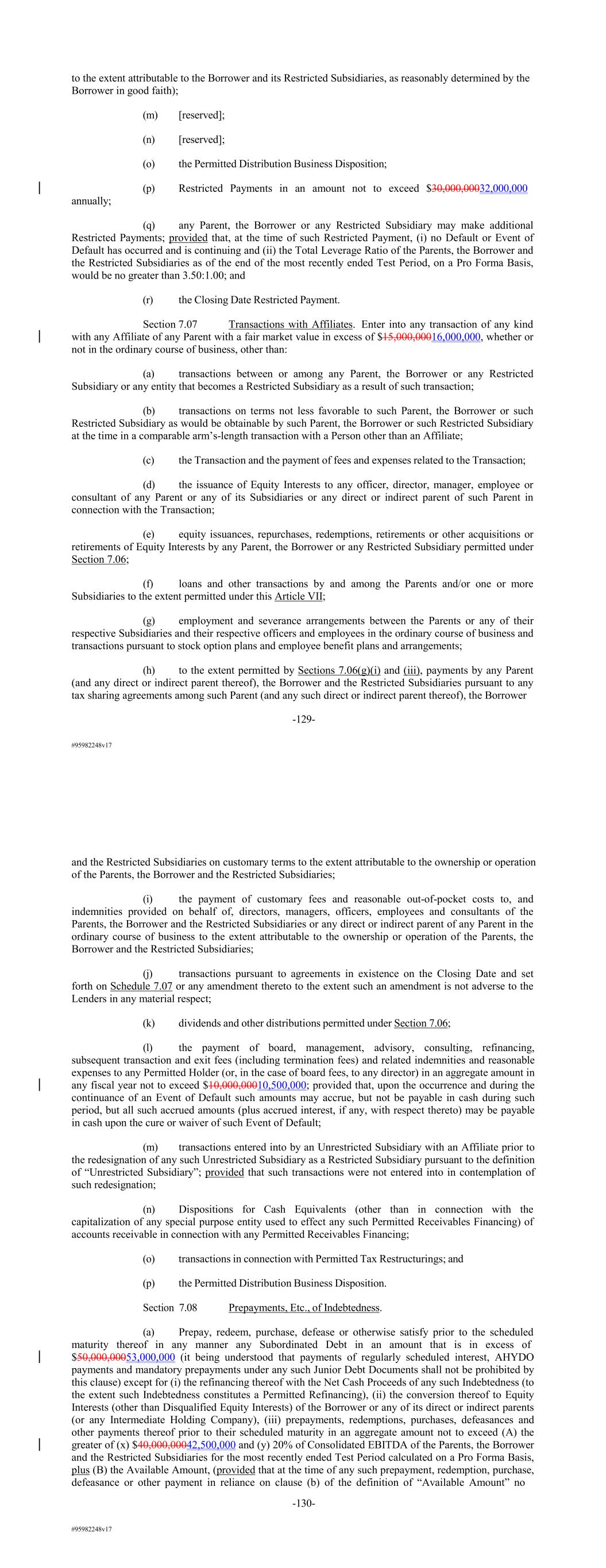 #95982248v17 to the extent attributable to the Borrower and its Restricted Subsidiaries, as reasonably determined by the Borrower in good faith); (m) [reserved]; (n) [reserved]; (o) the Permitted Distribution Business Disposition; (p) Restricted Payments in an amount not to exceed $30,000,00032,000,000 annually; (q) any Parent, the Borrower or any Restricted Subsidiary may make additional Restricted Payments; provided that, at the time of such Restricted Payment, (i) no Default or Event of Default has occurred and is continuing and (ii) the Total Leverage Ratio of the Parents, the Borrower and the Restricted Subsidiaries as of the end of the most recently ended Test Period, on a Pro Forma Basis, would be no greater than 3.50:1.00; and (r) the Closing Date Restricted Payment. Section 7.07 Transactions with Affiliates. Enter into any transaction of any kind with any Affiliate of any Parent with a fair market value in excess of $15,000,00016,000,000, whether or not in the ordinary course of business, other than: (a) transactions between or among any Parent, the Borrower or any Restricted Subsidiary or any entity that becomes a Restricted Subsidiary as a result of such transaction; (b) transactions on terms not less favorable to such Parent, the Borrower or such Restricted Subsidiary as would be obtainable by such Parent, the Borrower or such Restricted Subsidiary at the time in a comparable arm’s-length transaction with a Person other than an Affiliate; (c) the Transaction and the payment of fees and expenses related to the Transaction; (d) the issuance of Equity Interests to any officer, director, manager, employee or consultant of any Parent or any of its Subsidiaries or any direct or indirect parent of such Parent in connection with the Transaction; (e) equity issuances, repurchases, redemptions, retirements or other acquisitions or retirements of Equity Interests by any Parent, the Borrower or any Restricted Subsidiary permitted under Section 7.06; (f) loans and other transactions by and among the Parents and/or one or more Subsidiaries to the extent permitted under this Article VII; (g) employment and severance arrangements between the Parents or any of their respective Subsidiaries and their respective officers and employees in the ordinary course of business and transactions pursuant to stock option plans and employee benefit plans and arrangements; (h) to the extent permitted by Sections 7.06(g)(i) and (iii), payments by any Parent (and any direct or indirect parent thereof), the Borrower and the Restricted Subsidiaries pursuant to any tax sharing agreements among such Parent (and any such direct or indirect parent thereof), the Borrower -129- #95982248v17 and the Restricted Subsidiaries on customary terms to the extent attributable to the ownership or operation of the Parents, the Borrower and the Restricted Subsidiaries; (i) the payment of customary fees and reasonable out-of-pocket costs to, and indemnities provided on behalf of, directors, managers, officers, employees and consultants of the Parents, the Borrower and the Restricted Subsidiaries or any direct or indirect parent of any Parent in the ordinary course of business to the extent attributable to the ownership or operation of the Parents, the Borrower and the Restricted Subsidiaries; (j) transactions pursuant to agreements in existence on the Closing Date and set forth on Schedule 7.07 or any amendment thereto to the extent such an amendment is not adverse to the Lenders in any material respect; (k) dividends and other distributions permitted under Section 7.06; (l) the payment of board, management, advisory, consulting, refinancing, subsequent transaction and exit fees (including termination fees) and related indemnities and reasonable expenses to any Permitted Holder (or, in the case of board fees, to any director) in an aggregate amount in any fiscal year not to exceed $10,000,00010,500,000; provided that, upon the occurrence and during the continuance of an Event of Default such amounts may accrue, but not be payable in cash during such period, but all such accrued amounts (plus accrued interest, if any, with respect thereto) may be payable in cash upon the cure or waiver of such Event of Default; (m) transactions entered into by an Unrestricted Subsidiary with an Affiliate prior to the redesignation of any such Unrestricted Subsidiary as a Restricted Subsidiary pursuant to the definition of “Unrestricted Subsidiary”; provided that such transactions were not entered into in contemplation of such redesignation; (n) Dispositions for Cash Equivalents (other than in connection with the capitalization of any special purpose entity used to effect any such Permitted Receivables Financing) of accounts receivable in connection with any Permitted Receivables Financing; (o) transactions in connection with Permitted Tax Restructurings; and (p) the Permitted Distribution Business Disposition. Section 7.08 Prepayments, Etc., of Indebtedness. (a) Prepay, redeem, purchase, defease or otherwise satisfy prior to the scheduled maturity thereof in any manner any Subordinated Debt in an amount that is in excess of $50,000,00053,000,000 (it being understood that payments of regularly scheduled interest, AHYDO payments and mandatory prepayments under any such Junior Debt Documents shall not be prohibited by this clause) except for (i) the refinancing thereof with the Net Cash Proceeds of any such Indebtedness (to the extent such Indebtedness constitutes a Permitted Refinancing), (ii) the conversion thereof to Equity Interests (other than Disqualified Equity Interests) of the Borrower or any of its direct or indirect parents (or any Intermediate Holding Company), (iii) prepayments, redemptions, purchases, defeasances and other payments thereof prior to their scheduled maturity in an aggregate amount not to exceed (A) the greater of (x) $40,000,00042,500,000 and (y) 20% of Consolidated EBITDA of the Parents, the Borrower and the Restri