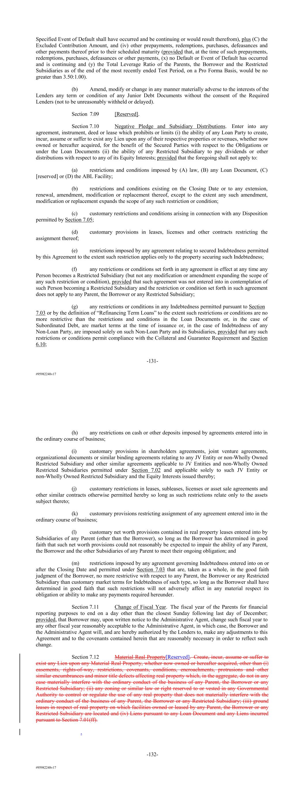 #95982248v17 Specified Event of Default shall have occurred and be continuing or would result therefrom), plus (C) the Excluded Contribution Amount, and (iv) other prepayments, redemptions, purchases, defeasances and other payments thereof prior to their scheduled maturity (provided that, at the time of such prepayments, redemptions, purchases, defeasances or other payments, (x) no Default or Event of Default has occurred and is continuing and (y) the Total Leverage Ratio of the Parents, the Borrower and the Restricted Subsidiaries as of the end of the most recently ended Test Period, on a Pro Forma Basis, would be no greater than 3.50:1.00). (b) Amend, modify or change in any manner materially adverse to the interests of the Lenders any term or condition of any Junior Debt Documents without the consent of the Required Lenders (not to be unreasonably withheld or delayed). Section 7.09 [Reserved]. Section 7.10 Negative Pledge and Subsidiary Distributions. Enter into any agreement, instrument, deed or lease which prohibits or limits (i) the ability of any Loan Party to create, incur, assume or suffer to exist any Lien upon any of their respective properties or revenues, whether now owned or hereafter acquired, for the benefit of the Secured Parties with respect to the Obligations or under the Loan Documents (ii) the ability of any Restricted Subsidiary to pay dividends or other distributions with respect to any of its Equity Interests; provided that the foregoing shall not apply to: (a) restrictions and conditions imposed by (A) law, (B) any Loan Document, (C) [reserved] or (D) the ABL Facility; (b) restrictions and conditions existing on the Closing Date or to any extension, renewal, amendment, modification or replacement thereof, except to the extent any such amendment, modification or replacement expands the scope of any such restriction or condition; (c) customary restrictions and conditions arising in connection with any Disposition permitted by Section 7.05; (d) customary provisions in leases, licenses and other contracts restricting the assignment thereof; (e) restrictions imposed by any agreement relating to secured Indebtedness permitted by this Agreement to the extent such restriction applies only to the property securing such Indebtedness; (f) any restrictions or conditions set forth in any agreement in effect at any time any Person becomes a Restricted Subsidiary (but not any modification or amendment expanding the scope of any such restriction or condition), provided that such agreement was not entered into in contemplation of such Person becoming a Restricted Subsidiary and the restriction or condition set forth in such agreement does not apply to any Parent, the Borrower or any Restricted Subsidiary; (g) any restrictions or conditions in any Indebtedness permitted pursuant to Section 7.03 or by the definition of “Refinancing Term Loans” to the extent such restrictions or conditions are no more restrictive than the restrictions and conditions in the Loan Documents or, in the case of Subordinated Debt, are market terms at the time of issuance or, in the case of Indebtedness of any Non-Loan Party, are imposed solely on such Non-Loan Party and its Subsidiaries, provided that any such restrictions or conditions permit compliance with the Collateral and Guarantee Requirement and Section 6.10; -131- #95982248v17 (h) any restrictions on cash or other deposits imposed by agreements entered into in the ordinary course of business; (i) customary provisions in shareholders agreements, joint venture agreements, organizational documents or similar binding agreements relating to any JV Entity or non-Wholly Owned Restricted Subsidiary and other similar agreements applicable to JV Entities and non-Wholly Owned Restricted Subsidiaries permitted under Section 7.02 and applicable solely to such JV Entity or non-Wholly Owned Restricted Subsidiary and the Equity Interests issued thereby; (j) customary restrictions in leases, subleases, licenses or asset sale agreements and other similar contracts otherwise permitted hereby so long as such restrictions relate only to the assets subject thereto; (k) customary provisions restricting assignment of any agreement entered into in the ordinary course of business; (l) customary net worth provisions contained in real property leases entered into by Subsidiaries of any Parent (other than the Borrower), so long as the Borrower has determined in good faith that such net worth provisions could not reasonably be expected to impair the ability of any Parent, the Borrower and the other Subsidiaries of any Parent to meet their ongoing obligation; and (m) restrictions imposed by any agreement governing Indebtedness entered into on or after the Closing Date and permitted under Section 7.03 that are, taken as a whole, in the good faith judgment of the Borrower, no more restrictive with respect to any Parent, the Borrower or any Restricted Subsidiary than customary market terms for Indebtedness of such type, so long as the Borrower shall have determined in good faith that such restrictions will not adversely affect in any material respect its obligation or ability to make any payments required hereunder. Section 7.11 Change of Fiscal Year. The fiscal year of the Parents for financial reporting purposes to end on a day other than the closest Sunday following last day of December; provided, that Borrower may, upon written notice to the Administrative Agent, change such fiscal year to any other fiscal year reasonably acceptable to the Administrative Agent, in which case, the Borrower and the Administrative Agent will, and are hereby authorized by the Lenders to, make any adjustments to this Agreement and to the covenants contained herein that are reasonably necessary in order to reflect such change. Section 7.12 Material Real Property[Reserved]. Create, incur, assume or suffer to exist any Lien upon any Material Real Property, whether now owned or hereafter acquired,