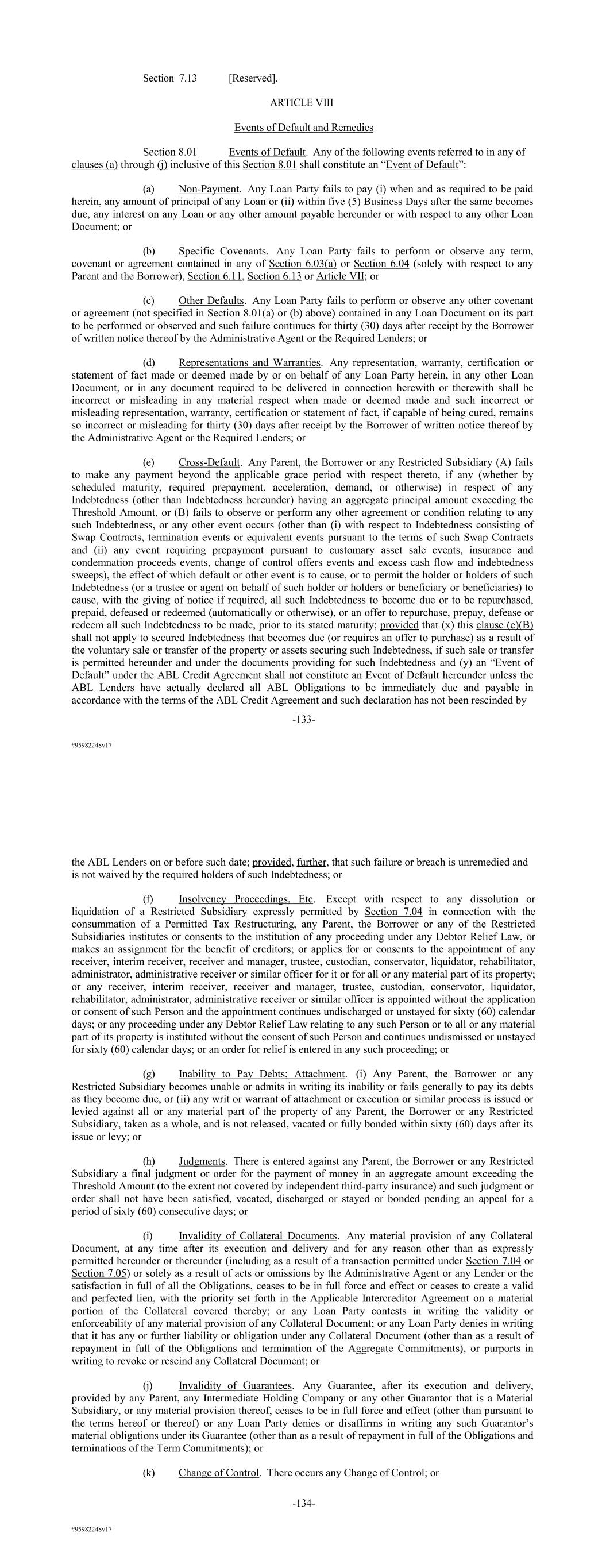 #95982248v17 Section 7.13 [Reserved]. ARTICLE VIII Events of Default and Remedies Section 8.01 Events of Default. Any of the following events referred to in any of clauses (a) through (j) inclusive of this Section 8.01 shall constitute an “Event of Default”: (a) Non-Payment. Any Loan Party fails to pay (i) when and as required to be paid herein, any amount of principal of any Loan or (ii) within five (5) Business Days after the same becomes due, any interest on any Loan or any other amount payable hereunder or with respect to any other Loan Document; or (b) Specific Covenants. Any Loan Party fails to perform or observe any term, covenant or agreement contained in any of Section 6.03(a) or Section 6.04 (solely with respect to any Parent and the Borrower), Section 6.11, Section 6.13 or Article VII; or (c) Other Defaults. Any Loan Party fails to perform or observe any other covenant or agreement (not specified in Section 8.01(a) or (b) above) contained in any Loan Document on its part to be performed or observed and such failure continues for thirty (30) days after receipt by the Borrower of written notice thereof by the Administrative Agent or the Required Lenders; or (d) Representations and Warranties. Any representation, warranty, certification or statement of fact made or deemed made by or on behalf of any Loan Party herein, in any other Loan Document, or in any document required to be delivered in connection herewith or therewith shall be incorrect or misleading in any material respect when made or deemed made and such incorrect or misleading representation, warranty, certification or statement of fact, if capable of being cured, remains so incorrect or misleading for thirty (30) days after receipt by the Borrower of written notice thereof by the Administrative Agent or the Required Lenders; or (e) Cross-Default. Any Parent, the Borrower or any Restricted Subsidiary (A) fails to make any payment beyond the applicable grace period with respect thereto, if any (whether by scheduled maturity, required prepayment, acceleration, demand, or otherwise) in respect of any Indebtedness (other than Indebtedness hereunder) having an aggregate principal amount exceeding the Threshold Amount, or (B) fails to observe or perform any other agreement or condition relating to any such Indebtedness, or any other event occurs (other than (i) with respect to Indebtedness consisting of Swap Contracts, termination events or equivalent events pursuant to the terms of such Swap Contracts and (ii) any event requiring prepayment pursuant to customary asset sale events, insurance and condemnation proceeds events, change of control offers events and excess cash flow and indebtedness sweeps), the effect of which default or other event is to cause, or to permit the holder or holders of such Indebtedness (or a trustee or agent on behalf of such holder or holders or beneficiary or beneficiaries) to cause, with the giving of notice if required, all such Indebtedness to become due or to be repurchased, prepaid, defeased or redeemed (automatically or otherwise), or an offer to repurchase, prepay, defease or redeem all such Indebtedness to be made, prior to its stated maturity; provided that (x) this clause (e)(B) shall not apply to secured Indebtedness that becomes due (or requires an offer to purchase) as a result of the voluntary sale or transfer of the property or assets securing such Indebtedness, if such sale or transfer is permitted hereunder and under the documents providing for such Indebtedness and (y) an “Event of Default” under the ABL Credit Agreement shall not constitute an Event of Default hereunder unless the ABL Lenders have actually declared all ABL Obligations to be immediately due and payable in accordance with the terms of the ABL Credit Agreement and such declaration has not been rescinded by -133- #95982248v17 the ABL Lenders on or before such date; provided, further, that such failure or breach is unremedied and is not waived by the required holders of such Indebtedness; or (f) Insolvency Proceedings, Etc. Except with respect to any dissolution or liquidation of a Restricted Subsidiary expressly permitted by Section 7.04 in connection with the consummation of a Permitted Tax Restructuring, any Parent, the Borrower or any of the Restricted Subsidiaries institutes or consents to the institution of any proceeding under any Debtor Relief Law, or makes an assignment for the benefit of creditors; or applies for or consents to the appointment of any receiver, interim receiver, receiver and manager, trustee, custodian, conservator, liquidator, rehabilitator, administrator, administrative receiver or similar officer for it or for all or any material part of its property; or any receiver, interim receiver, receiver and manager, trustee, custodian, conservator, liquidator, rehabilitator, administrator, administrative receiver or similar officer is appointed without the application or consent of such Person and the appointment continues undischarged or unstayed for sixty (60) calendar days; or any proceeding under any Debtor Relief Law relating to any such Person or to all or any material part of its property is instituted without the consent of such Person and continues undismissed or unstayed for sixty (60) calendar days; or an order for relief is entered in any such proceeding; or (g) Inability to Pay Debts; Attachment. (i) Any Parent, the Borrower or any Restricted Subsidiary becomes unable or admits in writing its inability or fails generally to pay its debts as they become due, or (ii) any writ or warrant of attachment or execution or similar process is issued or levied against all or any material part of the property of any Parent, the Borrower or any Restricted Subsidiary, taken as a whole, and is not released, vacated or fully bonded within sixty (60) days after its issue or levy; or (h) Judgments. There is entered against any Parent, the Borrower or any Restricted Subsidiary a final judgment o