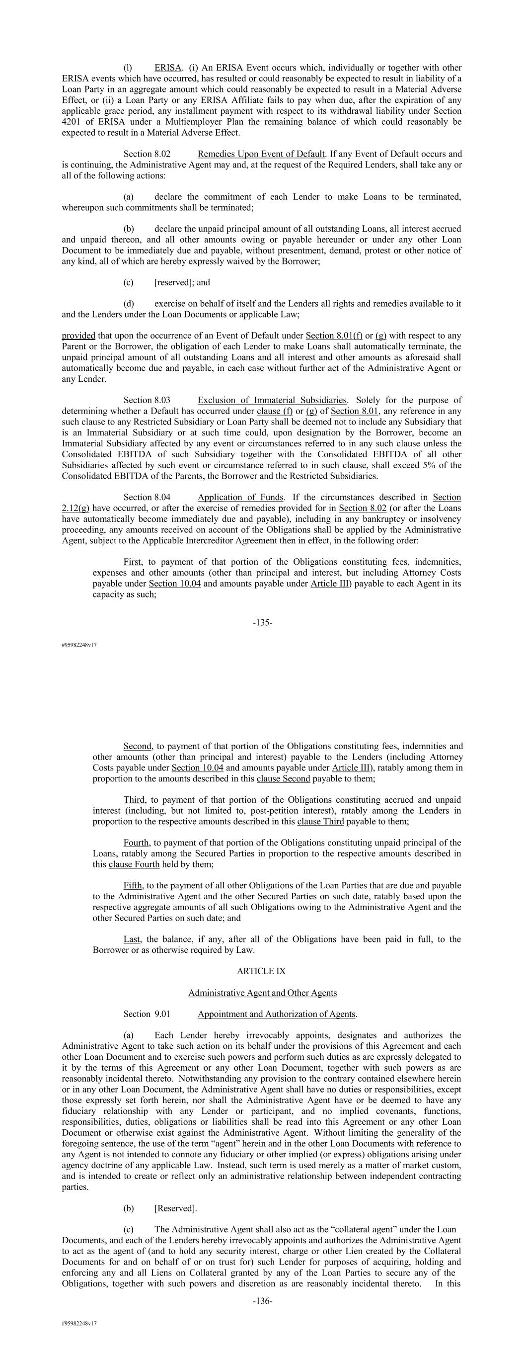 #95982248v17 (l) ERISA. (i) An ERISA Event occurs which, individually or together with other ERISA events which have occurred, has resulted or could reasonably be expected to result in liability of a Loan Party in an aggregate amount which could reasonably be expected to result in a Material Adverse Effect, or (ii) a Loan Party or any ERISA Affiliate fails to pay when due, after the expiration of any applicable grace period, any installment payment with respect to its withdrawal liability under Section 4201 of ERISA under a Multiemployer Plan the remaining balance of which could reasonably be expected to result in a Material Adverse Effect. Section 8.02 Remedies Upon Event of Default. If any Event of Default occurs and is continuing, the Administrative Agent may and, at the request of the Required Lenders, shall take any or all of the following actions: (a) declare the commitment of each Lender to make Loans to be terminated, whereupon such commitments shall be terminated; (b) declare the unpaid principal amount of all outstanding Loans, all interest accrued and unpaid thereon, and all other amounts owing or payable hereunder or under any other Loan Document to be immediately due and payable, without presentment, demand, protest or other notice of any kind, all of which are hereby expressly waived by the Borrower; (c) [reserved]; and (d) exercise on behalf of itself and the Lenders all rights and remedies available to it and the Lenders under the Loan Documents or applicable Law; provided that upon the occurrence of an Event of Default under Section 8.01(f) or (g) with respect to any Parent or the Borrower, the obligation of each Lender to make Loans shall automatically terminate, the unpaid principal amount of all outstanding Loans and all interest and other amounts as aforesaid shall automatically become due and payable, in each case without further act of the Administrative Agent or any Lender. Section 8.03 Exclusion of Immaterial Subsidiaries. Solely for the purpose of determining whether a Default has occurred under clause (f) or (g) of Section 8.01, any reference in any such clause to any Restricted Subsidiary or Loan Party shall be deemed not to include any Subsidiary that is an Immaterial Subsidiary or at such time could, upon designation by the Borrower, become an Immaterial Subsidiary affected by any event or circumstances referred to in any such clause unless the Consolidated EBITDA of such Subsidiary together with the Consolidated EBITDA of all other Subsidiaries affected by such event or circumstance referred to in such clause, shall exceed 5% of the Consolidated EBITDA of the Parents, the Borrower and the Restricted Subsidiaries. Section 8.04 Application of Funds. If the circumstances described in Section 2.12(g) have occurred, or after the exercise of remedies provided for in Section 8.02 (or after the Loans have automatically become immediately due and payable), including in any bankruptcy or insolvency proceeding, any amounts received on account of the Obligations shall be applied by the Administrative Agent, subject to the Applicable Intercreditor Agreement then in effect, in the following order: First, to payment of that portion of the Obligations constituting fees, indemnities, expenses and other amounts (other than principal and interest, but including Attorney Costs payable under Section 10.04 and amounts payable under Article III) payable to each Agent in its capacity as such; -135- #95982248v17 Second, to payment of that portion of the Obligations constituting fees, indemnities and other amounts (other than principal and interest) payable to the Lenders (including Attorney Costs payable under Section 10.04 and amounts payable under Article III), ratably among them in proportion to the amounts described in this clause Second payable to them; Third, to payment of that portion of the Obligations constituting accrued and unpaid interest (including, but not limited to, post-petition interest), ratably among the Lenders in proportion to the respective amounts described in this clause Third payable to them; Fourth, to payment of that portion of the Obligations constituting unpaid principal of the Loans, ratably among the Secured Parties in proportion to the respective amounts described in this clause Fourth held by them; Fifth, to the payment of all other Obligations of the Loan Parties that are due and payable to the Administrative Agent and the other Secured Parties on such date, ratably based upon the respective aggregate amounts of all such Obligations owing to the Administrative Agent and the other Secured Parties on such date; and Last, the balance, if any, after all of the Obligations have been paid in full, to the Borrower or as otherwise required by Law. ARTICLE IX Administrative Agent and Other Agents Section 9.01 Appointment and Authorization of Agents. (a) Each Lender hereby irrevocably appoints, designates and authorizes the Administrative Agent to take such action on its behalf under the provisions of this Agreement and each other Loan Document and to exercise such powers and perform such duties as are expressly delegated to it by the terms of this Agreement or any other Loan Document, together with such powers as are reasonably incidental thereto. Notwithstanding any provision to the contrary contained elsewhere herein or in any other Loan Document, the Administrative Agent shall have no duties or responsibilities, except those expressly set forth herein, nor shall the Administrative Agent have or be deemed to have any fiduciary relationship with any Lender or participant, and no implied covenants, functions, responsibilities, duties, obligations or liabilities shall be read into this Agreement or any other Loan Document or otherwise exist against the Administrative Agent. Without limiting the generality of the foregoing sentence, the use of the term “agent” herein and in the other Loan Documents with reference to any Agent is not intended to connote a