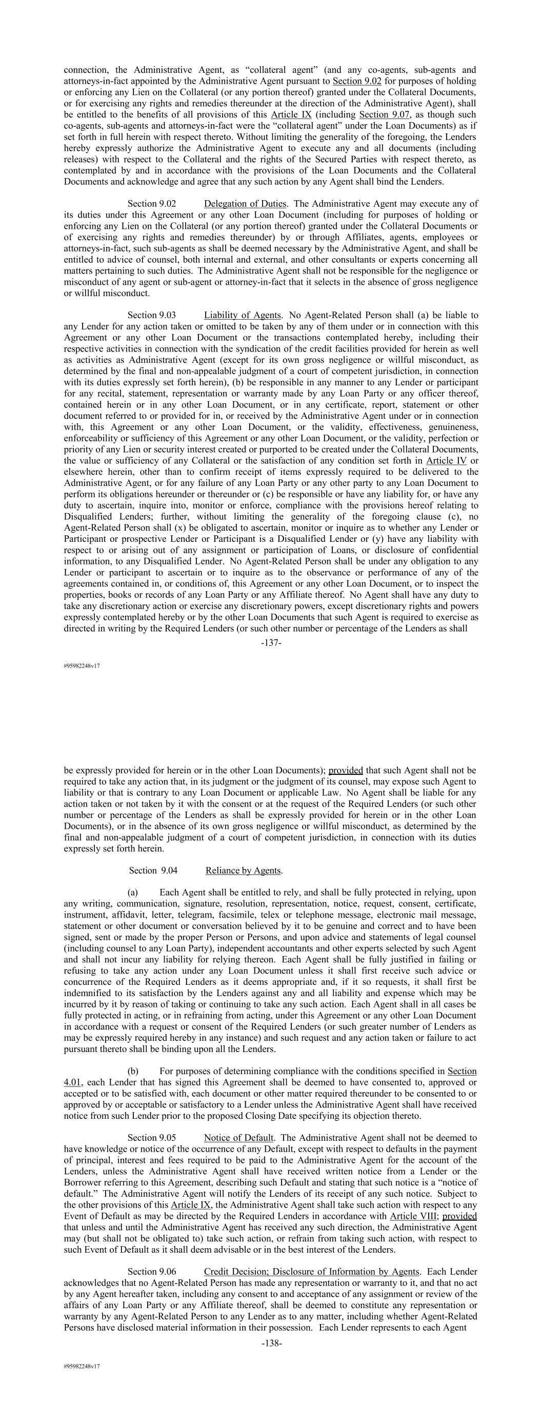 #95982248v17 connection, the Administrative Agent, as “collateral agent” (and any co-agents, sub-agents and attorneys-in-fact appointed by the Administrative Agent pursuant to Section 9.02 for purposes of holding or enforcing any Lien on the Collateral (or any portion thereof) granted under the Collateral Documents, or for exercising any rights and remedies thereunder at the direction of the Administrative Agent), shall be entitled to the benefits of all provisions of this Article IX (including Section 9.07, as though such co-agents, sub-agents and attorneys-in-fact were the “collateral agent” under the Loan Documents) as if set forth in full herein with respect thereto. Without limiting the generality of the foregoing, the Lenders hereby expressly authorize the Administrative Agent to execute any and all documents (including releases) with respect to the Collateral and the rights of the Secured Parties with respect thereto, as contemplated by and in accordance with the provisions of the Loan Documents and the Collateral Documents and acknowledge and agree that any such action by any Agent shall bind the Lenders. Section 9.02 Delegation of Duties. The Administrative Agent may execute any of its duties under this Agreement or any other Loan Document (including for purposes of holding or enforcing any Lien on the Collateral (or any portion thereof) granted under the Collateral Documents or of exercising any rights and remedies thereunder) by or through Affiliates, agents, employees or attorneys-in-fact, such sub-agents as shall be deemed necessary by the Administrative Agent, and shall be entitled to advice of counsel, both internal and external, and other consultants or experts concerning all matters pertaining to such duties. The Administrative Agent shall not be responsible for the negligence or misconduct of any agent or sub-agent or attorney-in-fact that it selects in the absence of gross negligence or willful misconduct. Section 9.03 Liability of Agents. No Agent-Related Person shall (a) be liable to any Lender for any action taken or omitted to be taken by any of them under or in connection with this Agreement or any other Loan Document or the transactions contemplated hereby, including their respective activities in connection with the syndication of the credit facilities provided for herein as well as activities as Administrative Agent (except for its own gross negligence or willful misconduct, as determined by the final and non-appealable judgment of a court of competent jurisdiction, in connection with its duties expressly set forth herein), (b) be responsible in any manner to any Lender or participant for any recital, statement, representation or warranty made by any Loan Party or any officer thereof, contained herein or in any other Loan Document, or in any certificate, report, statement or other document referred to or provided for in, or received by the Administrative Agent under or in connection with, this Agreement or any other Loan Document, or the validity, effectiveness, genuineness, enforceability or sufficiency of this Agreement or any other Loan Document, or the validity, perfection or priority of any Lien or security interest created or purported to be created under the Collateral Documents, the value or sufficiency of any Collateral or the satisfaction of any condition set forth in Article IV or elsewhere herein, other than to confirm receipt of items expressly required to be delivered to the Administrative Agent, or for any failure of any Loan Party or any other party to any Loan Document to perform its obligations hereunder or thereunder or (c) be responsible or have any liability for, or have any duty to ascertain, inquire into, monitor or enforce, compliance with the provisions hereof relating to Disqualified Lenders; further, without limiting the generality of the foregoing clause (c), no Agent-Related Person shall (x) be obligated to ascertain, monitor or inquire as to whether any Lender or Participant or prospective Lender or Participant is a Disqualified Lender or (y) have any liability with respect to or arising out of any assignment or participation of Loans, or disclosure of confidential information, to any Disqualified Lender. No Agent-Related Person shall be under any obligation to any Lender or participant to ascertain or to inquire as to the observance or performance of any of the agreements contained in, or conditions of, this Agreement or any other Loan Document, or to inspect the properties, books or records of any Loan Party or any Affiliate thereof. No Agent shall have any duty to take any discretionary action or exercise any discretionary powers, except discretionary rights and powers expressly contemplated hereby or by the other Loan Documents that such Agent is required to exercise as directed in writing by the Required Lenders (or such other number or percentage of the Lenders as shall -137- #95982248v17 be expressly provided for herein or in the other Loan Documents); provided that such Agent shall not be required to take any action that, in its judgment or the judgment of its counsel, may expose such Agent to liability or that is contrary to any Loan Document or applicable Law. No Agent shall be liable for any action taken or not taken by it with the consent or at the request of the Required Lenders (or such other number or percentage of the Lenders as shall be expressly provided for herein or in the other Loan Documents), or in the absence of its own gross negligence or willful misconduct, as determined by the final and non-appealable judgment of a court of competent jurisdiction, in connection with its duties expressly set forth herein. Section 9.04 Reliance by Agents. (a) Each Agent shall be entitled to rely, and shall be fully protected in relying, upon any writing, communication, signature, resolution, representation, notice, request, consent, certificate, instrument, affidavit, letter, telegram, facsimile, telex or telephone 