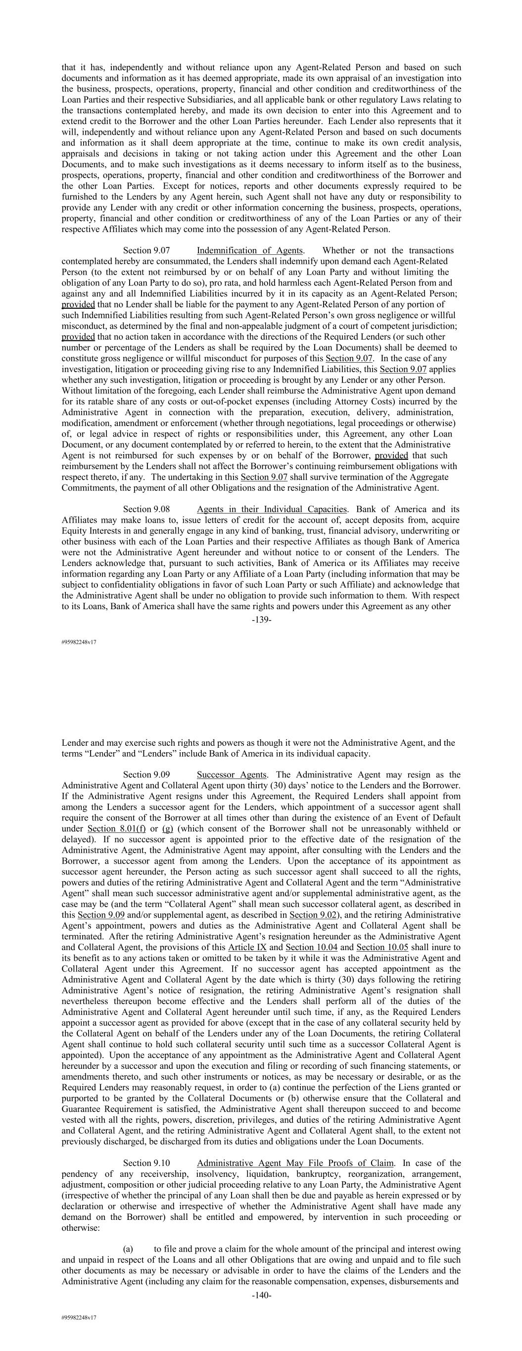 #95982248v17 that it has, independently and without reliance upon any Agent-Related Person and based on such documents and information as it has deemed appropriate, made its own appraisal of an investigation into the business, prospects, operations, property, financial and other condition and creditworthiness of the Loan Parties and their respective Subsidiaries, and all applicable bank or other regulatory Laws relating to the transactions contemplated hereby, and made its own decision to enter into this Agreement and to extend credit to the Borrower and the other Loan Parties hereunder. Each Lender also represents that it will, independently and without reliance upon any Agent-Related Person and based on such documents and information as it shall deem appropriate at the time, continue to make its own credit analysis, appraisals and decisions in taking or not taking action under this Agreement and the other Loan Documents, and to make such investigations as it deems necessary to inform itself as to the business, prospects, operations, property, financial and other condition and creditworthiness of the Borrower and the other Loan Parties. Except for notices, reports and other documents expressly required to be furnished to the Lenders by any Agent herein, such Agent shall not have any duty or responsibility to provide any Lender with any credit or other information concerning the business, prospects, operations, property, financial and other condition or creditworthiness of any of the Loan Parties or any of their respective Affiliates which may come into the possession of any Agent-Related Person. Section 9.07 Indemnification of Agents. Whether or not the transactions contemplated hereby are consummated, the Lenders shall indemnify upon demand each Agent-Related Person (to the extent not reimbursed by or on behalf of any Loan Party and without limiting the obligation of any Loan Party to do so), pro rata, and hold harmless each Agent-Related Person from and against any and all Indemnified Liabilities incurred by it in its capacity as an Agent-Related Person; provided that no Lender shall be liable for the payment to any Agent-Related Person of any portion of such Indemnified Liabilities resulting from such Agent-Related Person’s own gross negligence or willful misconduct, as determined by the final and non-appealable judgment of a court of competent jurisdiction; provided that no action taken in accordance with the directions of the Required Lenders (or such other number or percentage of the Lenders as shall be required by the Loan Documents) shall be deemed to constitute gross negligence or willful misconduct for purposes of this Section 9.07. In the case of any investigation, litigation or proceeding giving rise to any Indemnified Liabilities, this Section 9.07 applies whether any such investigation, litigation or proceeding is brought by any Lender or any other Person. Without limitation of the foregoing, each Lender shall reimburse the Administrative Agent upon demand for its ratable share of any costs or out-of-pocket expenses (including Attorney Costs) incurred by the Administrative Agent in connection with the preparation, execution, delivery, administration, modification, amendment or enforcement (whether through negotiations, legal proceedings or otherwise) of, or legal advice in respect of rights or responsibilities under, this Agreement, any other Loan Document, or any document contemplated by or referred to herein, to the extent that the Administrative Agent is not reimbursed for such expenses by or on behalf of the Borrower, provided that such reimbursement by the Lenders shall not affect the Borrower’s continuing reimbursement obligations with respect thereto, if any. The undertaking in this Section 9.07 shall survive termination of the Aggregate Commitments, the payment of all other Obligations and the resignation of the Administrative Agent. Section 9.08 Agents in their Individual Capacities. Bank of America and its Affiliates may make loans to, issue letters of credit for the account of, accept deposits from, acquire Equity Interests in and generally engage in any kind of banking, trust, financial advisory, underwriting or other business with each of the Loan Parties and their respective Affiliates as though Bank of America were not the Administrative Agent hereunder and without notice to or consent of the Lenders. The Lenders acknowledge that, pursuant to such activities, Bank of America or its Affiliates may receive information regarding any Loan Party or any Affiliate of a Loan Party (including information that may be subject to confidentiality obligations in favor of such Loan Party or such Affiliate) and acknowledge that the Administrative Agent shall be under no obligation to provide such information to them. With respect to its Loans, Bank of America shall have the same rights and powers under this Agreement as any other -139- #95982248v17 Lender and may exercise such rights and powers as though it were not the Administrative Agent, and the terms “Lender” and “Lenders” include Bank of America in its individual capacity. Section 9.09 Successor Agents. The Administrative Agent may resign as the Administrative Agent and Collateral Agent upon thirty (30) days’ notice to the Lenders and the Borrower. If the Administrative Agent resigns under this Agreement, the Required Lenders shall appoint from among the Lenders a successor agent for the Lenders, which appointment of a successor agent shall require the consent of the Borrower at all times other than during the existence of an Event of Default under Section 8.01(f) or (g) (which consent of the Borrower shall not be unreasonably withheld or delayed). If no successor agent is appointed prior to the effective date of the resignation of the Administrative Agent, the Administrative Agent may appoint, after consulting with the Lenders and the Borrower, a successor agent from among the Lenders. Upon the acceptan