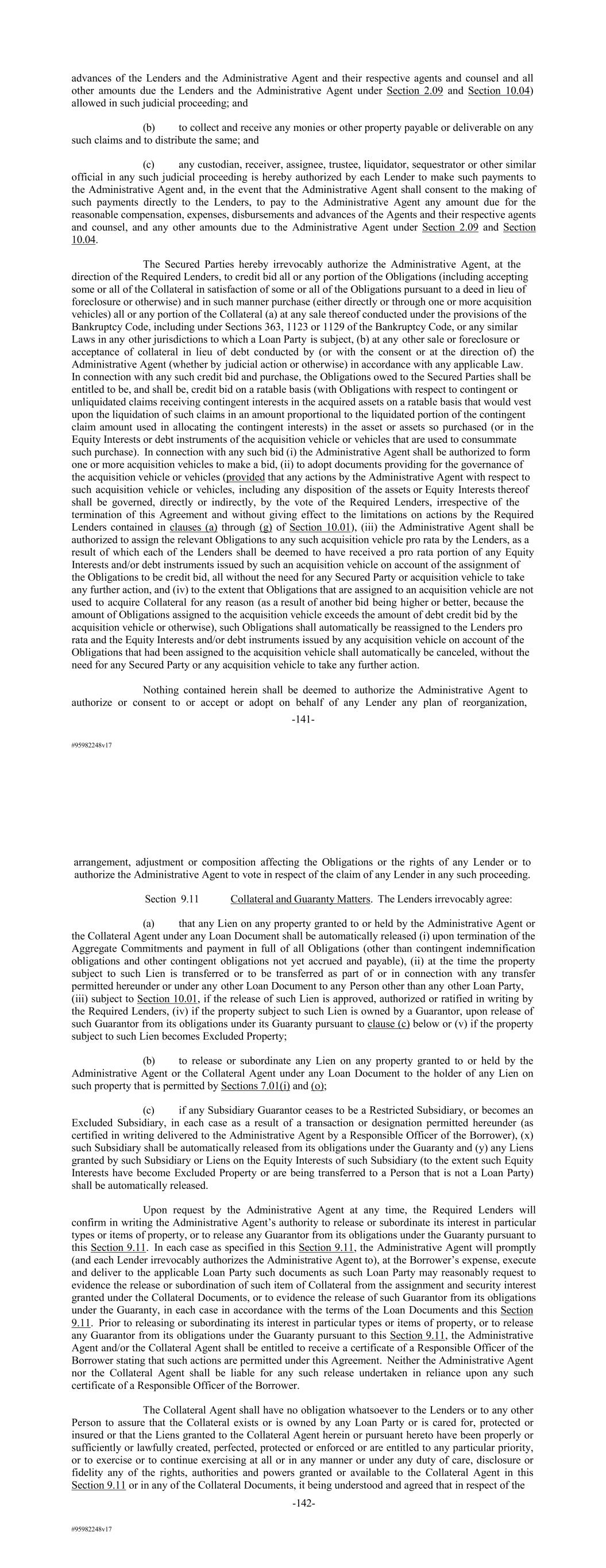 #95982248v17 advances of the Lenders and the Administrative Agent and their respective agents and counsel and all other amounts due the Lenders and the Administrative Agent under Section 2.09 and Section 10.04) allowed in such judicial proceeding; and (b) to collect and receive any monies or other property payable or deliverable on any such claims and to distribute the same; and (c) any custodian, receiver, assignee, trustee, liquidator, sequestrator or other similar official in any such judicial proceeding is hereby authorized by each Lender to make such payments to the Administrative Agent and, in the event that the Administrative Agent shall consent to the making of such payments directly to the Lenders, to pay to the Administrative Agent any amount due for the reasonable compensation, expenses, disbursements and advances of the Agents and their respective agents and counsel, and any other amounts due to the Administrative Agent under Section 2.09 and Section 10.04. The Secured Parties hereby irrevocably authorize the Administrative Agent, at the direction of the Required Lenders, to credit bid all or any portion of the Obligations (including accepting some or all of the Collateral in satisfaction of some or all of the Obligations pursuant to a deed in lieu of foreclosure or otherwise) and in such manner purchase (either directly or through one or more acquisition vehicles) all or any portion of the Collateral (a) at any sale thereof conducted under the provisions of the Bankruptcy Code, including under Sections 363, 1123 or 1129 of the Bankruptcy Code, or any similar Laws in any other jurisdictions to which a Loan Party is subject, (b) at any other sale or foreclosure or acceptance of collateral in lieu of debt conducted by (or with the consent or at the direction of) the Administrative Agent (whether by judicial action or otherwise) in accordance with any applicable Law. In connection with any such credit bid and purchase, the Obligations owed to the Secured Parties shall be entitled to be, and shall be, credit bid on a ratable basis (with Obligations with respect to contingent or unliquidated claims receiving contingent interests in the acquired assets on a ratable basis that would vest upon the liquidation of such claims in an amount proportional to the liquidated portion of the contingent claim amount used in allocating the contingent interests) in the asset or assets so purchased (or in the Equity Interests or debt instruments of the acquisition vehicle or vehicles that are used to consummate such purchase). In connection with any such bid (i) the Administrative Agent shall be authorized to form one or more acquisition vehicles to make a bid, (ii) to adopt documents providing for the governance of the acquisition vehicle or vehicles (provided that any actions by the Administrative Agent with respect to such acquisition vehicle or vehicles, including any disposition of the assets or Equity Interests thereof shall be governed, directly or indirectly, by the vote of the Required Lenders, irrespective of the termination of this Agreement and without giving effect to the limitations on actions by the Required Lenders contained in clauses (a) through (g) of Section 10.01), (iii) the Administrative Agent shall be authorized to assign the relevant Obligations to any such acquisition vehicle pro rata by the Lenders, as a result of which each of the Lenders shall be deemed to have received a pro rata portion of any Equity Interests and/or debt instruments issued by such an acquisition vehicle on account of the assignment of the Obligations to be credit bid, all without the need for any Secured Party or acquisition vehicle to take any further action, and (iv) to the extent that Obligations that are assigned to an acquisition vehicle are not used to acquire Collateral for any reason (as a result of another bid being higher or better, because the amount of Obligations assigned to the acquisition vehicle exceeds the amount of debt credit bid by the acquisition vehicle or otherwise), such Obligations shall automatically be reassigned to the Lenders pro rata and the Equity Interests and/or debt instruments issued by any acquisition vehicle on account of the Obligations that had been assigned to the acquisition vehicle shall automatically be canceled, without the need for any Secured Party or any acquisition vehicle to take any further action. Nothing contained herein shall be deemed to authorize the Administrative Agent to authorize or consent to or accept or adopt on behalf of any Lender any plan of reorganization, -141- #95982248v17 arrangement, adjustment or composition affecting the Obligations or the rights of any Lender or to authorize the Administrative Agent to vote in respect of the claim of any Lender in any such proceeding. Section 9.11 Collateral and Guaranty Matters. The Lenders irrevocably agree: (a) that any Lien on any property granted to or held by the Administrative Agent or the Collateral Agent under any Loan Document shall be automatically released (i) upon termination of the Aggregate Commitments and payment in full of all Obligations (other than contingent indemnification obligations and other contingent obligations not yet accrued and payable), (ii) at the time the property subject to such Lien is transferred or to be transferred as part of or in connection with any transfer permitted hereunder or under any other Loan Document to any Person other than any other Loan Party, (iii) subject to Section 10.01, if the release of such Lien is approved, authorized or ratified in writing by the Required Lenders, (iv) if the property subject to such Lien is owned by a Guarantor, upon release of such Guarantor from its obligations under its Guaranty pursuant to clause (c) below or (v) if the property subject to such Lien becomes Excluded Property; (b) to release or subordinate any Lien on any property granted to or held by the Administrative Agent or the Collateral Agent under any Lo