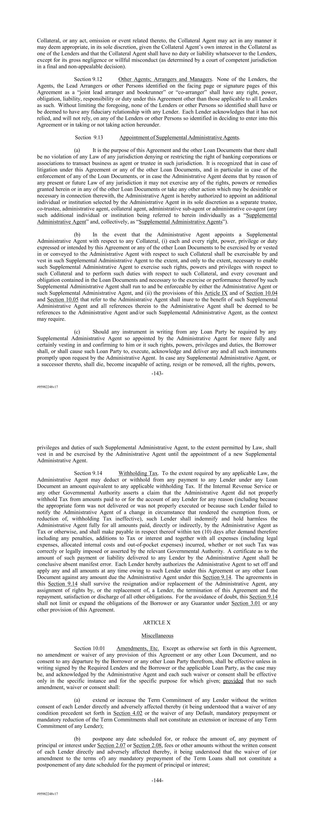 #95982248v17 Collateral, or any act, omission or event related thereto, the Collateral Agent may act in any manner it may deem appropriate, in its sole discretion, given the Collateral Agent’s own interest in the Collateral as one of the Lenders and that the Collateral Agent shall have no duty or liability whatsoever to the Lenders, except for its gross negligence or willful misconduct (as determined by a court of competent jurisdiction in a final and non-appealable decision). Section 9.12 Other Agents; Arrangers and Managers. None of the Lenders, the Agents, the Lead Arrangers or other Persons identified on the facing page or signature pages of this Agreement as a “joint lead arranger and bookrunner” or “co-arranger” shall have any right, power, obligation, liability, responsibility or duty under this Agreement other than those applicable to all Lenders as such. Without limiting the foregoing, none of the Lenders or other Persons so identified shall have or be deemed to have any fiduciary relationship with any Lender. Each Lender acknowledges that it has not relied, and will not rely, on any of the Lenders or other Persons so identified in deciding to enter into this Agreement or in taking or not taking action hereunder. Section 9.13 Appointment of Supplemental Administrative Agents. (a) It is the purpose of this Agreement and the other Loan Documents that there shall be no violation of any Law of any jurisdiction denying or restricting the right of banking corporations or associations to transact business as agent or trustee in such jurisdiction. It is recognized that in case of litigation under this Agreement or any of the other Loan Documents, and in particular in case of the enforcement of any of the Loan Documents, or in case the Administrative Agent deems that by reason of any present or future Law of any jurisdiction it may not exercise any of the rights, powers or remedies granted herein or in any of the other Loan Documents or take any other action which may be desirable or necessary in connection therewith, the Administrative Agent is hereby authorized to appoint an additional individual or institution selected by the Administrative Agent in its sole discretion as a separate trustee, co-trustee, administrative agent, collateral agent, administrative sub-agent or administrative co-agent (any such additional individual or institution being referred to herein individually as a “Supplemental Administrative Agent” and, collectively, as “Supplemental Administrative Agents”). (b) In the event that the Administrative Agent appoints a Supplemental Administrative Agent with respect to any Collateral, (i) each and every right, power, privilege or duty expressed or intended by this Agreement or any of the other Loan Documents to be exercised by or vested in or conveyed to the Administrative Agent with respect to such Collateral shall be exercisable by and vest in such Supplemental Administrative Agent to the extent, and only to the extent, necessary to enable such Supplemental Administrative Agent to exercise such rights, powers and privileges with respect to such Collateral and to perform such duties with respect to such Collateral, and every covenant and obligation contained in the Loan Documents and necessary to the exercise or performance thereof by such Supplemental Administrative Agent shall run to and be enforceable by either the Administrative Agent or such Supplemental Administrative Agent, and (ii) the provisions of this Article IX and of Section 10.04 and Section 10.05 that refer to the Administrative Agent shall inure to the benefit of such Supplemental Administrative Agent and all references therein to the Administrative Agent shall be deemed to be references to the Administrative Agent and/or such Supplemental Administrative Agent, as the context may require. (c) Should any instrument in writing from any Loan Party be required by any Supplemental Administrative Agent so appointed by the Administrative Agent for more fully and certainly vesting in and confirming to him or it such rights, powers, privileges and duties, the Borrower shall, or shall cause such Loan Party to, execute, acknowledge and deliver any and all such instruments promptly upon request by the Administrative Agent. In case any Supplemental Administrative Agent, or a successor thereto, shall die, become incapable of acting, resign or be removed, all the rights, powers, -143- #95982248v17 privileges and duties of such Supplemental Administrative Agent, to the extent permitted by Law, shall vest in and be exercised by the Administrative Agent until the appointment of a new Supplemental Administrative Agent. Section 9.14 Withholding Tax. To the extent required by any applicable Law, the Administrative Agent may deduct or withhold from any payment to any Lender under any Loan Document an amount equivalent to any applicable withholding Tax. If the Internal Revenue Service or any other Governmental Authority asserts a claim that the Administrative Agent did not properly withhold Tax from amounts paid to or for the account of any Lender for any reason (including because the appropriate form was not delivered or was not properly executed or because such Lender failed to notify the Administrative Agent of a change in circumstance that rendered the exemption from, or reduction of, withholding Tax ineffective), such Lender shall indemnify and hold harmless the Administrative Agent fully for all amounts paid, directly or indirectly, by the Administrative Agent as Tax or otherwise, and shall make payable in respect thereof within ten (10) days after demand therefore including any penalties, additions to Tax or interest and together with all expenses (including legal expenses, allocated internal costs and out-of-pocket expenses) incurred, whether or not such Tax was correctly or legally imposed or asserted by the relevant Governmental Authority. A certificate as to the amount of such payment or liability 