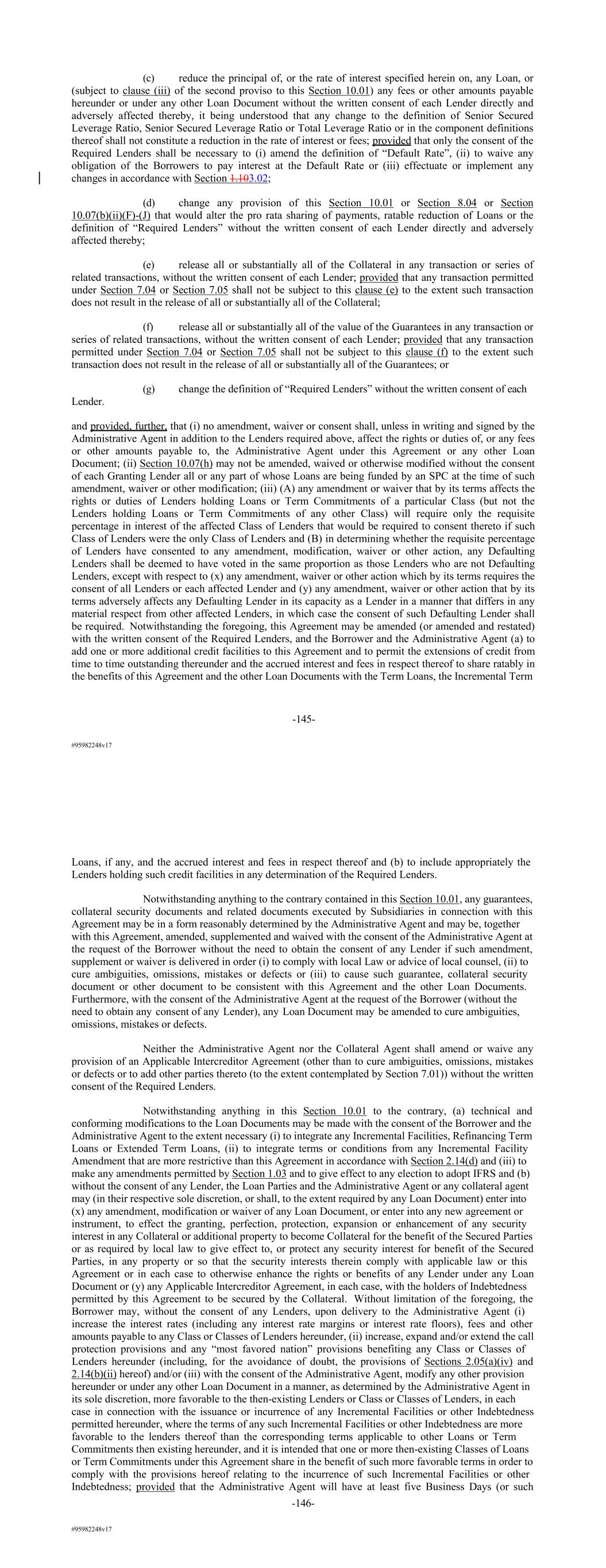 #95982248v17 (c) reduce the principal of, or the rate of interest specified herein on, any Loan, or (subject to clause (iii) of the second proviso to this Section 10.01) any fees or other amounts payable hereunder or under any other Loan Document without the written consent of each Lender directly and adversely affected thereby, it being understood that any change to the definition of Senior Secured Leverage Ratio, Senior Secured Leverage Ratio or Total Leverage Ratio or in the component definitions thereof shall not constitute a reduction in the rate of interest or fees; provided that only the consent of the Required Lenders shall be necessary to (i) amend the definition of “Default Rate”, (ii) to waive any obligation of the Borrowers to pay interest at the Default Rate or (iii) effectuate or implement any changes in accordance with Section 1.103.02; (d) change any provision of this Section 10.01 or Section 8.04 or Section 10.07(b)(ii)(F)-(J) that would alter the pro rata sharing of payments, ratable reduction of Loans or the definition of “Required Lenders” without the written consent of each Lender directly and adversely affected thereby; (e) release all or substantially all of the Collateral in any transaction or series of related transactions, without the written consent of each Lender; provided that any transaction permitted under Section 7.04 or Section 7.05 shall not be subject to this clause (e) to the extent such transaction does not result in the release of all or substantially all of the Collateral; (f) release all or substantially all of the value of the Guarantees in any transaction or series of related transactions, without the written consent of each Lender; provided that any transaction permitted under Section 7.04 or Section 7.05 shall not be subject to this clause (f) to the extent such transaction does not result in the release of all or substantially all of the Guarantees; or (g) change the definition of “Required Lenders” without the written consent of each Lender. and provided, further, that (i) no amendment, waiver or consent shall, unless in writing and signed by the Administrative Agent in addition to the Lenders required above, affect the rights or duties of, or any fees or other amounts payable to, the Administrative Agent under this Agreement or any other Loan Document; (ii) Section 10.07(h) may not be amended, waived or otherwise modified without the consent of each Granting Lender all or any part of whose Loans are being funded by an SPC at the time of such amendment, waiver or other modification; (iii) (A) any amendment or waiver that by its terms affects the rights or duties of Lenders holding Loans or Term Commitments of a particular Class (but not the Lenders holding Loans or Term Commitments of any other Class) will require only the requisite percentage in interest of the affected Class of Lenders that would be required to consent thereto if such Class of Lenders were the only Class of Lenders and (B) in determining whether the requisite percentage of Lenders have consented to any amendment, modification, waiver or other action, any Defaulting Lenders shall be deemed to have voted in the same proportion as those Lenders who are not Defaulting Lenders, except with respect to (x) any amendment, waiver or other action which by its terms requires the consent of all Lenders or each affected Lender and (y) any amendment, waiver or other action that by its terms adversely affects any Defaulting Lender in its capacity as a Lender in a manner that differs in any material respect from other affected Lenders, in which case the consent of such Defaulting Lender shall be required. Notwithstanding the foregoing, this Agreement may be amended (or amended and restated) with the written consent of the Required Lenders, and the Borrower and the Administrative Agent (a) to add one or more additional credit facilities to this Agreement and to permit the extensions of credit from time to time outstanding thereunder and the accrued interest and fees in respect thereof to share ratably in the benefits of this Agreement and the other Loan Documents with the Term Loans, the Incremental Term -145- #95982248v17 Loans, if any, and the accrued interest and fees in respect thereof and (b) to include appropriately the Lenders holding such credit facilities in any determination of the Required Lenders. Notwithstanding anything to the contrary contained in this Section 10.01, any guarantees, collateral security documents and related documents executed by Subsidiaries in connection with this Agreement may be in a form reasonably determined by the Administrative Agent and may be, together with this Agreement, amended, supplemented and waived with the consent of the Administrative Agent at the request of the Borrower without the need to obtain the consent of any Lender if such amendment, supplement or waiver is delivered in order (i) to comply with local Law or advice of local counsel, (ii) to cure ambiguities, omissions, mistakes or defects or (iii) to cause such guarantee, collateral security document or other document to be consistent with this Agreement and the other Loan Documents. Furthermore, with the consent of the Administrative Agent at the request of the Borrower (without the need to obtain any consent of any Lender), any Loan Document may be amended to cure ambiguities, omissions, mistakes or defects. Neither the Administrative Agent nor the Collateral Agent shall amend or waive any provision of an Applicable Intercreditor Agreement (other than to cure ambiguities, omissions, mistakes or defects or to add other parties thereto (to the extent contemplated by Section 7.01)) without the written consent of the Required Lenders. Notwithstanding anything in this Section 10.01 to the contrary, (a) technical and conforming modifications to the Loan Documents may be made with the consent of the Borrower and the Administrative Agent to the extent necessary (i) to integrate 