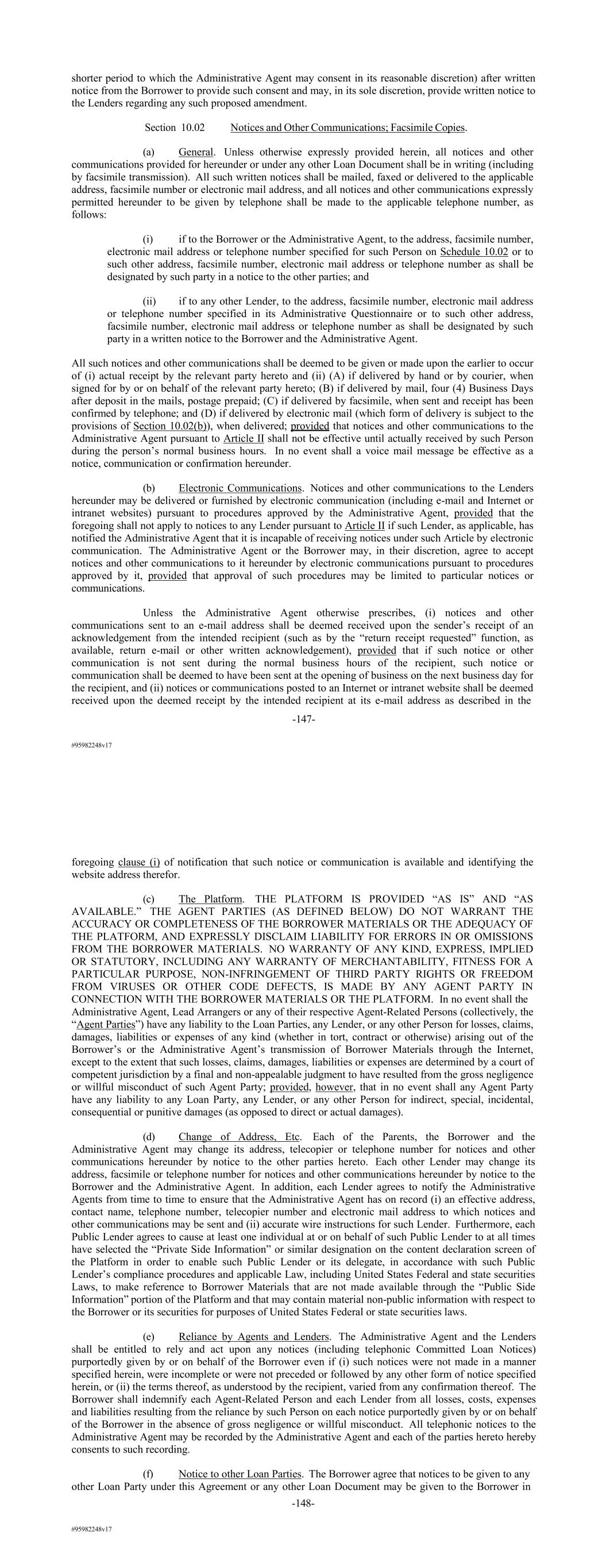 #95982248v17 shorter period to which the Administrative Agent may consent in its reasonable discretion) after written notice from the Borrower to provide such consent and may, in its sole discretion, provide written notice to the Lenders regarding any such proposed amendment. Section 10.02 Notices and Other Communications; Facsimile Copies. (a) General. Unless otherwise expressly provided herein, all notices and other communications provided for hereunder or under any other Loan Document shall be in writing (including by facsimile transmission). All such written notices shall be mailed, faxed or delivered to the applicable address, facsimile number or electronic mail address, and all notices and other communications expressly permitted hereunder to be given by telephone shall be made to the applicable telephone number, as follows: (i) if to the Borrower or the Administrative Agent, to the address, facsimile number, electronic mail address or telephone number specified for such Person on Schedule 10.02 or to such other address, facsimile number, electronic mail address or telephone number as shall be designated by such party in a notice to the other parties; and (ii) if to any other Lender, to the address, facsimile number, electronic mail address or telephone number specified in its Administrative Questionnaire or to such other address, facsimile number, electronic mail address or telephone number as shall be designated by such party in a written notice to the Borrower and the Administrative Agent. All such notices and other communications shall be deemed to be given or made upon the earlier to occur of (i) actual receipt by the relevant party hereto and (ii) (A) if delivered by hand or by courier, when signed for by or on behalf of the relevant party hereto; (B) if delivered by mail, four (4) Business Days after deposit in the mails, postage prepaid; (C) if delivered by facsimile, when sent and receipt has been confirmed by telephone; and (D) if delivered by electronic mail (which form of delivery is subject to the provisions of Section 10.02(b)), when delivered; provided that notices and other communications to the Administrative Agent pursuant to Article II shall not be effective until actually received by such Person during the person’s normal business hours. In no event shall a voice mail message be effective as a notice, communication or confirmation hereunder. (b) Electronic Communications. Notices and other communications to the Lenders hereunder may be delivered or furnished by electronic communication (including e-mail and Internet or intranet websites) pursuant to procedures approved by the Administrative Agent, provided that the foregoing shall not apply to notices to any Lender pursuant to Article II if such Lender, as applicable, has notified the Administrative Agent that it is incapable of receiving notices under such Article by electronic communication. The Administrative Agent or the Borrower may, in their discretion, agree to accept notices and other communications to it hereunder by electronic communications pursuant to procedures approved by it, provided that approval of such procedures may be limited to particular notices or communications. Unless the Administrative Agent otherwise prescribes, (i) notices and other communications sent to an e-mail address shall be deemed received upon the sender’s receipt of an acknowledgement from the intended recipient (such as by the “return receipt requested” function, as available, return e-mail or other written acknowledgement), provided that if such notice or other communication is not sent during the normal business hours of the recipient, such notice or communication shall be deemed to have been sent at the opening of business on the next business day for the recipient, and (ii) notices or communications posted to an Internet or intranet website shall be deemed received upon the deemed receipt by the intended recipient at its e-mail address as described in the -147- #95982248v17 foregoing clause (i) of notification that such notice or communication is available and identifying the website address therefor. (c) The Platform. THE PLATFORM IS PROVIDED “AS IS” AND “AS AVAILABLE.” THE AGENT PARTIES (AS DEFINED BELOW) DO NOT WARRANT THE ACCURACY OR COMPLETENESS OF THE BORROWER MATERIALS OR THE ADEQUACY OF THE PLATFORM, AND EXPRESSLY DISCLAIM LIABILITY FOR ERRORS IN OR OMISSIONS FROM THE BORROWER MATERIALS. NO WARRANTY OF ANY KIND, EXPRESS, IMPLIED OR STATUTORY, INCLUDING ANY WARRANTY OF MERCHANTABILITY, FITNESS FOR A PARTICULAR PURPOSE, NON-INFRINGEMENT OF THIRD PARTY RIGHTS OR FREEDOM FROM VIRUSES OR OTHER CODE DEFECTS, IS MADE BY ANY AGENT PARTY IN CONNECTION WITH THE BORROWER MATERIALS OR THE PLATFORM. In no event shall the Administrative Agent, Lead Arrangers or any of their respective Agent-Related Persons (collectively, the “Agent Parties”) have any liability to the Loan Parties, any Lender, or any other Person for losses, claims, damages, liabilities or expenses of any kind (whether in tort, contract or otherwise) arising out of the Borrower’s or the Administrative Agent’s transmission of Borrower Materials through the Internet, except to the extent that such losses, claims, damages, liabilities or expenses are determined by a court of competent jurisdiction by a final and non-appealable judgment to have resulted from the gross negligence or willful misconduct of such Agent Party; provided, however, that in no event shall any Agent Party have any liability to any Loan Party, any Lender, or any other Person for indirect, special, incidental, consequential or punitive damages (as opposed to direct or actual damages). (d) Change of Address, Etc. Each of the Parents, the Borrower and the Administrative Agent may change its address, telecopier or telephone number for notices and other communications hereunder by notice to the other parties hereto. Each other Lender may change its address, facsimile or tel