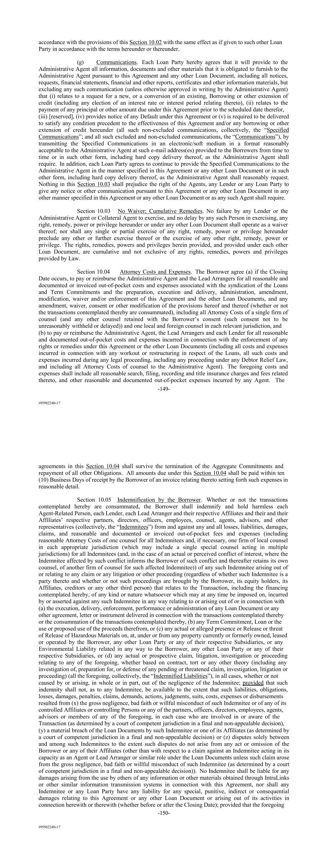 #95982248v17 accordance with the provisions of this Section 10.02 with the same effect as if given to such other Loan Party in accordance with the terms hereunder or thereunder. (g) Communications. Each Loan Party hereby agrees that it will provide to the Administrative Agent all information, documents and other materials that it is obligated to furnish to the Administrative Agent pursuant to this Agreement and any other Loan Document, including all notices, requests, financial statements, financial and other reports, certificates and other information materials, but excluding any such communication (unless otherwise approved in writing by the Administrative Agent) that (i) relates to a request for a new, or a conversion of an existing, Borrowing or other extension of credit (including any election of an interest rate or interest period relating thereto), (ii) relates to the payment of any principal or other amount due under this Agreement prior to the scheduled date therefor, (iii) [reserved], (iv) provides notice of any Default under this Agreement or (v) is required to be delivered to satisfy any condition precedent to the effectiveness of this Agreement and/or any borrowing or other extension of credit hereunder (all such non-excluded communications, collectively, the “Specified Communications”; and all such excluded and non-excluded communications, the “Communications”), by transmitting the Specified Communications in an electronic/soft medium in a format reasonably acceptable to the Administrative Agent at such e-mail address(es) provided to the Borrowers from time to time or in such other form, including hard copy delivery thereof, as the Administrative Agent shall require. In addition, each Loan Party agrees to continue to provide the Specified Communications to the Administrative Agent in the manner specified in this Agreement or any other Loan Document or in such other form, including hard copy delivery thereof, as the Administrative Agent shall reasonably request. Nothing in this Section 10.03 shall prejudice the right of the Agents, any Lender or any Loan Party to give any notice or other communication pursuant to this Agreement or any other Loan Document in any other manner specified in this Agreement or any other Loan Document or as any such Agent shall require. Section 10.03 No Waiver; Cumulative Remedies. No failure by any Lender or the Administrative Agent or Collateral Agent to exercise, and no delay by any such Person in exercising, any right, remedy, power or privilege hereunder or under any other Loan Document shall operate as a waiver thereof; nor shall any single or partial exercise of any right, remedy, power or privilege hereunder preclude any other or further exercise thereof or the exercise of any other right, remedy, power or privilege. The rights, remedies, powers and privileges herein provided, and provided under each other Loan Document, are cumulative and not exclusive of any rights, remedies, powers and privileges provided by Law. Section 10.04 Attorney Costs and Expenses. The Borrower agree (a) if the Closing Date occurs, to pay or reimburse the Administrative Agent and the Lead Arrangers for all reasonable and documented or invoiced out-of-pocket costs and expenses associated with the syndication of the Loans and Term Commitments and the preparation, execution and delivery, administration, amendment, modification, waiver and/or enforcement of this Agreement and the other Loan Documents, and any amendment, waiver, consent or other modification of the provisions hereof and thereof (whether or not the transactions contemplated thereby are consummated), including all Attorney Costs of a single firm of counsel (and any other counsel retained with the Borrower’s consent (such consent not to be unreasonably withheld or delayed)) and one local and foreign counsel in each relevant jurisdiction, and (b) to pay or reimburse the Administrative Agent, the Lead Arrangers and each Lender for all reasonable and documented out-of-pocket costs and expenses incurred in connection with the enforcement of any rights or remedies under this Agreement or the other Loan Documents (including all costs and expenses incurred in connection with any workout or restructuring in respect of the Loans, all such costs and expenses incurred during any legal proceeding, including any proceeding under any Debtor Relief Law, and including all Attorney Costs of counsel to the Administrative Agent). The foregoing costs and expenses shall include all reasonable search, filing, recording and title insurance charges and fees related thereto, and other reasonable and documented out-of-pocket expenses incurred by any Agent. The -149- #95982248v17 agreements in this Section 10.04 shall survive the termination of the Aggregate Commitments and repayment of all other Obligations. All amounts due under this Section 10.04 shall be paid within ten (10) Business Days of receipt by the Borrower of an invoice relating thereto setting forth such expenses in reasonable detail. Section 10.05 Indemnification by the Borrower. Whether or not the transactions contemplated hereby are consummated, the Borrower shall indemnify and hold harmless each Agent-Related Person, each Lender, each Lead Arranger and their respective Affiliates and their and their Affiliates’ respective partners, directors, officers, employees, counsel, agents, advisors, and other representatives (collectively, the “Indemnitees”) from and against any and all losses, liabilities, damages, claims, and reasonable and documented or invoiced out-of-pocket fees and expenses (including reasonable Attorney Costs of one counsel for all Indemnitees and, if necessary, one firm of local counsel in each appropriate jurisdiction (which may include a single special counsel acting in multiple jurisdictions) for all Indemnitees (and, in the case of an actual or perceived conflict of interest, where the Indemnitee affected by such conflict informs