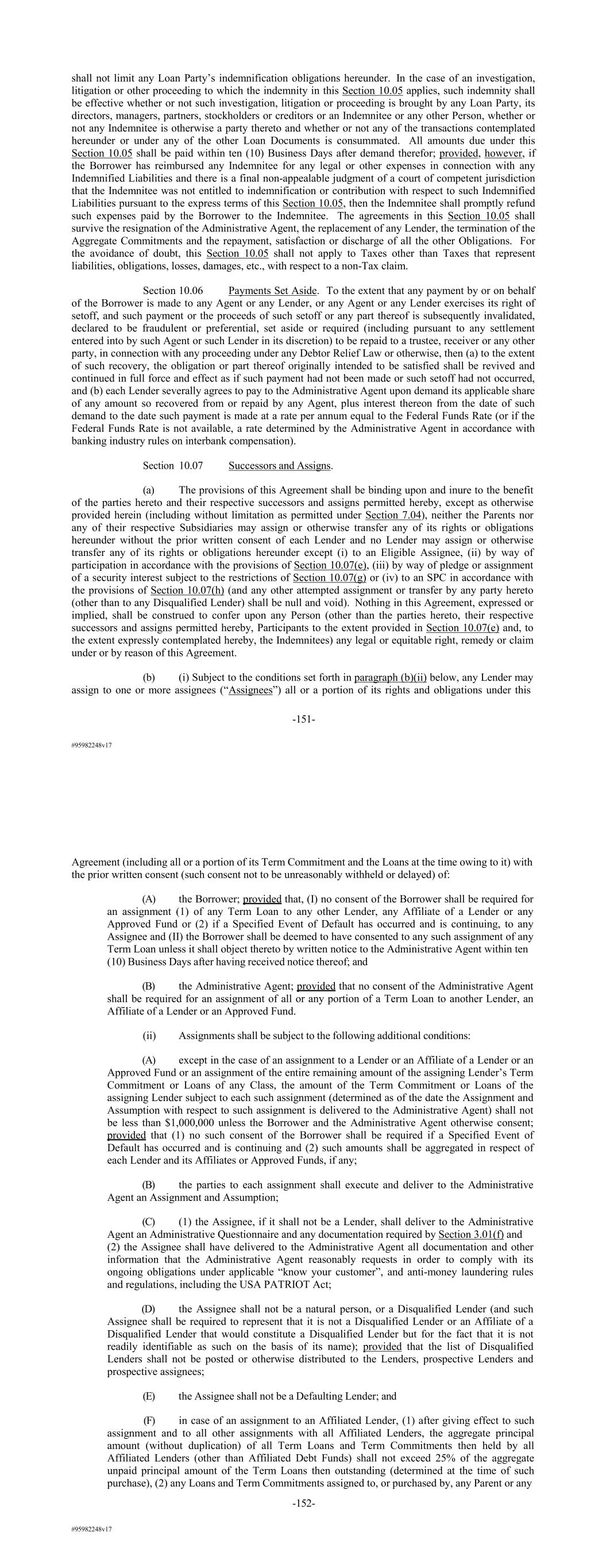 #95982248v17 shall not limit any Loan Party’s indemnification obligations hereunder. In the case of an investigation, litigation or other proceeding to which the indemnity in this Section 10.05 applies, such indemnity shall be effective whether or not such investigation, litigation or proceeding is brought by any Loan Party, its directors, managers, partners, stockholders or creditors or an Indemnitee or any other Person, whether or not any Indemnitee is otherwise a party thereto and whether or not any of the transactions contemplated hereunder or under any of the other Loan Documents is consummated. All amounts due under this Section 10.05 shall be paid within ten (10) Business Days after demand therefor; provided, however, if the Borrower has reimbursed any Indemnitee for any legal or other expenses in connection with any Indemnified Liabilities and there is a final non-appealable judgment of a court of competent jurisdiction that the Indemnitee was not entitled to indemnification or contribution with respect to such Indemnified Liabilities pursuant to the express terms of this Section 10.05, then the Indemnitee shall promptly refund such expenses paid by the Borrower to the Indemnitee. The agreements in this Section 10.05 shall survive the resignation of the Administrative Agent, the replacement of any Lender, the termination of the Aggregate Commitments and the repayment, satisfaction or discharge of all the other Obligations. For the avoidance of doubt, this Section 10.05 shall not apply to Taxes other than Taxes that represent liabilities, obligations, losses, damages, etc., with respect to a non-Tax claim. Section 10.06 Payments Set Aside. To the extent that any payment by or on behalf of the Borrower is made to any Agent or any Lender, or any Agent or any Lender exercises its right of setoff, and such payment or the proceeds of such setoff or any part thereof is subsequently invalidated, declared to be fraudulent or preferential, set aside or required (including pursuant to any settlement entered into by such Agent or such Lender in its discretion) to be repaid to a trustee, receiver or any other party, in connection with any proceeding under any Debtor Relief Law or otherwise, then (a) to the extent of such recovery, the obligation or part thereof originally intended to be satisfied shall be revived and continued in full force and effect as if such payment had not been made or such setoff had not occurred, and (b) each Lender severally agrees to pay to the Administrative Agent upon demand its applicable share of any amount so recovered from or repaid by any Agent, plus interest thereon from the date of such demand to the date such payment is made at a rate per annum equal to the Federal Funds Rate (or if the Federal Funds Rate is not available, a rate determined by the Administrative Agent in accordance with banking industry rules on interbank compensation). Section 10.07 Successors and Assigns. (a) The provisions of this Agreement shall be binding upon and inure to the benefit of the parties hereto and their respective successors and assigns permitted hereby, except as otherwise provided herein (including without limitation as permitted under Section 7.04), neither the Parents nor any of their respective Subsidiaries may assign or otherwise transfer any of its rights or obligations hereunder without the prior written consent of each Lender and no Lender may assign or otherwise transfer any of its rights or obligations hereunder except (i) to an Eligible Assignee, (ii) by way of participation in accordance with the provisions of Section 10.07(e), (iii) by way of pledge or assignment of a security interest subject to the restrictions of Section 10.07(g) or (iv) to an SPC in accordance with the provisions of Section 10.07(h) (and any other attempted assignment or transfer by any party hereto (other than to any Disqualified Lender) shall be null and void). Nothing in this Agreement, expressed or implied, shall be construed to confer upon any Person (other than the parties hereto, their respective successors and assigns permitted hereby, Participants to the extent provided in Section 10.07(e) and, to the extent expressly contemplated hereby, the Indemnitees) any legal or equitable right, remedy or claim under or by reason of this Agreement. (b) (i) Subject to the conditions set forth in paragraph (b)(ii) below, any Lender may assign to one or more assignees (“Assignees”) all or a portion of its rights and obligations under this -151- #95982248v17 Agreement (including all or a portion of its Term Commitment and the Loans at the time owing to it) with the prior written consent (such consent not to be unreasonably withheld or delayed) of: (A) the Borrower; provided that, (I) no consent of the Borrower shall be required for an assignment (1) of any Term Loan to any other Lender, any Affiliate of a Lender or any Approved Fund or (2) if a Specified Event of Default has occurred and is continuing, to any Assignee and (II) the Borrower shall be deemed to have consented to any such assignment of any Term Loan unless it shall object thereto by written notice to the Administrative Agent within ten (10) Business Days after having received notice thereof; and (B) the Administrative Agent; provided that no consent of the Administrative Agent shall be required for an assignment of all or any portion of a Term Loan to another Lender, an Affiliate of a Lender or an Approved Fund. (ii) Assignments shall be subject to the following additional conditions: (A) except in the case of an assignment to a Lender or an Affiliate of a Lender or an Approved Fund or an assignment of the entire remaining amount of the assigning Lender’s Term Commitment or Loans of any Class, the amount of the Term Commitment or Loans of the assigning Lender subject to each such assignment (determined as of the date the Assignment and Assumption with respect to such assignment is delivered to the Administrative Agent) shal