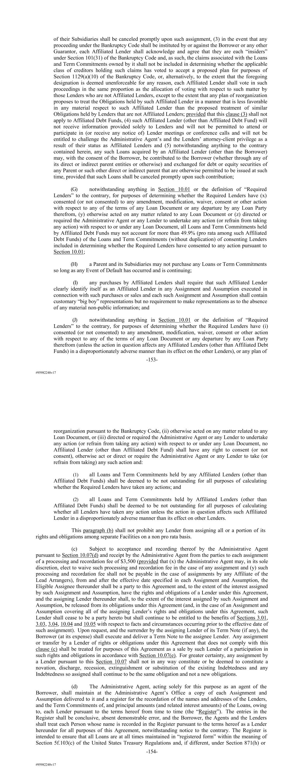 #95982248v17 of their Subsidiaries shall be canceled promptly upon such assignment, (3) in the event that any proceeding under the Bankruptcy Code shall be instituted by or against the Borrower or any other Guarantor, each Affiliated Lender shall acknowledge and agree that they are each “insiders” under Section 101(31) of the Bankruptcy Code and, as such, the claims associated with the Loans and Term Commitments owned by it shall not be included in determining whether the applicable class of creditors holding such claims has voted to accept a proposed plan for purposes of Section 1129(a)(10) of the Bankruptcy Code, or, alternatively, to the extent that the foregoing designation is deemed unenforceable for any reason, each Affiliated Lender shall vote in such proceedings in the same proportion as the allocation of voting with respect to such matter by those Lenders who are not Affiliated Lenders, except to the extent that any plan of reorganization proposes to treat the Obligations held by such Affiliated Lender in a manner that is less favorable in any material respect to such Affiliated Lender than the proposed treatment of similar Obligations held by Lenders that are not Affiliated Lenders; provided that this clause (3) shall not apply to Affiliated Debt Funds, (4) such Affiliated Lender (other than Affiliated Debt Fund) will not receive information provided solely to Lenders and will not be permitted to attend or participate in (or receive any notice of) Lender meetings or conference calls and will not be entitled to challenge the Administrative Agent’s and the Lenders’ attorney-client privilege as a result of their status as Affiliated Lenders and (5) notwithstanding anything to the contrary contained herein, any such Loans acquired by an Affiliated Lender (other than the Borrower) may, with the consent of the Borrower, be contributed to the Borrower (whether through any of its direct or indirect parent entities or otherwise) and exchanged for debt or equity securities of any Parent or such other direct or indirect parent that are otherwise permitted to be issued at such time, provided that such Loans shall be canceled promptly upon such contribution; (G) notwithstanding anything in Section 10.01 or the definition of “Required Lenders” to the contrary, for purposes of determining whether the Required Lenders have (x) consented (or not consented) to any amendment, modification, waiver, consent or other action with respect to any of the terms of any Loan Document or any departure by any Loan Party therefrom, (y) otherwise acted on any matter related to any Loan Document or (z) directed or required the Administrative Agent or any Lender to undertake any action (or refrain from taking any action) with respect to or under any Loan Document, all Loans and Term Commitments held by Affiliated Debt Funds may not account for more than 49.9% (pro rata among such Affiliated Debt Funds) of the Loans and Term Commitments (without duplication) of consenting Lenders included in determining whether the Required Lenders have consented to any action pursuant to Section 10.01; (H) a Parent and its Subsidiaries may not purchase any Loans or Term Commitments so long as any Event of Default has occurred and is continuing; (I) any purchases by Affiliated Lenders shall require that such Affiliated Lender clearly identify itself as an Affiliated Lender in any Assignment and Assumption executed in connection with such purchases or sales and each such Assignment and Assumption shall contain customary “big boy” representations but no requirement to make representations as to the absence of any material non-public information; and (J) notwithstanding anything in Section 10.01 or the definition of “Required Lenders” to the contrary, for purposes of determining whether the Required Lenders have (i) consented (or not consented) to any amendment, modification, waiver, consent or other action with respect to any of the terms of any Loan Document or any departure by any Loan Party therefrom (unless the action in question affects any Affiliated Lenders (other than Affiliated Debt Funds) in a disproportionately adverse manner than its effect on the other Lenders), or any plan of -153- #95982248v17 reorganization pursuant to the Bankruptcy Code, (ii) otherwise acted on any matter related to any Loan Document, or (iii) directed or required the Administrative Agent or any Lender to undertake any action (or refrain from taking any action) with respect to or under any Loan Document, no Affiliated Lender (other than Affiliated Debt Fund) shall have any right to consent (or not consent), otherwise act or direct or require the Administrative Agent or any Lender to take (or refrain from taking) any such action and: (1) all Loans and Term Commitments held by any Affiliated Lenders (other than Affiliated Debt Funds) shall be deemed to be not outstanding for all purposes of calculating whether the Required Lenders have taken any actions; and (2) all Loans and Term Commitments held by Affiliated Lenders (other than Affiliated Debt Funds) shall be deemed to be not outstanding for all purposes of calculating whether all Lenders have taken any action unless the action in question affects such Affiliated Lender in a disproportionately adverse manner than its effect on other Lenders. This paragraph (b) shall not prohibit any Lender from assigning all or a portion of its rights and obligations among separate Facilities on a non pro rata basis. (c) Subject to acceptance and recording thereof by the Administrative Agent pursuant to Section 10.07(d) and receipt by the Administrative Agent from the parties to each assignment of a processing and recordation fee of $3,500 (provided that (x) the Administrative Agent may, in its sole discretion, elect to waive such processing and recordation fee in the case of any assignment and (y) such processing and recordation fee shall not be payable in the case of assignments by any Affil
