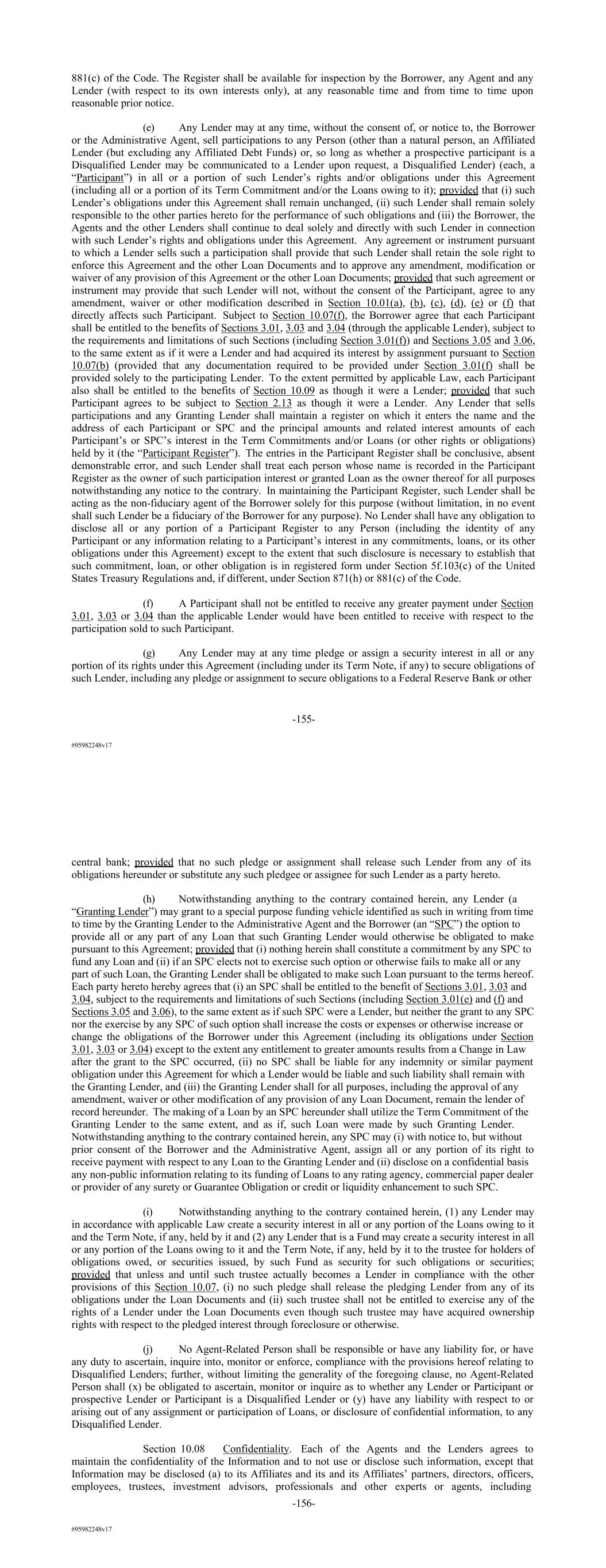 #95982248v17 881(c) of the Code. The Register shall be available for inspection by the Borrower, any Agent and any Lender (with respect to its own interests only), at any reasonable time and from time to time upon reasonable prior notice. (e) Any Lender may at any time, without the consent of, or notice to, the Borrower or the Administrative Agent, sell participations to any Person (other than a natural person, an Affiliated Lender (but excluding any Affiliated Debt Funds) or, so long as whether a prospective participant is a Disqualified Lender may be communicated to a Lender upon request, a Disqualified Lender) (each, a “Participant”) in all or a portion of such Lender’s rights and/or obligations under this Agreement (including all or a portion of its Term Commitment and/or the Loans owing to it); provided that (i) such Lender’s obligations under this Agreement shall remain unchanged, (ii) such Lender shall remain solely responsible to the other parties hereto for the performance of such obligations and (iii) the Borrower, the Agents and the other Lenders shall continue to deal solely and directly with such Lender in connection with such Lender’s rights and obligations under this Agreement. Any agreement or instrument pursuant to which a Lender sells such a participation shall provide that such Lender shall retain the sole right to enforce this Agreement and the other Loan Documents and to approve any amendment, modification or waiver of any provision of this Agreement or the other Loan Documents; provided that such agreement or instrument may provide that such Lender will not, without the consent of the Participant, agree to any amendment, waiver or other modification described in Section 10.01(a), (b), (c), (d), (e) or (f) that directly affects such Participant. Subject to Section 10.07(f), the Borrower agree that each Participant shall be entitled to the benefits of Sections 3.01, 3.03 and 3.04 (through the applicable Lender), subject to the requirements and limitations of such Sections (including Section 3.01(f)) and Sections 3.05 and 3.06, to the same extent as if it were a Lender and had acquired its interest by assignment pursuant to Section 10.07(b) (provided that any documentation required to be provided under Section 3.01(f) shall be provided solely to the participating Lender. To the extent permitted by applicable Law, each Participant also shall be entitled to the benefits of Section 10.09 as though it were a Lender; provided that such Participant agrees to be subject to Section 2.13 as though it were a Lender. Any Lender that sells participations and any Granting Lender shall maintain a register on which it enters the name and the address of each Participant or SPC and the principal amounts and related interest amounts of each Participant’s or SPC’s interest in the Term Commitments and/or Loans (or other rights or obligations) held by it (the “Participant Register”). The entries in the Participant Register shall be conclusive, absent demonstrable error, and such Lender shall treat each person whose name is recorded in the Participant Register as the owner of such participation interest or granted Loan as the owner thereof for all purposes notwithstanding any notice to the contrary. In maintaining the Participant Register, such Lender shall be acting as the non-fiduciary agent of the Borrower solely for this purpose (without limitation, in no event shall such Lender be a fiduciary of the Borrower for any purpose). No Lender shall have any obligation to disclose all or any portion of a Participant Register to any Person (including the identity of any Participant or any information relating to a Participant’s interest in any commitments, loans, or its other obligations under this Agreement) except to the extent that such disclosure is necessary to establish that such commitment, loan, or other obligation is in registered form under Section 5f.103(c) of the United States Treasury Regulations and, if different, under Section 871(h) or 881(c) of the Code. (f) A Participant shall not be entitled to receive any greater payment under Section 3.01, 3.03 or 3.04 than the applicable Lender would have been entitled to receive with respect to the participation sold to such Participant. (g) Any Lender may at any time pledge or assign a security interest in all or any portion of its rights under this Agreement (including under its Term Note, if any) to secure obligations of such Lender, including any pledge or assignment to secure obligations to a Federal Reserve Bank or other -155- #95982248v17 central bank; provided that no such pledge or assignment shall release such Lender from any of its obligations hereunder or substitute any such pledgee or assignee for such Lender as a party hereto. (h) Notwithstanding anything to the contrary contained herein, any Lender (a “Granting Lender”) may grant to a special purpose funding vehicle identified as such in writing from time to time by the Granting Lender to the Administrative Agent and the Borrower (an “SPC”) the option to provide all or any part of any Loan that such Granting Lender would otherwise be obligated to make pursuant to this Agreement; provided that (i) nothing herein shall constitute a commitment by any SPC to fund any Loan and (ii) if an SPC elects not to exercise such option or otherwise fails to make all or any part of such Loan, the Granting Lender shall be obligated to make such Loan pursuant to the terms hereof. Each party hereto hereby agrees that (i) an SPC shall be entitled to the benefit of Sections 3.01, 3.03 and 3.04, subject to the requirements and limitations of such Sections (including Section 3.01(e) and (f) and Sections 3.05 and 3.06), to the same extent as if such SPC were a Lender, but neither the grant to any SPC nor the exercise by any SPC of such option shall increase the costs or expenses or otherwise increase or change the obligations of the Borrower under this Agreement (includ