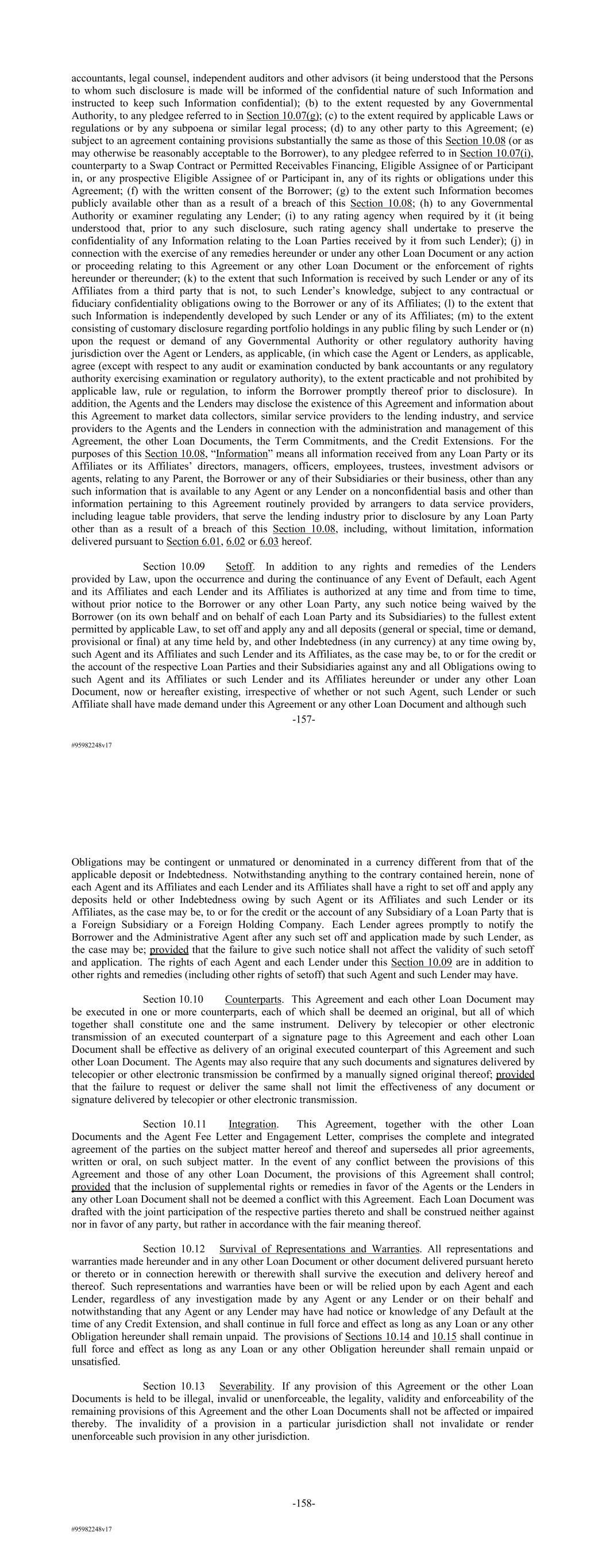 #95982248v17 accountants, legal counsel, independent auditors and other advisors (it being understood that the Persons to whom such disclosure is made will be informed of the confidential nature of such Information and instructed to keep such Information confidential); (b) to the extent requested by any Governmental Authority, to any pledgee referred to in Section 10.07(g); (c) to the extent required by applicable Laws or regulations or by any subpoena or similar legal process; (d) to any other party to this Agreement; (e) subject to an agreement containing provisions substantially the same as those of this Section 10.08 (or as may otherwise be reasonably acceptable to the Borrower), to any pledgee referred to in Section 10.07(i), counterparty to a Swap Contract or Permitted Receivables Financing, Eligible Assignee of or Participant in, or any prospective Eligible Assignee of or Participant in, any of its rights or obligations under this Agreement; (f) with the written consent of the Borrower; (g) to the extent such Information becomes publicly available other than as a result of a breach of this Section 10.08; (h) to any Governmental Authority or examiner regulating any Lender; (i) to any rating agency when required by it (it being understood that, prior to any such disclosure, such rating agency shall undertake to preserve the confidentiality of any Information relating to the Loan Parties received by it from such Lender); (j) in connection with the exercise of any remedies hereunder or under any other Loan Document or any action or proceeding relating to this Agreement or any other Loan Document or the enforcement of rights hereunder or thereunder; (k) to the extent that such Information is received by such Lender or any of its Affiliates from a third party that is not, to such Lender’s knowledge, subject to any contractual or fiduciary confidentiality obligations owing to the Borrower or any of its Affiliates; (l) to the extent that such Information is independently developed by such Lender or any of its Affiliates; (m) to the extent consisting of customary disclosure regarding portfolio holdings in any public filing by such Lender or (n) upon the request or demand of any Governmental Authority or other regulatory authority having jurisdiction over the Agent or Lenders, as applicable, (in which case the Agent or Lenders, as applicable, agree (except with respect to any audit or examination conducted by bank accountants or any regulatory authority exercising examination or regulatory authority), to the extent practicable and not prohibited by applicable law, rule or regulation, to inform the Borrower promptly thereof prior to disclosure). In addition, the Agents and the Lenders may disclose the existence of this Agreement and information about this Agreement to market data collectors, similar service providers to the lending industry, and service providers to the Agents and the Lenders in connection with the administration and management of this Agreement, the other Loan Documents, the Term Commitments, and the Credit Extensions. For the purposes of this Section 10.08, “Information” means all information received from any Loan Party or its Affiliates or its Affiliates’ directors, managers, officers, employees, trustees, investment advisors or agents, relating to any Parent, the Borrower or any of their Subsidiaries or their business, other than any such information that is available to any Agent or any Lender on a nonconfidential basis and other than information pertaining to this Agreement routinely provided by arrangers to data service providers, including league table providers, that serve the lending industry prior to disclosure by any Loan Party other than as a result of a breach of this Section 10.08, including, without limitation, information delivered pursuant to Section 6.01, 6.02 or 6.03 hereof. Section 10.09 Setoff. In addition to any rights and remedies of the Lenders provided by Law, upon the occurrence and during the continuance of any Event of Default, each Agent and its Affiliates and each Lender and its Affiliates is authorized at any time and from time to time, without prior notice to the Borrower or any other Loan Party, any such notice being waived by the Borrower (on its own behalf and on behalf of each Loan Party and its Subsidiaries) to the fullest extent permitted by applicable Law, to set off and apply any and all deposits (general or special, time or demand, provisional or final) at any time held by, and other Indebtedness (in any currency) at any time owing by, such Agent and its Affiliates and such Lender and its Affiliates, as the case may be, to or for the credit or the account of the respective Loan Parties and their Subsidiaries against any and all Obligations owing to such Agent and its Affiliates or such Lender and its Affiliates hereunder or under any other Loan Document, now or hereafter existing, irrespective of whether or not such Agent, such Lender or such Affiliate shall have made demand under this Agreement or any other Loan Document and although such -157- #95982248v17 Obligations may be contingent or unmatured or denominated in a currency different from that of the applicable deposit or Indebtedness. Notwithstanding anything to the contrary contained herein, none of each Agent and its Affiliates and each Lender and its Affiliates shall have a right to set off and apply any deposits held or other Indebtedness owing by such Agent or its Affiliates and such Lender or its Affiliates, as the case may be, to or for the credit or the account of any Subsidiary of a Loan Party that is a Foreign Subsidiary or a Foreign Holding Company. Each Lender agrees promptly to notify the Borrower and the Administrative Agent after any such set off and application made by such Lender, as the case may be; provided that the failure to give such notice shall not affect the validity of such setoff and application. The rights of each Agent and each Lender under