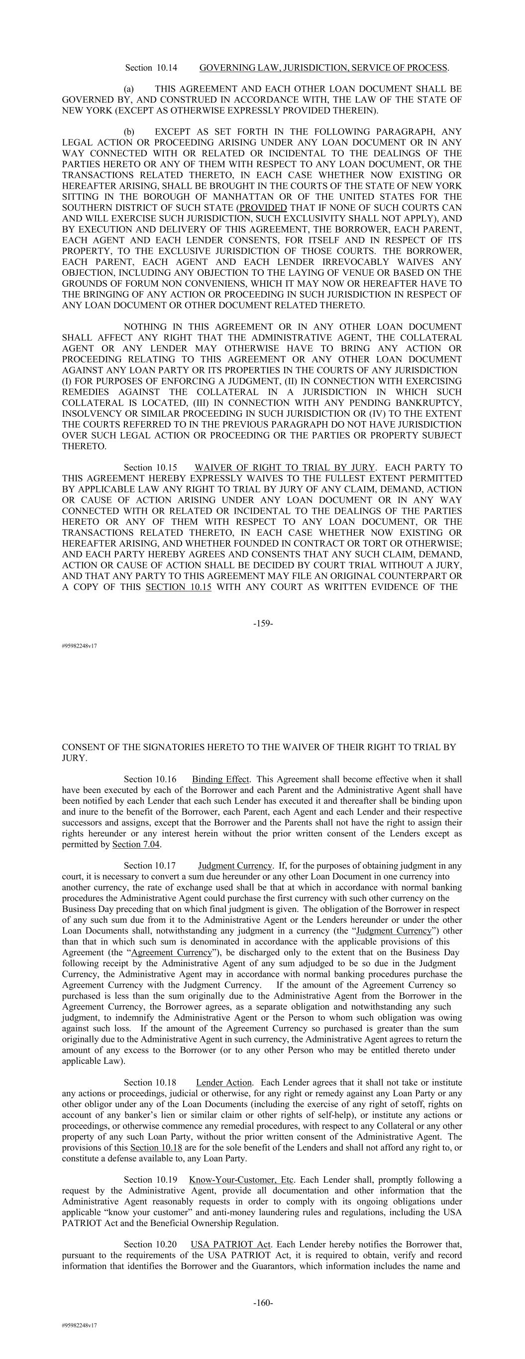 #95982248v17 Section 10.14 GOVERNING LAW, JURISDICTION, SERVICE OF PROCESS. (a) THIS AGREEMENT AND EACH OTHER LOAN DOCUMENT SHALL BE GOVERNED BY, AND CONSTRUED IN ACCORDANCE WITH, THE LAW OF THE STATE OF NEW YORK (EXCEPT AS OTHERWISE EXPRESSLY PROVIDED THEREIN). (b) EXCEPT AS SET FORTH IN THE FOLLOWING PARAGRAPH, ANY LEGAL ACTION OR PROCEEDING ARISING UNDER ANY LOAN DOCUMENT OR IN ANY WAY CONNECTED WITH OR RELATED OR INCIDENTAL TO THE DEALINGS OF THE PARTIES HERETO OR ANY OF THEM WITH RESPECT TO ANY LOAN DOCUMENT, OR THE TRANSACTIONS RELATED THERETO, IN EACH CASE WHETHER NOW EXISTING OR HEREAFTER ARISING, SHALL BE BROUGHT IN THE COURTS OF THE STATE OF NEW YORK SITTING IN THE BOROUGH OF MANHATTAN OR OF THE UNITED STATES FOR THE SOUTHERN DISTRICT OF SUCH STATE (PROVIDED THAT IF NONE OF SUCH COURTS CAN AND WILL EXERCISE SUCH JURISDICTION, SUCH EXCLUSIVITY SHALL NOT APPLY), AND BY EXECUTION AND DELIVERY OF THIS AGREEMENT, THE BORROWER, EACH PARENT, EACH AGENT AND EACH LENDER CONSENTS, FOR ITSELF AND IN RESPECT OF ITS PROPERTY, TO THE EXCLUSIVE JURISDICTION OF THOSE COURTS. THE BORROWER, EACH PARENT, EACH AGENT AND EACH LENDER IRREVOCABLY WAIVES ANY OBJECTION, INCLUDING ANY OBJECTION TO THE LAYING OF VENUE OR BASED ON THE GROUNDS OF FORUM NON CONVENIENS, WHICH IT MAY NOW OR HEREAFTER HAVE TO THE BRINGING OF ANY ACTION OR PROCEEDING IN SUCH JURISDICTION IN RESPECT OF ANY LOAN DOCUMENT OR OTHER DOCUMENT RELATED THERETO. NOTHING IN THIS AGREEMENT OR IN ANY OTHER LOAN DOCUMENT SHALL AFFECT ANY RIGHT THAT THE ADMINISTRATIVE AGENT, THE COLLATERAL AGENT OR ANY LENDER MAY OTHERWISE HAVE TO BRING ANY ACTION OR PROCEEDING RELATING TO THIS AGREEMENT OR ANY OTHER LOAN DOCUMENT AGAINST ANY LOAN PARTY OR ITS PROPERTIES IN THE COURTS OF ANY JURISDICTION (I) FOR PURPOSES OF ENFORCING A JUDGMENT, (II) IN CONNECTION WITH EXERCISING REMEDIES AGAINST THE COLLATERAL IN A JURISDICTION IN WHICH SUCH COLLATERAL IS LOCATED, (III) IN CONNECTION WITH ANY PENDING BANKRUPTCY, INSOLVENCY OR SIMILAR PROCEEDING IN SUCH JURISDICTION OR (IV) TO THE EXTENT THE COURTS REFERRED TO IN THE PREVIOUS PARAGRAPH DO NOT HAVE JURISDICTION OVER SUCH LEGAL ACTION OR PROCEEDING OR THE PARTIES OR PROPERTY SUBJECT THERETO. Section 10.15 WAIVER OF RIGHT TO TRIAL BY JURY. EACH PARTY TO THIS AGREEMENT HEREBY EXPRESSLY WAIVES TO THE FULLEST EXTENT PERMITTED BY APPLICABLE LAW ANY RIGHT TO TRIAL BY JURY OF ANY CLAIM, DEMAND, ACTION OR CAUSE OF ACTION ARISING UNDER ANY LOAN DOCUMENT OR IN ANY WAY CONNECTED WITH OR RELATED OR INCIDENTAL TO THE DEALINGS OF THE PARTIES HERETO OR ANY OF THEM WITH RESPECT TO ANY LOAN DOCUMENT, OR THE TRANSACTIONS RELATED THERETO, IN EACH CASE WHETHER NOW EXISTING OR HEREAFTER ARISING, AND WHETHER FOUNDED IN CONTRACT OR TORT OR OTHERWISE; AND EACH PARTY HEREBY AGREES AND CONSENTS THAT ANY SUCH CLAIM, DEMAND, ACTION OR CAUSE OF ACTION SHALL BE DECIDED BY COURT TRIAL WITHOUT A JURY, AND THAT ANY PARTY TO THIS AGREEMENT MAY FILE AN ORIGINAL COUNTERPART OR A COPY OF THIS SECTION 10.15 WITH ANY COURT AS WRITTEN EVIDENCE OF THE -159- #95982248v17 CONSENT OF THE SIGNATORIES HERETO TO THE WAIVER OF THEIR RIGHT TO TRIAL BY JURY. Section 10.16 Binding Effect. This Agreement shall become effective when it shall have been executed by each of the Borrower and each Parent and the Administrative Agent shall have been notified by each Lender that each such Lender has executed it and thereafter shall be binding upon and inure to the benefit of the Borrower, each Parent, each Agent and each Lender and their respective successors and assigns, except that the Borrower and the Parents shall not have the right to assign their rights hereunder or any interest herein without the prior written consent of the Lenders except as permitted by Section 7.04. Section 10.17 Judgment Currency. If, for the purposes of obtaining judgment in any court, it is necessary to convert a sum due hereunder or any other Loan Document in one currency into another currency, the rate of exchange used shall be that at which in accordance with normal banking procedures the Administrative Agent could purchase the first currency with such other currency on the Business Day preceding that on which final judgment is given. The obligation of the Borrower in respect of any such sum due from it to the Administrative Agent or the Lenders hereunder or under the other Loan Documents shall, notwithstanding any judgment in a currency (the “Judgment Currency”) other than that in which such sum is denominated in accordance with the applicable provisions of this Agreement (the “Agreement Currency”), be discharged only to the extent that on the Business Day following receipt by the Administrative Agent of any sum adjudged to be so due in the Judgment Currency, the Administrative Agent may in accordance with normal banking procedures purchase the Agreement Currency with the Judgment Currency. If the amount of the Agreement Currency so purchased is less than the sum originally due to the Administrative Agent from the Borrower in the Agreement Currency, the Borrower agrees, as a separate obligation and notwithstanding any such judgment, to indemnify the Administrative Agent or the Person to whom such obligation was owing against such loss. If the amount of the Agreement Currency so purchased is greater than the sum originally due to the Administrative Agent in such currency, the Administrative Agent agrees to return the amount of any excess to the Borrower (or to any other Person who may be entitled thereto under applicable Law). Section 10.18 Lender Action. Each Lender agrees that it shall not take or institute any actions or proceedings, judicial or otherwise, for any right or remedy against any Loan Party or any other obligor under any of the Loan Documents (including the exercise of any right of setoff, rights on account of any banker’s lien or similar claim or other rights of self-help), or institute any actions or proceedings, or otherwise commence any remedial procedures, 