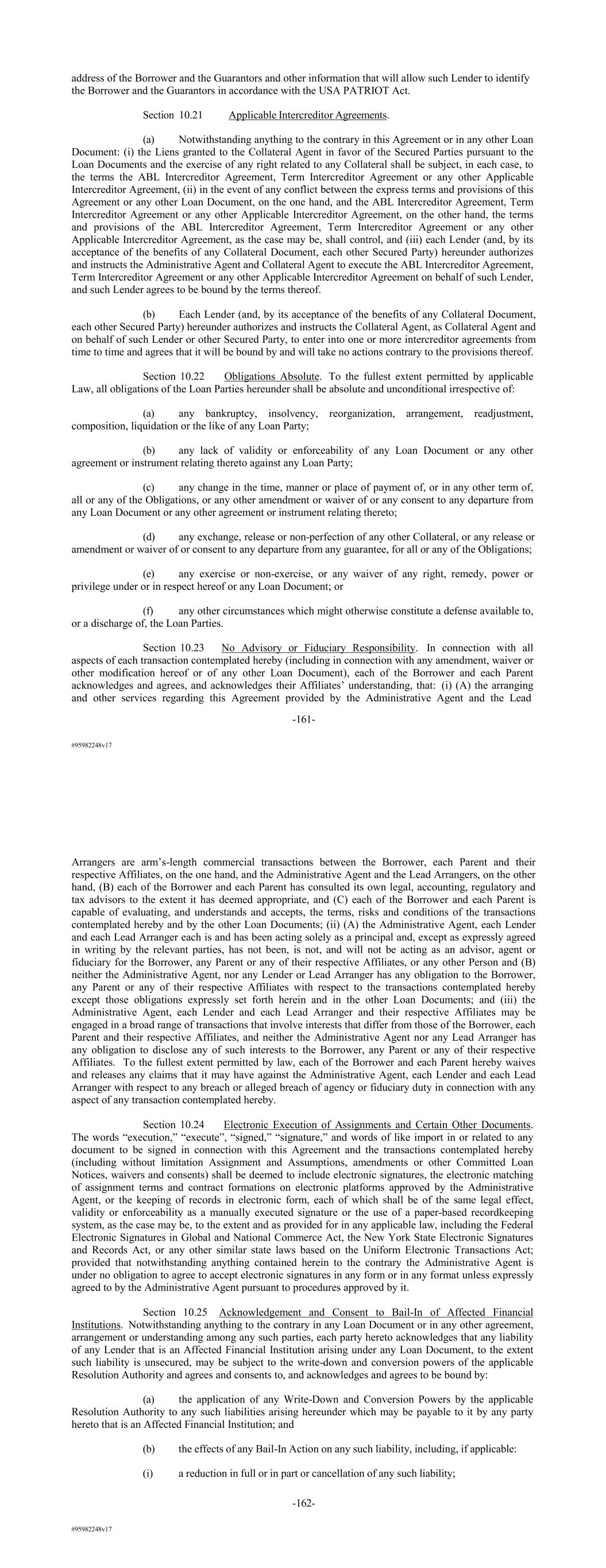 #95982248v17 address of the Borrower and the Guarantors and other information that will allow such Lender to identify the Borrower and the Guarantors in accordance with the USA PATRIOT Act. Section 10.21 Applicable Intercreditor Agreements. (a) Notwithstanding anything to the contrary in this Agreement or in any other Loan Document: (i) the Liens granted to the Collateral Agent in favor of the Secured Parties pursuant to the Loan Documents and the exercise of any right related to any Collateral shall be subject, in each case, to the terms the ABL Intercreditor Agreement, Term Intercreditor Agreement or any other Applicable Intercreditor Agreement, (ii) in the event of any conflict between the express terms and provisions of this Agreement or any other Loan Document, on the one hand, and the ABL Intercreditor Agreement, Term Intercreditor Agreement or any other Applicable Intercreditor Agreement, on the other hand, the terms and provisions of the ABL Intercreditor Agreement, Term Intercreditor Agreement or any other Applicable Intercreditor Agreement, as the case may be, shall control, and (iii) each Lender (and, by its acceptance of the benefits of any Collateral Document, each other Secured Party) hereunder authorizes and instructs the Administrative Agent and Collateral Agent to execute the ABL Intercreditor Agreement, Term Intercreditor Agreement or any other Applicable Intercreditor Agreement on behalf of such Lender, and such Lender agrees to be bound by the terms thereof. (b) Each Lender (and, by its acceptance of the benefits of any Collateral Document, each other Secured Party) hereunder authorizes and instructs the Collateral Agent, as Collateral Agent and on behalf of such Lender or other Secured Party, to enter into one or more intercreditor agreements from time to time and agrees that it will be bound by and will take no actions contrary to the provisions thereof. Section 10.22 Obligations Absolute. To the fullest extent permitted by applicable Law, all obligations of the Loan Parties hereunder shall be absolute and unconditional irrespective of: (a) any bankruptcy, insolvency, reorganization, arrangement, readjustment, composition, liquidation or the like of any Loan Party; (b) any lack of validity or enforceability of any Loan Document or any other agreement or instrument relating thereto against any Loan Party; (c) any change in the time, manner or place of payment of, or in any other term of, all or any of the Obligations, or any other amendment or waiver of or any consent to any departure from any Loan Document or any other agreement or instrument relating thereto; (d) any exchange, release or non-perfection of any other Collateral, or any release or amendment or waiver of or consent to any departure from any guarantee, for all or any of the Obligations; (e) any exercise or non-exercise, or any waiver of any right, remedy, power or privilege under or in respect hereof or any Loan Document; or (f) any other circumstances which might otherwise constitute a defense available to, or a discharge of, the Loan Parties. Section 10.23 No Advisory or Fiduciary Responsibility. In connection with all aspects of each transaction contemplated hereby (including in connection with any amendment, waiver or other modification hereof or of any other Loan Document), each of the Borrower and each Parent acknowledges and agrees, and acknowledges their Affiliates’ understanding, that: (i) (A) the arranging and other services regarding this Agreement provided by the Administrative Agent and the Lead -161- #95982248v17 Arrangers are arm’s-length commercial transactions between the Borrower, each Parent and their respective Affiliates, on the one hand, and the Administrative Agent and the Lead Arrangers, on the other hand, (B) each of the Borrower and each Parent has consulted its own legal, accounting, regulatory and tax advisors to the extent it has deemed appropriate, and (C) each of the Borrower and each Parent is capable of evaluating, and understands and accepts, the terms, risks and conditions of the transactions contemplated hereby and by the other Loan Documents; (ii) (A) the Administrative Agent, each Lender and each Lead Arranger each is and has been acting solely as a principal and, except as expressly agreed in writing by the relevant parties, has not been, is not, and will not be acting as an advisor, agent or fiduciary for the Borrower, any Parent or any of their respective Affiliates, or any other Person and (B) neither the Administrative Agent, nor any Lender or Lead Arranger has any obligation to the Borrower, any Parent or any of their respective Affiliates with respect to the transactions contemplated hereby except those obligations expressly set forth herein and in the other Loan Documents; and (iii) the Administrative Agent, each Lender and each Lead Arranger and their respective Affiliates may be engaged in a broad range of transactions that involve interests that differ from those of the Borrower, each Parent and their respective Affiliates, and neither the Administrative Agent nor any Lead Arranger has any obligation to disclose any of such interests to the Borrower, any Parent or any of their respective Affiliates. To the fullest extent permitted by law, each of the Borrower and each Parent hereby waives and releases any claims that it may have against the Administrative Agent, each Lender and each Lead Arranger with respect to any breach or alleged breach of agency or fiduciary duty in connection with any aspect of any transaction contemplated hereby. Section 10.24 Electronic Execution of Assignments and Certain Other Documents. The words “execution,” “execute”, “signed,” “signature,” and words of like import in or related to any document to be signed in connection with this Agreement and the transactions contemplated hereby (including without limitation Assignment and Assumptions, amendments or other Committed Loan Notices, waivers and consents) sha