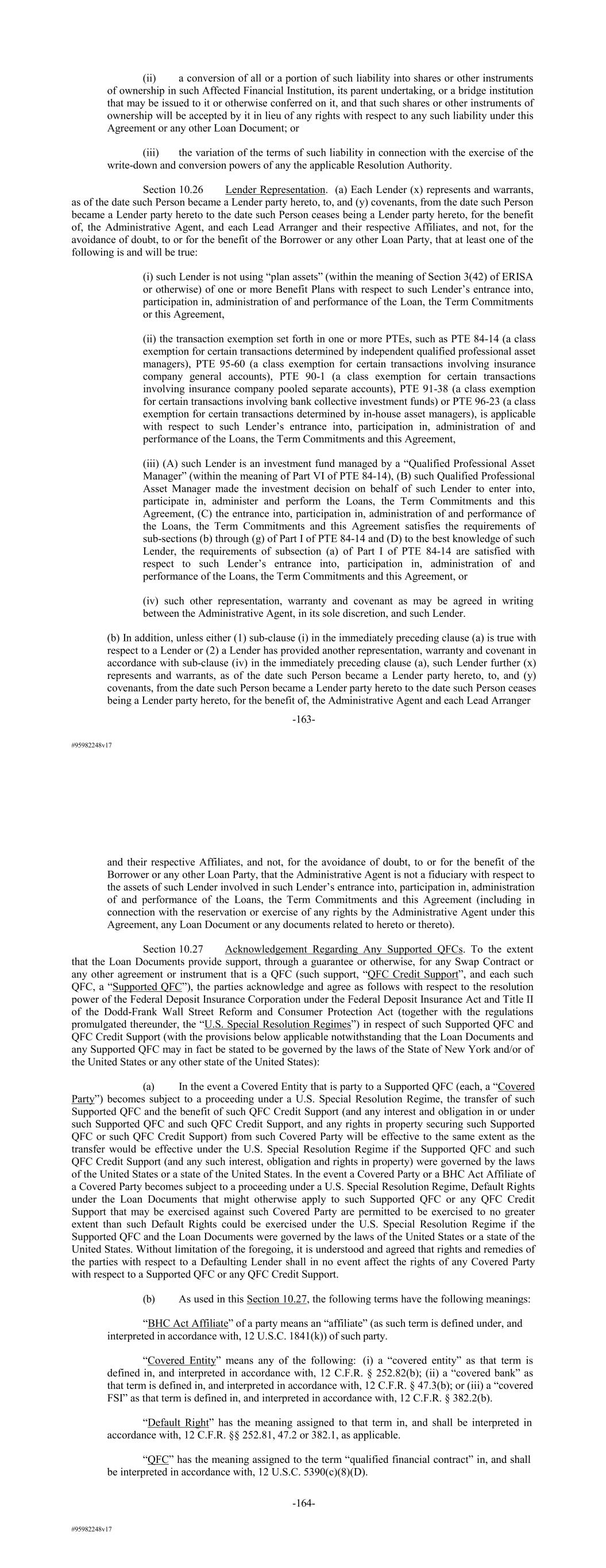 #95982248v17 (ii) a conversion of all or a portion of such liability into shares or other instruments of ownership in such Affected Financial Institution, its parent undertaking, or a bridge institution that may be issued to it or otherwise conferred on it, and that such shares or other instruments of ownership will be accepted by it in lieu of any rights with respect to any such liability under this Agreement or any other Loan Document; or (iii) the variation of the terms of such liability in connection with the exercise of the write-down and conversion powers of any the applicable Resolution Authority. Section 10.26 Lender Representation. (a) Each Lender (x) represents and warrants, as of the date such Person became a Lender party hereto, to, and (y) covenants, from the date such Person became a Lender party hereto to the date such Person ceases being a Lender party hereto, for the benefit of, the Administrative Agent, and each Lead Arranger and their respective Affiliates, and not, for the avoidance of doubt, to or for the benefit of the Borrower or any other Loan Party, that at least one of the following is and will be true: (i) such Lender is not using “plan assets” (within the meaning of Section 3(42) of ERISA or otherwise) of one or more Benefit Plans with respect to such Lender’s entrance into, participation in, administration of and performance of the Loan, the Term Commitments or this Agreement, (ii) the transaction exemption set forth in one or more PTEs, such as PTE 84-14 (a class exemption for certain transactions determined by independent qualified professional asset managers), PTE 95-60 (a class exemption for certain transactions involving insurance company general accounts), PTE 90-1 (a class exemption for certain transactions involving insurance company pooled separate accounts), PTE 91-38 (a class exemption for certain transactions involving bank collective investment funds) or PTE 96-23 (a class exemption for certain transactions determined by in-house asset managers), is applicable with respect to such Lender’s entrance into, participation in, administration of and performance of the Loans, the Term Commitments and this Agreement, (iii) (A) such Lender is an investment fund managed by a “Qualified Professional Asset Manager” (within the meaning of Part VI of PTE 84-14), (B) such Qualified Professional Asset Manager made the investment decision on behalf of such Lender to enter into, participate in, administer and perform the Loans, the Term Commitments and this Agreement, (C) the entrance into, participation in, administration of and performance of the Loans, the Term Commitments and this Agreement satisfies the requirements of sub-sections (b) through (g) of Part I of PTE 84-14 and (D) to the best knowledge of such Lender, the requirements of subsection (a) of Part I of PTE 84-14 are satisfied with respect to such Lender’s entrance into, participation in, administration of and performance of the Loans, the Term Commitments and this Agreement, or (iv) such other representation, warranty and covenant as may be agreed in writing between the Administrative Agent, in its sole discretion, and such Lender. (b) In addition, unless either (1) sub-clause (i) in the immediately preceding clause (a) is true with respect to a Lender or (2) a Lender has provided another representation, warranty and covenant in accordance with sub-clause (iv) in the immediately preceding clause (a), such Lender further (x) represents and warrants, as of the date such Person became a Lender party hereto, to, and (y) covenants, from the date such Person became a Lender party hereto to the date such Person ceases being a Lender party hereto, for the benefit of, the Administrative Agent and each Lead Arranger -163- #95982248v17 and their respective Affiliates, and not, for the avoidance of doubt, to or for the benefit of the Borrower or any other Loan Party, that the Administrative Agent is not a fiduciary with respect to the assets of such Lender involved in such Lender’s entrance into, participation in, administration of and performance of the Loans, the Term Commitments and this Agreement (including in connection with the reservation or exercise of any rights by the Administrative Agent under this Agreement, any Loan Document or any documents related to hereto or thereto). Section 10.27 Acknowledgement Regarding Any Supported QFCs. To the extent that the Loan Documents provide support, through a guarantee or otherwise, for any Swap Contract or any other agreement or instrument that is a QFC (such support, “QFC Credit Support”, and each such QFC, a “Supported QFC”), the parties acknowledge and agree as follows with respect to the resolution power of the Federal Deposit Insurance Corporation under the Federal Deposit Insurance Act and Title II of the Dodd-Frank Wall Street Reform and Consumer Protection Act (together with the regulations promulgated thereunder, the “U.S. Special Resolution Regimes”) in respect of such Supported QFC and QFC Credit Support (with the provisions below applicable notwithstanding that the Loan Documents and any Supported QFC may in fact be stated to be governed by the laws of the State of New York and/or of the United States or any other state of the United States): (a) In the event a Covered Entity that is party to a Supported QFC (each, a “Covered Party”) becomes subject to a proceeding under a U.S. Special Resolution Regime, the transfer of such Supported QFC and the benefit of such QFC Credit Support (and any interest and obligation in or under such Supported QFC and such QFC Credit Support, and any rights in property securing such Supported QFC or such QFC Credit Support) from such Covered Party will be effective to the same extent as the transfer would be effective under the U.S. Special Resolution Regime if the Supported QFC and such QFC Credit Support (and any such interest, obligation and rights in property) were governed by the laws