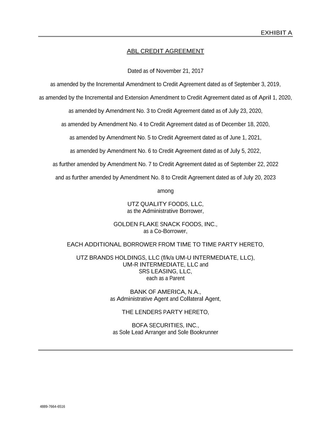EXHIBIT A 4889-7664-6516 ABL CREDIT AGREEMENT Dated as of November 21, 2017 as amended by the Incremental Amendment to Credit Agreement dated as of September 3, 2019, as amended by the Incremental and Extension Amendment to Credit Agreement dated as of April 1, 2020, as amended by Amendment No. 3 to Credit Agreement dated as of July 23, 2020, as amended by Amendment No. 4 to Credit Agreement dated as of December 18, 2020, as amended by Amendment No. 5 to Credit Agreement dated as of June 1, 2021, as amended by Amendment No. 6 to Credit Agreement dated as of July 5, 2022, as further amended by Amendment No. 7 to Credit Agreement dated as of September 22, 2022 and as further amended by Amendment No. 8 to Credit Agreement dated as of July 20, 2023 among UTZ QUALITY FOODS, LLC, as the Administrative Borrower, GOLDEN FLAKE SNACK FOODS, INC., as a Co-Borrower, EACH ADDITIONAL BORROWER FROM TIME TO TIME PARTY HERETO, UTZ BRANDS HOLDINGS, LLC (f/k/a UM-U INTERMEDIATE, LLC), UM-R INTERMEDIATE, LLC and SRS LEASING, LLC, each as a Parent BANK OF AMERICA, N.A., as Administrative Agent and Collateral Agent, THE LENDERS PARTY HERETO, BOFA SECURITIES, INC., as Sole Lead Arranger and Sole Bookrunner