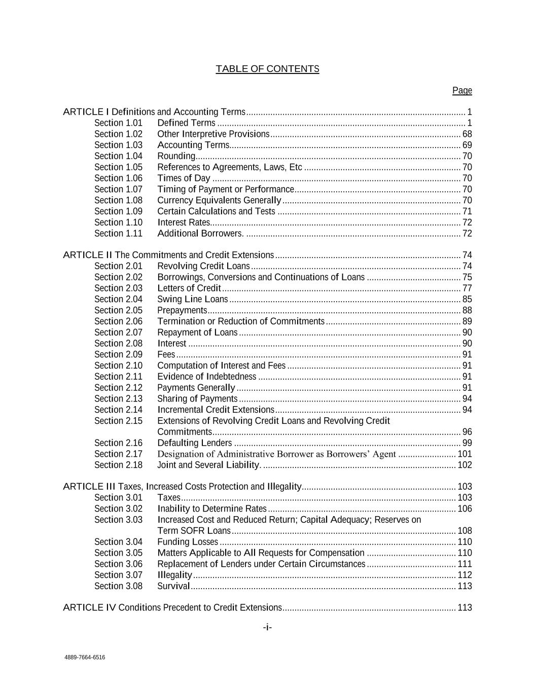 -i- 4889-7664-6516 TABLE OF CONTENTS Page ARTICLE I Definitions and Accounting Terms ........................................................................................... 1 Section 1.01 Defined Terms ....................................................................................................... 1 Section 1.02 Other Interpretive Provisions ............................................................................... 68 Section 1.03 Accounting Terms................................................................................................ 69 Section 1.04 Rounding .............................................................................................................. 70 Section 1.05 References to Agreements, Laws, Etc ................................................................. 70 Section 1.06 Times of Day ....................................................................................................... 70 Section 1.07 Timing of Payment or Performance ..................................................................... 70 Section 1.08 Currency Equivalents Generally .......................................................................... 70 Section 1.09 Certain Calculations and Tests ............................................................................ 71 Section 1.10 Interest Rates........................................................................................................ 72 Section 1.11 Additional Borrowers. ......................................................................................... 72 ARTICLE II The Commitments and Credit Extensions ............................................................................. 74 Section 2.01 Revolving Credit Loans ....................................................................................... 74 Section 2.02 Borrowings, Conversions and Continuations of Loans ....................................... 75 Section 2.03 Letters of Credit ................................................................................................... 77 Section 2.04 Swing Line Loans ................................................................................................ 85 Section 2.05 Prepayments ......................................................................................................... 88 Section 2.06 Termination or Reduction of Commitments ........................................................ 89 Section 2.07 Repayment of Loans ............................................................................................ 90 Section 2.08 Interest ................................................................................................................. 90 Section 2.09 Fees ...................................................................................................................... 91 Section 2.10 Computation of Interest and Fees ........................................................................ 91 Section 2.11 Evidence of Indebtedness .................................................................................... 91 Section 2.12 Payments Generally ............................................................................................. 91 Section 2.13 Sharing of Payments ............................................................................................ 94 Section 2.14 Incremental Credit Extensions ............................................................................. 94 Section 2.15 Extensions of Revolving Credit Loans and Revolving Credit Commitments ....................................................................................................... 96 Section 2.16 Defaulting Lenders .............................................................................................. 99 Section 2.17 Designation of Administrative Borrower as Borrowers’ Agent ........................ 101 Section 2.18 Joint and Several Liability. ................................................................................ 102 ARTICLE III Taxes, Increased Costs Protection and Illegality................................................................ 103 Section 3.01 Taxes .................................................................................................................. 103 Section 3.02 Inability to Determine Rates .............................................................................. 106 Section 3.03 Increased Cost and Reduced Return; Capital Adequacy; Reserves on Term SOFR Loans ............................................................................................. 108 Section 3.04 Funding Losses .................................................................................................. 110 Section 3.05 Matters Applicable to All Requests for Compensation ..................................... 110 Section 3.06 Replacement of Lenders under Certain Circumstances ..................................... 111 Section 3.07 Illegality ............................................................................................................. 112 Section 3.08 Survival .............................................................................................................. 113 ARTICLE IV Conditions Precedent to Credit Extensions ........................................................................ 113