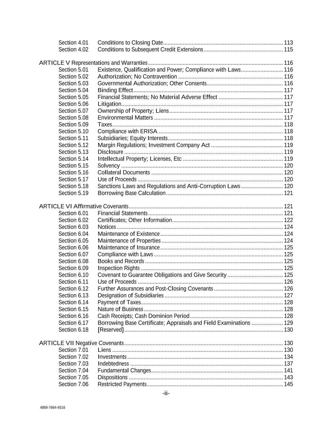-ii- 4889-7664-6516 Section 4.01 Conditions to Closing Date ................................................................................ 113 Section 4.02 Conditions to Subsequent Credit Extensions ..................................................... 115 ARTICLE V Representations and Warranties .......................................................................................... 116 Section 5.01 Existence, Qualification and Power; Compliance with Laws ............................ 116 Section 5.02 Authorization; No Contravention ...................................................................... 116 Section 5.03 Governmental Authorization; Other Consents ................................................... 116 Section 5.04 Binding Effect .................................................................................................... 117 Section 5.05 Financial Statements; No Material Adverse Effect ........................................... 117 Section 5.06 Litigation ............................................................................................................ 117 Section 5.07 Ownership of Property; Liens ............................................................................ 117 Section 5.08 Environmental Matters ...................................................................................... 117 Section 5.09 Taxes .................................................................................................................. 118 Section 5.10 Compliance with ERISA ................................................................................... 118 Section 5.11 Subsidiaries; Equity Interests ............................................................................. 118 Section 5.12 Margin Regulations; Investment Company Act ................................................ 119 Section 5.13 Disclosure .......................................................................................................... 119 Section 5.14 Intellectual Property; Licenses, Etc ................................................................... 119 Section 5.15 Solvency ............................................................................................................ 120 Section 5.16 Collateral Documents ........................................................................................ 120 Section 5.17 Use of Proceeds ................................................................................................. 120 Section 5.18 Sanctions Laws and Regulations and Anti-Corruption Laws ............................ 120 Section 5.19 Borrowing Base Calculation .............................................................................. 121 ARTICLE VI Affirmative Covenants ....................................................................................................... 121 Section 6.01 Financial Statements .......................................................................................... 121 Section 6.02 Certificates; Other Information .......................................................................... 122 Section 6.03 Notices ............................................................................................................... 124 Section 6.04 Maintenance of Existence .................................................................................. 124 Section 6.05 Maintenance of Properties ................................................................................. 124 Section 6.06 Maintenance of Insurance .................................................................................. 125 Section 6.07 Compliance with Laws ...................................................................................... 125 Section 6.08 Books and Records ............................................................................................ 125 Section 6.09 Inspection Rights ............................................................................................... 125 Section 6.10 Covenant to Guarantee Obligations and Give Security ..................................... 125 Section 6.11 Use of Proceeds ................................................................................................. 126 Section 6.12 Further Assurances and Post-Closing Covenants .............................................. 126 Section 6.13 Designation of Subsidiaries ............................................................................... 127 Section 6.14 Payment of Taxes............................................................................................... 128 Section 6.15 Nature of Business ............................................................................................. 128 Section 6.16 Cash Receipts; Cash Dominion Period .............................................................. 128 Section 6.17 Borrowing Base Certificate; Appraisals and Field Examinations ..................... 129 Section 6.18 [Reserved] .......................................................................................................... 130 ARTICLE VII Negative Covenants .......................................................................................................... 130 Section 7.01 Liens .................................................................................................................. 130 Section 7.02 Investments ........................................................................................................ 134 Section 7.03 Indebtedness ...................................................................................................... 137 Section 7.04 Fundamental Changes ........................................................................................ 141 Section 7.05 Dispositions ....................................................................................................... 143 Section 7.06 Restricted Payments ........................................................