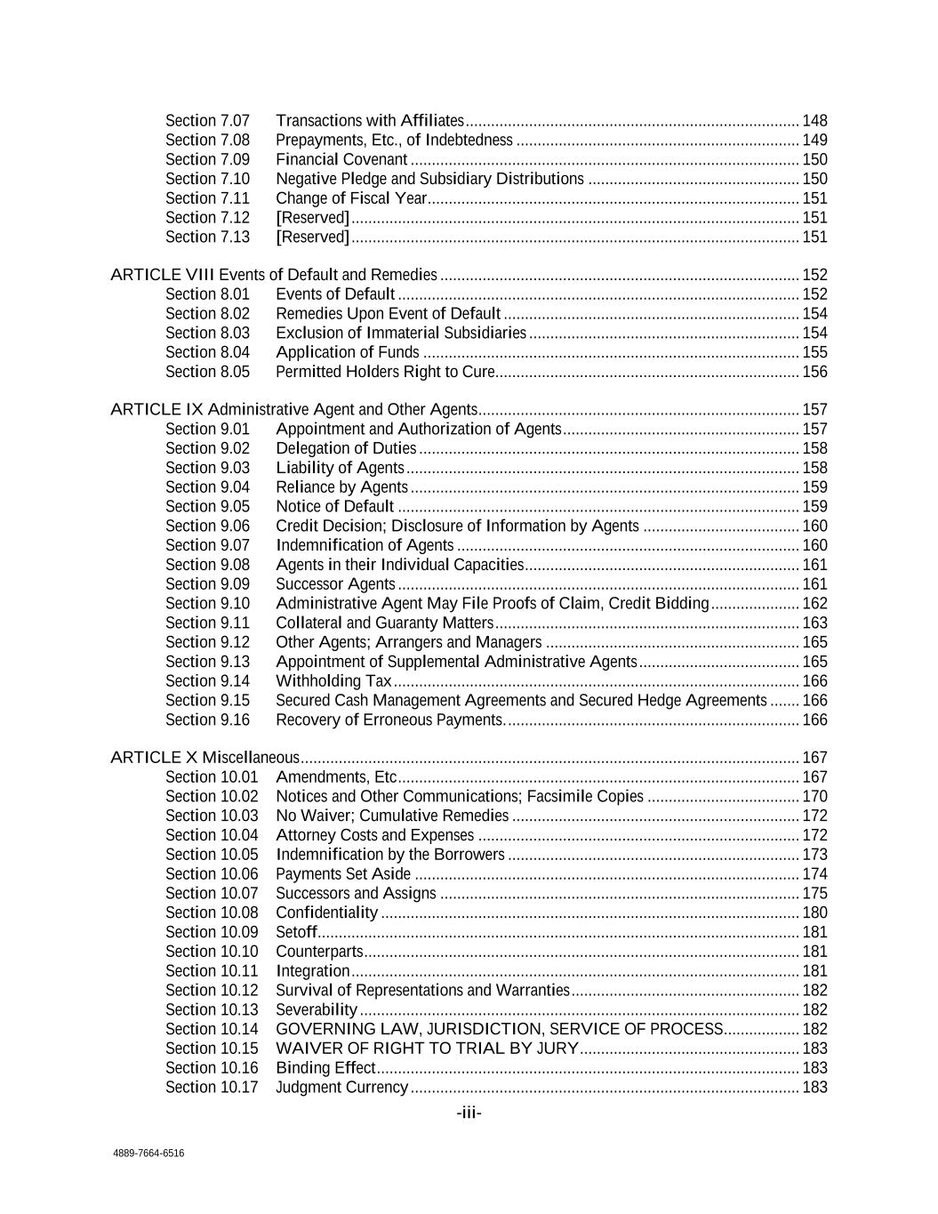 -iii- 4889-7664-6516 Section 7.07 Transactions with Affiliates ............................................................................... 148 Section 7.08 Prepayments, Etc., of Indebtedness ................................................................... 149 Section 7.09 Financial Covenant ............................................................................................ 150 Section 7.10 Negative Pledge and Subsidiary Distributions .................................................. 150 Section 7.11 Change of Fiscal Year ........................................................................................ 151 Section 7.12 [Reserved] .......................................................................................................... 151 Section 7.13 [Reserved] .......................................................................................................... 151 ARTICLE VIII Events of Default and Remedies ..................................................................................... 152 Section 8.01 Events of Default ............................................................................................... 152 Section 8.02 Remedies Upon Event of Default ...................................................................... 154 Section 8.03 Exclusion of Immaterial Subsidiaries ................................................................ 154 Section 8.04 Application of Funds ......................................................................................... 155 Section 8.05 Permitted Holders Right to Cure........................................................................ 156 ARTICLE IX Administrative Agent and Other Agents ............................................................................ 157 Section 9.01 Appointment and Authorization of Agents ........................................................ 157 Section 9.02 Delegation of Duties .......................................................................................... 158 Section 9.03 Liability of Agents ............................................................................................. 158 Section 9.04 Reliance by Agents ............................................................................................ 159 Section 9.05 Notice of Default ............................................................................................... 159 Section 9.06 Credit Decision; Disclosure of Information by Agents ..................................... 160 Section 9.07 Indemnification of Agents ................................................................................. 160 Section 9.08 Agents in their Individual Capacities ................................................................. 161 Section 9.09 Successor Agents ............................................................................................... 161 Section 9.10 Administrative Agent May File Proofs of Claim, Credit Bidding ..................... 162 Section 9.11 Collateral and Guaranty Matters ........................................................................ 163 Section 9.12 Other Agents; Arrangers and Managers ............................................................ 165 Section 9.13 Appointment of Supplemental Administrative Agents ...................................... 165 Section 9.14 Withholding Tax ................................................................................................ 166 Section 9.15 Secured Cash Management Agreements and Secured Hedge Agreements ....... 166 Section 9.16 Recovery of Erroneous Payments. ..................................................................... 166 ARTICLE X Miscellaneous ...................................................................................................................... 167 Section 10.01 Amendments, Etc ............................................................................................... 167 Section 10.02 Notices and Other Communications; Facsimile Copies .................................... 170 Section 10.03 No Waiver; Cumulative Remedies .................................................................... 172 Section 10.04 Attorney Costs and Expenses ............................................................................ 172 Section 10.05 Indemnification by the Borrowers ..................................................................... 173 Section 10.06 Payments Set Aside ........................................................................................... 174 Section 10.07 Successors and Assigns ..................................................................................... 175 Section 10.08 Confidentiality ................................................................................................... 180 Section 10.09 Setoff .................................................................................................................. 181 Section 10.10 Counterparts ....................................................................................................... 181 Section 10.11 Integration .......................................................................................................... 181 Section 10.12 Survival of Representations and Warranties ...................................................... 182 Section 10.13 Severability ........................................................................................................ 182 Section 10.14 GOVERNING LAW, JURISDICTION, SERVICE OF PROCESS .................. 182 Section 10.15 WAIVER OF RIGHT TO TRIAL BY JURY .................................................... 183 Section 10.16 Binding Effect .................................................................................................... 183 Section 10.17 Judgment Currency ............................................................................................ 183