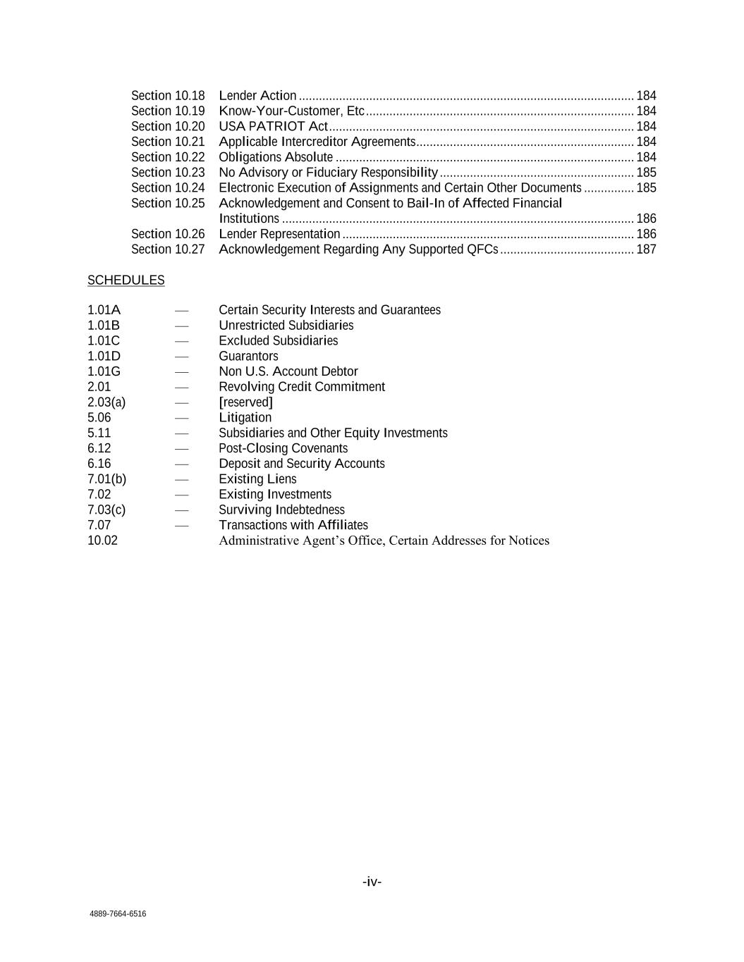 -iv- 4889-7664-6516 Section 10.18 Lender Action .................................................................................................... 184 Section 10.19 Know-Your-Customer, Etc ................................................................................ 184 Section 10.20 USA PATRIOT Act ........................................................................................... 184 Section 10.21 Applicable Intercreditor Agreements ................................................................. 184 Section 10.22 Obligations Absolute ......................................................................................... 184 Section 10.23 No Advisory or Fiduciary Responsibility .......................................................... 185 Section 10.24 Electronic Execution of Assignments and Certain Other Documents ............... 185 Section 10.25 Acknowledgement and Consent to Bail-In of Affected Financial Institutions ......................................................................................................... 186 Section 10.26 Lender Representation ....................................................................................... 186 Section 10.27 Acknowledgement Regarding Any Supported QFCs ........................................ 187 SCHEDULES 1.01A — Certain Security Interests and Guarantees 1.01B — Unrestricted Subsidiaries 1.01C — Excluded Subsidiaries 1.01D — Guarantors 1.01G — Non U.S. Account Debtor 2.01 — Revolving Credit Commitment 2.03(a) — [reserved] 5.06 — Litigation 5.11 — Subsidiaries and Other Equity Investments 6.12 — Post-Closing Covenants 6.16 — Deposit and Security Accounts 7.01(b) — Existing Liens 7.02 — Existing Investments 7.03(c) — Surviving Indebtedness 7.07 — Transactions with Affiliates 10.02 Administrative Agent’s Office, Certain Addresses for Notices