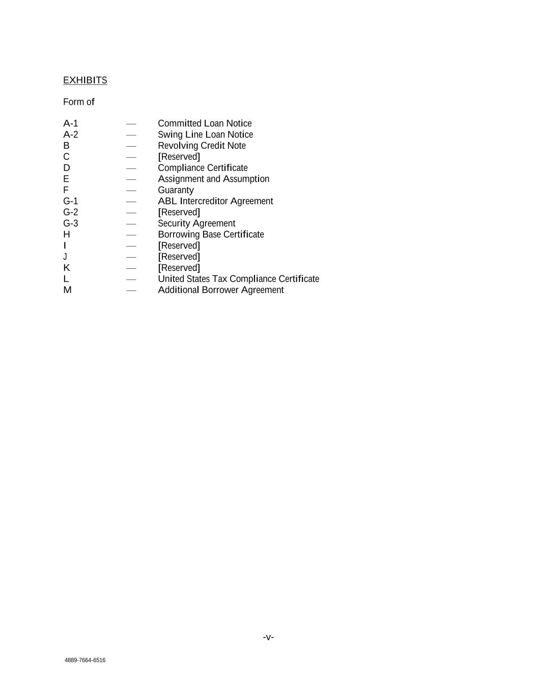 -v- 4889-7664-6516 EXHIBITS Form of A-1 — Committed Loan Notice A-2 — Swing Line Loan Notice B — Revolving Credit Note C — [Reserved] D — Compliance Certificate E — Assignment and Assumption F — Guaranty G-1 — ABL Intercreditor Agreement G-2 — [Reserved] G-3 — Security Agreement H — Borrowing Base Certificate I — [Reserved] J — [Reserved] K — [Reserved] L — United States Tax Compliance Certificate M — Additional Borrower Agreement