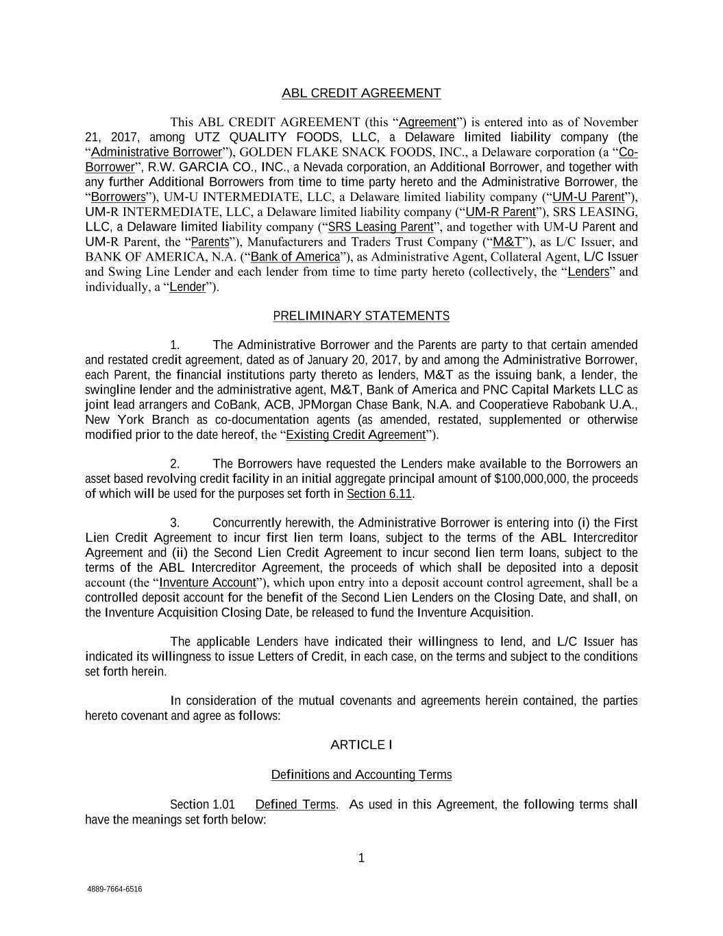1 4889-7664-6516 ABL CREDIT AGREEMENT This ABL CREDIT AGREEMENT (this “Agreement”) is entered into as of November 21, 2017, among UTZ QUALITY FOODS, LLC, a Delaware limited liability company (the “Administrative Borrower”), GOLDEN FLAKE SNACK FOODS, INC., a Delaware corporation (a “Co- Borrower”, R.W. GARCIA CO., INC., a Nevada corporation, an Additional Borrower, and together with any further Additional Borrowers from time to time party hereto and the Administrative Borrower, the “Borrowers”), UM-U INTERMEDIATE, LLC, a Delaware limited liability company (“UM-U Parent”), UM-R INTERMEDIATE, LLC, a Delaware limited liability company (“UM-R Parent”), SRS LEASING, LLC, a Delaware limited liability company (“SRS Leasing Parent”, and together with UM-U Parent and UM-R Parent, the “Parents”), Manufacturers and Traders Trust Company (“M&T”), as L/C Issuer, and BANK OF AMERICA, N.A. (“Bank of America”), as Administrative Agent, Collateral Agent, L/C Issuer and Swing Line Lender and each lender from time to time party hereto (collectively, the “Lenders” and individually, a “Lender”). PRELIMINARY STATEMENTS 1. The Administrative Borrower and the Parents are party to that certain amended and restated credit agreement, dated as of January 20, 2017, by and among the Administrative Borrower, each Parent, the financial institutions party thereto as lenders, M&T as the issuing bank, a lender, the swingline lender and the administrative agent, M&T, Bank of America and PNC Capital Markets LLC as joint lead arrangers and CoBank, ACB, JPMorgan Chase Bank, N.A. and Cooperatieve Rabobank U.A., New York Branch as co-documentation agents (as amended, restated, supplemented or otherwise modified prior to the date hereof, the “Existing Credit Agreement”). 2. The Borrowers have requested the Lenders make available to the Borrowers an asset based revolving credit facility in an initial aggregate principal amount of $100,000,000, the proceeds of which will be used for the purposes set forth in Section 6.11. 3. Concurrently herewith, the Administrative Borrower is entering into (i) the First Lien Credit Agreement to incur first lien term loans, subject to the terms of the ABL Intercreditor Agreement and (ii) the Second Lien Credit Agreement to incur second lien term loans, subject to the terms of the ABL Intercreditor Agreement, the proceeds of which shall be deposited into a deposit account (the “Inventure Account”), which upon entry into a deposit account control agreement, shall be a controlled deposit account for the benefit of the Second Lien Lenders on the Closing Date, and shall, on the Inventure Acquisition Closing Date, be released to fund the Inventure Acquisition. The applicable Lenders have indicated their willingness to lend, and L/C Issuer has indicated its willingness to issue Letters of Credit, in each case, on the terms and subject to the conditions set forth herein. In consideration of the mutual covenants and agreements herein contained, the parties hereto covenant and agree as follows: ARTICLE I Definitions and Accounting Terms Section 1.01 Defined Terms. As used in this Agreement, the following terms shall have the meanings set forth below: