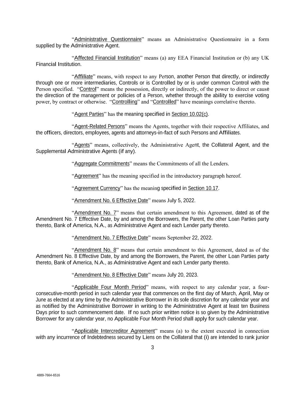 3 4889-7664-6516 “Administrative Questionnaire” means an Administrative Questionnaire in a form supplied by the Administrative Agent. “Affected Financial Institution” means (a) any EEA Financial Institution or (b) any UK Financial Institution. “Affiliate” means, with respect to any Person, another Person that directly, or indirectly through one or more intermediaries, Controls or is Controlled by or is under common Control with the Person specified. “Control” means the possession, directly or indirectly, of the power to direct or cause the direction of the management or policies of a Person, whether through the ability to exercise voting power, by contract or otherwise. “Controlling” and “Controlled” have meanings correlative thereto. “Agent Parties” has the meaning specified in Section 10.02(c). “Agent-Related Persons” means the Agents, together with their respective Affiliates, and the officers, directors, employees, agents and attorneys-in-fact of such Persons and Affiliates. “Agents” means, collectively, the Administrative Agent, the Collateral Agent, and the Supplemental Administrative Agents (if any). “Aggregate Commitments” means the Commitments of all the Lenders. “Agreement” has the meaning specified in the introductory paragraph hereof. “Agreement Currency” has the meaning specified in Section 10.17. “Amendment No. 6 Effective Date” means July 5, 2022. “Amendment No. 7” means that certain amendment to this Agreement, dated as of the Amendment No. 7 Effective Date, by and among the Borrowers, the Parent, the other Loan Parties party thereto, Bank of America, N.A., as Administrative Agent and each Lender party thereto. “Amendment No. 7 Effective Date” means September 22, 2022. “Amendment No. 8” means that certain amendment to this Agreement, dated as of the Amendment No. 8 Effective Date, by and among the Borrowers, the Parent, the other Loan Parties party thereto, Bank of America, N.A., as Administrative Agent and each Lender party thereto. “Amendment No. 8 Effective Date” means July 20, 2023. “Applicable Four Month Period” means, with respect to any calendar year, a four- consecutive-month period in such calendar year that commences on the first day of March, April, May or June as elected at any time by the Administrative Borrower in its sole discretion for any calendar year and as notified by the Administrative Borrower in writing to the Administrative Agent at least ten Business Days prior to such commencement date. If no such prior written notice is so given by the Administrative Borrower for any calendar year, no Applicable Four Month Period shall apply for such calendar year. “Applicable Intercreditor Agreement” means (a) to the extent executed in connection with any incurrence of Indebtedness secured by Liens on the Collateral that (i) are intended to rank junior
