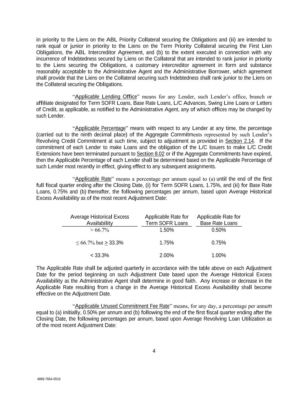 4 4889-7664-6516 in priority to the Liens on the ABL Priority Collateral securing the Obligations and (ii) are intended to rank equal or junior in priority to the Liens on the Term Priority Collateral securing the First Lien Obligations, the ABL Intercreditor Agreement, and (b) to the extent executed in connection with any incurrence of Indebtedness secured by Liens on the Collateral that are intended to rank junior in priority to the Liens securing the Obligations, a customary intercreditor agreement in form and substance reasonably acceptable to the Administrative Agent and the Administrative Borrower, which agreement shall provide that the Liens on the Collateral securing such Indebtedness shall rank junior to the Liens on the Collateral securing the Obligations. “Applicable Lending Office” means for any Lender, such Lender’s office, branch or affiliate designated for Term SOFR Loans, Base Rate Loans, L/C Advances, Swing Line Loans or Letters of Credit, as applicable, as notified to the Administrative Agent, any of which offices may be changed by such Lender. “Applicable Percentage” means with respect to any Lender at any time, the percentage (carried out to the ninth decimal place) of the Aggregate Commitments represented by such Lender’s Revolving Credit Commitment at such time, subject to adjustment as provided in Section 2.14. If the commitment of each Lender to make Loans and the obligation of the L/C Issuers to make L/C Credit Extensions have been terminated pursuant to Section 8.02 or if the Aggregate Commitments have expired, then the Applicable Percentage of each Lender shall be determined based on the Applicable Percentage of such Lender most recently in effect, giving effect to any subsequent assignments. “Applicable Rate” means a percentage per annum equal to (a) until the end of the first full fiscal quarter ending after the Closing Date, (i) for Term SOFR Loans, 1.75%, and (ii) for Base Rate Loans, 0.75% and (b) thereafter, the following percentages per annum, based upon Average Historical Excess Availability as of the most recent Adjustment Date: Average Historical Excess Availability Applicable Rate for Term SOFR Loans Applicable Rate for Base Rate Loans ˃ 66.7% 1.50% 0.50% ≤ 66.7% but > 33.3% 1.75% 0.75% < 33.3% 2.00% 1.00% The Applicable Rate shall be adjusted quarterly in accordance with the table above on each Adjustment Date for the period beginning on such Adjustment Date based upon the Average Historical Excess Availability as the Administrative Agent shall determine in good faith. Any increase or decrease in the Applicable Rate resulting from a change in the Average Historical Excess Availability shall become effective on the Adjustment Date. “Applicable Unused Commitment Fee Rate” means, for any day, a percentage per annum equal to (a) initially, 0.50% per annum and (b) following the end of the first fiscal quarter ending after the Closing Date, the following percentages per annum, based upon Average Revolving Loan Utilization as of the most recent Adjustment Date: