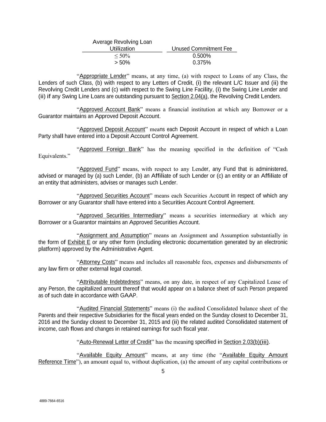 5 4889-7664-6516 Average Revolving Loan Utilization Unused Commitment Fee ≤ 50% 0.500% > 50% 0.375% “Appropriate Lender” means, at any time, (a) with respect to Loans of any Class, the Lenders of such Class, (b) with respect to any Letters of Credit, (i) the relevant L/C Issuer and (ii) the Revolving Credit Lenders and (c) with respect to the Swing Line Facility, (i) the Swing Line Lender and (ii) if any Swing Line Loans are outstanding pursuant to Section 2.04(a), the Revolving Credit Lenders. “Approved Account Bank” means a financial institution at which any Borrower or a Guarantor maintains an Approved Deposit Account. “Approved Deposit Account” means each Deposit Account in respect of which a Loan Party shall have entered into a Deposit Account Control Agreement. “Approved Foreign Bank” has the meaning specified in the definition of “Cash Equivalents.” “Approved Fund” means, with respect to any Lender, any Fund that is administered, advised or managed by (a) such Lender, (b) an Affiliate of such Lender or (c) an entity or an Affiliate of an entity that administers, advises or manages such Lender. “Approved Securities Account” means each Securities Account in respect of which any Borrower or any Guarantor shall have entered into a Securities Account Control Agreement. “Approved Securities Intermediary” means a securities intermediary at which any Borrower or a Guarantor maintains an Approved Securities Account. “Assignment and Assumption” means an Assignment and Assumption substantially in the form of Exhibit E or any other form (including electronic documentation generated by an electronic platform) approved by the Administrative Agent. “Attorney Costs” means and includes all reasonable fees, expenses and disbursements of any law firm or other external legal counsel. “Attributable Indebtedness” means, on any date, in respect of any Capitalized Lease of any Person, the capitalized amount thereof that would appear on a balance sheet of such Person prepared as of such date in accordance with GAAP. “Audited Financial Statements” means (i) the audited Consolidated balance sheet of the Parents and their respective Subsidiaries for the fiscal years ended on the Sunday closest to December 31, 2016 and the Sunday closest to December 31, 2015 and (ii) the related audited Consolidated statement of income, cash flows and changes in retained earnings for such fiscal year. “Auto-Renewal Letter of Credit” has the meaning specified in Section 2.03(b)(iii). “Available Equity Amount” means, at any time (the “Available Equity Amount Reference Time”), an amount equal to, without duplication, (a) the amount of any capital contributions or