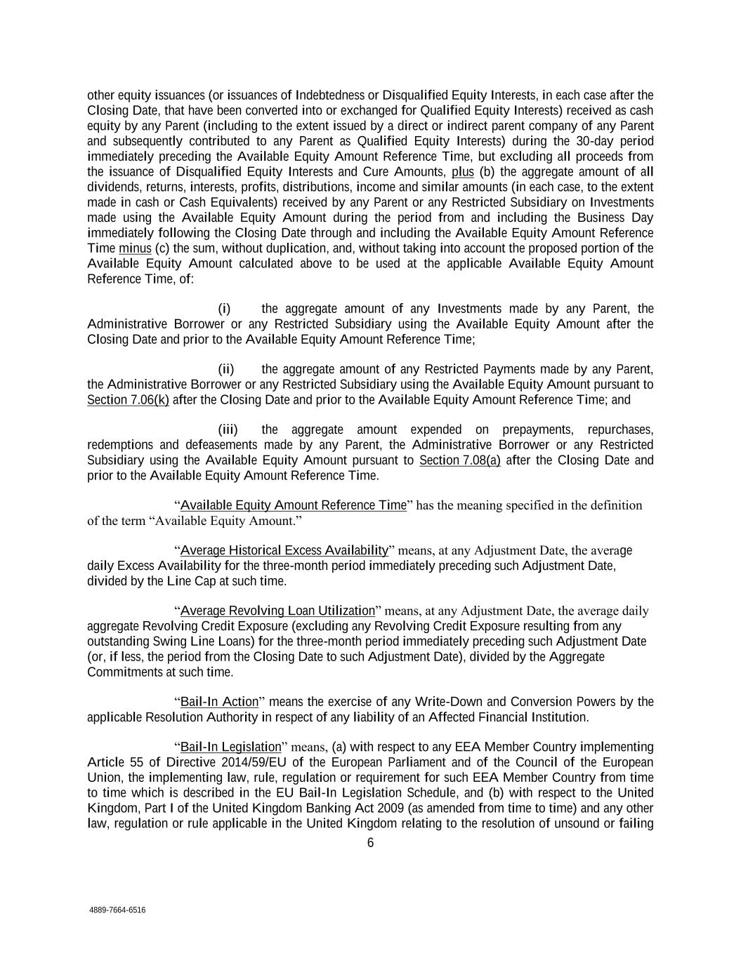 6 4889-7664-6516 other equity issuances (or issuances of Indebtedness or Disqualified Equity Interests, in each case after the Closing Date, that have been converted into or exchanged for Qualified Equity Interests) received as cash equity by any Parent (including to the extent issued by a direct or indirect parent company of any Parent and subsequently contributed to any Parent as Qualified Equity Interests) during the 30-day period immediately preceding the Available Equity Amount Reference Time, but excluding all proceeds from the issuance of Disqualified Equity Interests and Cure Amounts, plus (b) the aggregate amount of all dividends, returns, interests, profits, distributions, income and similar amounts (in each case, to the extent made in cash or Cash Equivalents) received by any Parent or any Restricted Subsidiary on Investments made using the Available Equity Amount during the period from and including the Business Day immediately following the Closing Date through and including the Available Equity Amount Reference Time minus (c) the sum, without duplication, and, without taking into account the proposed portion of the Available Equity Amount calculated above to be used at the applicable Available Equity Amount Reference Time, of: (i) the aggregate amount of any Investments made by any Parent, the Administrative Borrower or any Restricted Subsidiary using the Available Equity Amount after the Closing Date and prior to the Available Equity Amount Reference Time; (ii) the aggregate amount of any Restricted Payments made by any Parent, the Administrative Borrower or any Restricted Subsidiary using the Available Equity Amount pursuant to Section 7.06(k) after the Closing Date and prior to the Available Equity Amount Reference Time; and (iii) the aggregate amount expended on prepayments, repurchases, redemptions and defeasements made by any Parent, the Administrative Borrower or any Restricted Subsidiary using the Available Equity Amount pursuant to Section 7.08(a) after the Closing Date and prior to the Available Equity Amount Reference Time. “Available Equity Amount Reference Time” has the meaning specified in the definition of the term “Available Equity Amount.” “Average Historical Excess Availability” means, at any Adjustment Date, the average daily Excess Availability for the three-month period immediately preceding such Adjustment Date, divided by the Line Cap at such time. “Average Revolving Loan Utilization” means, at any Adjustment Date, the average daily aggregate Revolving Credit Exposure (excluding any Revolving Credit Exposure resulting from any outstanding Swing Line Loans) for the three-month period immediately preceding such Adjustment Date (or, if less, the period from the Closing Date to such Adjustment Date), divided by the Aggregate Commitments at such time. “Bail-In Action” means the exercise of any Write-Down and Conversion Powers by the applicable Resolution Authority in respect of any liability of an Affected Financial Institution. “Bail-In Legislation” means, (a) with respect to any EEA Member Country implementing Article 55 of Directive 2014/59/EU of the European Parliament and of the Council of the European Union, the implementing law, rule, regulation or requirement for such EEA Member Country from time to time which is described in the EU Bail-In Legislation Schedule, and (b) with respect to the United Kingdom, Part I of the United Kingdom Banking Act 2009 (as amended from time to time) and any other law, regulation or rule applicable in the United Kingdom relating to the resolution of unsound or failing