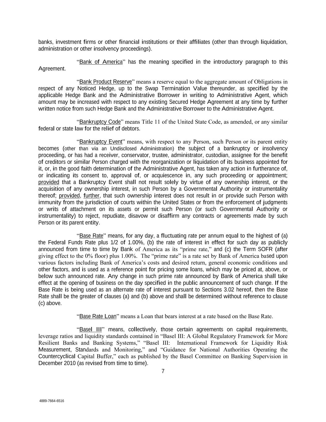 7 4889-7664-6516 banks, investment firms or other financial institutions or their affiliates (other than through liquidation, administration or other insolvency proceedings). “Bank of America” has the meaning specified in the introductory paragraph to this Agreement. “Bank Product Reserve” means a reserve equal to the aggregate amount of Obligations in respect of any Noticed Hedge, up to the Swap Termination Value thereunder, as specified by the applicable Hedge Bank and the Administrative Borrower in writing to Administrative Agent, which amount may be increased with respect to any existing Secured Hedge Agreement at any time by further written notice from such Hedge Bank and the Administrative Borrower to the Administrative Agent. “Bankruptcy Code” means Title 11 of the United State Code, as amended, or any similar federal or state law for the relief of debtors. “Bankruptcy Event” means, with respect to any Person, such Person or its parent entity becomes (other than via an Undisclosed Administration) the subject of a bankruptcy or insolvency proceeding, or has had a receiver, conservator, trustee, administrator, custodian, assignee for the benefit of creditors or similar Person charged with the reorganization or liquidation of its business appointed for it, or, in the good faith determination of the Administrative Agent, has taken any action in furtherance of, or indicating its consent to, approval of, or acquiescence in, any such proceeding or appointment; provided that a Bankruptcy Event shall not result solely by virtue of any ownership interest, or the acquisition of any ownership interest, in such Person by a Governmental Authority or instrumentality thereof; provided, further, that such ownership interest does not result in or provide such Person with immunity from the jurisdiction of courts within the United States or from the enforcement of judgments or writs of attachment on its assets or permit such Person (or such Governmental Authority or instrumentality) to reject, repudiate, disavow or disaffirm any contracts or agreements made by such Person or its parent entity. “Base Rate” means, for any day, a fluctuating rate per annum equal to the highest of (a) the Federal Funds Rate plus 1/2 of 1.00%, (b) the rate of interest in effect for such day as publicly announced from time to time by Bank of America as its “prime rate,” and (c) the Term SOFR (after giving effect to the 0% floor) plus 1.00%. The “prime rate” is a rate set by Bank of America based upon various factors including Bank of America’s costs and desired return, general economic conditions and other factors, and is used as a reference point for pricing some loans, which may be priced at, above, or below such announced rate. Any change in such prime rate announced by Bank of America shall take effect at the opening of business on the day specified in the public announcement of such change. If the Base Rate is being used as an alternate rate of interest pursuant to Sections 3.02 hereof, then the Base Rate shall be the greater of clauses (a) and (b) above and shall be determined without reference to clause (c) above. “Base Rate Loan” means a Loan that bears interest at a rate based on the Base Rate. “Basel III” means, collectively, those certain agreements on capital requirements, leverage ratios and liquidity standards contained in “Basel III: A Global Regulatory Framework for More Resilient Banks and Banking Systems,” “Basel III: International Framework for Liquidity Risk Measurement, Standards and Monitoring,” and “Guidance for National Authorities Operating the Countercyclical Capital Buffer,” each as published by the Basel Committee on Banking Supervision in December 2010 (as revised from time to time).