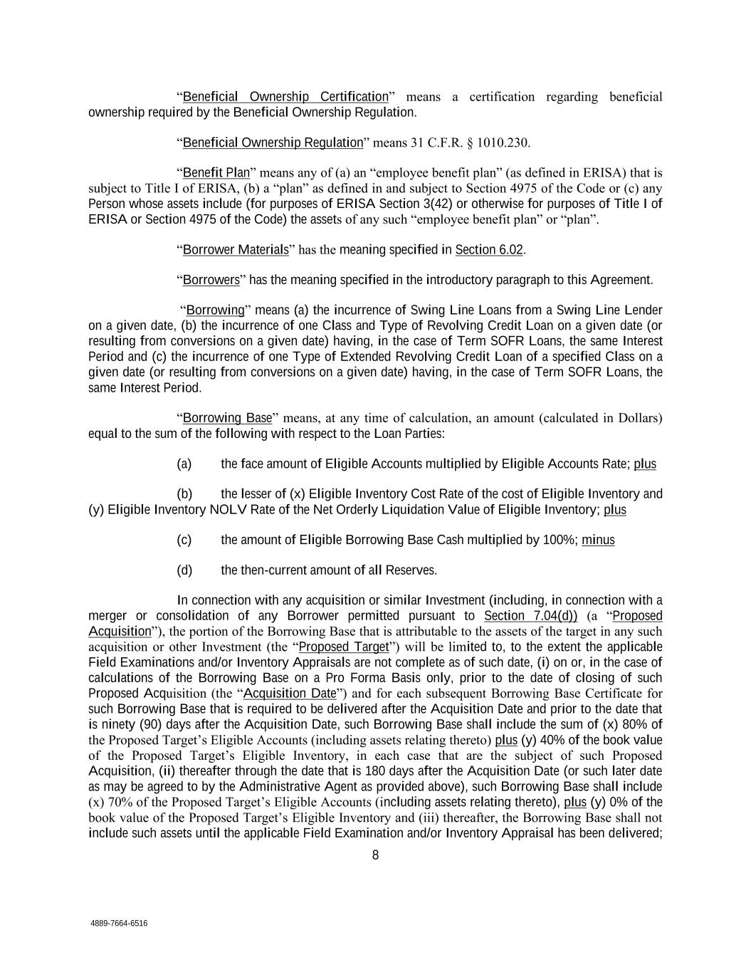 8 4889-7664-6516 “Beneficial Ownership Certification” means a certification regarding beneficial ownership required by the Beneficial Ownership Regulation. “Beneficial Ownership Regulation” means 31 C.F.R. § 1010.230. “Benefit Plan” means any of (a) an “employee benefit plan” (as defined in ERISA) that is subject to Title I of ERISA, (b) a “plan” as defined in and subject to Section 4975 of the Code or (c) any Person whose assets include (for purposes of ERISA Section 3(42) or otherwise for purposes of Title I of ERISA or Section 4975 of the Code) the assets of any such “employee benefit plan” or “plan”. “Borrower Materials” has the meaning specified in Section 6.02. “Borrowers” has the meaning specified in the introductory paragraph to this Agreement. “Borrowing” means (a) the incurrence of Swing Line Loans from a Swing Line Lender on a given date, (b) the incurrence of one Class and Type of Revolving Credit Loan on a given date (or resulting from conversions on a given date) having, in the case of Term SOFR Loans, the same Interest Period and (c) the incurrence of one Type of Extended Revolving Credit Loan of a specified Class on a given date (or resulting from conversions on a given date) having, in the case of Term SOFR Loans, the same Interest Period. “Borrowing Base” means, at any time of calculation, an amount (calculated in Dollars) equal to the sum of the following with respect to the Loan Parties: (a) the face amount of Eligible Accounts multiplied by Eligible Accounts Rate; plus (b) the lesser of (x) Eligible Inventory Cost Rate of the cost of Eligible Inventory and (y) Eligible Inventory NOLV Rate of the Net Orderly Liquidation Value of Eligible Inventory; plus (c) the amount of Eligible Borrowing Base Cash multiplied by 100%; minus (d) the then-current amount of all Reserves. In connection with any acquisition or similar Investment (including, in connection with a merger or consolidation of any Borrower permitted pursuant to Section 7.04(d)) (a “Proposed Acquisition”), the portion of the Borrowing Base that is attributable to the assets of the target in any such acquisition or other Investment (the “Proposed Target”) will be limited to, to the extent the applicable Field Examinations and/or Inventory Appraisals are not complete as of such date, (i) on or, in the case of calculations of the Borrowing Base on a Pro Forma Basis only, prior to the date of closing of such Proposed Acquisition (the “Acquisition Date”) and for each subsequent Borrowing Base Certificate for such Borrowing Base that is required to be delivered after the Acquisition Date and prior to the date that is ninety (90) days after the Acquisition Date, such Borrowing Base shall include the sum of (x) 80% of the Proposed Target’s Eligible Accounts (including assets relating thereto) plus (y) 40% of the book value of the Proposed Target’s Eligible Inventory, in each case that are the subject of such Proposed Acquisition, (ii) thereafter through the date that is 180 days after the Acquisition Date (or such later date as may be agreed to by the Administrative Agent as provided above), such Borrowing Base shall include (x) 70% of the Proposed Target’s Eligible Accounts (including assets relating thereto), plus (y) 0% of the book value of the Proposed Target’s Eligible Inventory and (iii) thereafter, the Borrowing Base shall not include such assets until the applicable Field Examination and/or Inventory Appraisal has been delivered;