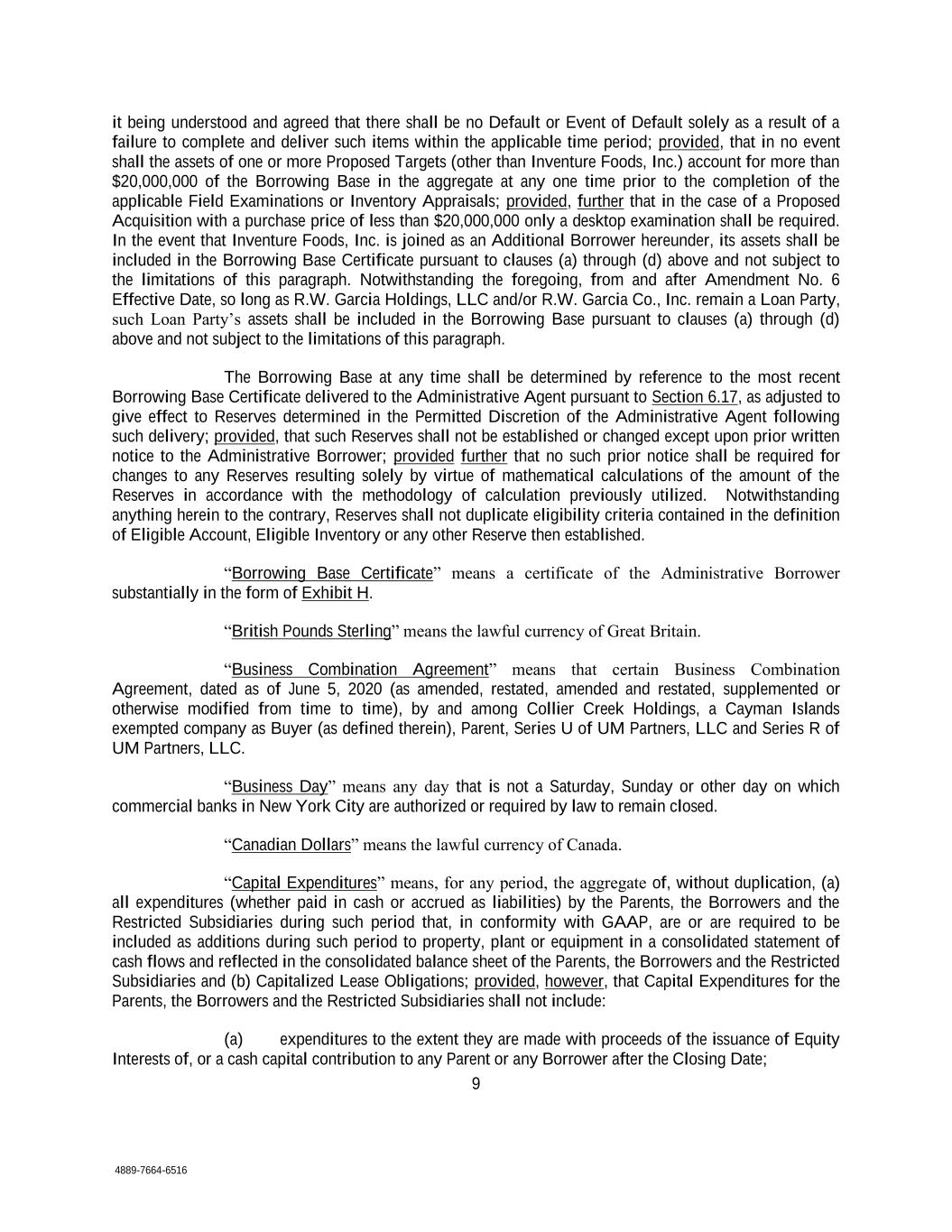 9 4889-7664-6516 it being understood and agreed that there shall be no Default or Event of Default solely as a result of a failure to complete and deliver such items within the applicable time period; provided, that in no event shall the assets of one or more Proposed Targets (other than Inventure Foods, Inc.) account for more than $20,000,000 of the Borrowing Base in the aggregate at any one time prior to the completion of the applicable Field Examinations or Inventory Appraisals; provided, further that in the case of a Proposed Acquisition with a purchase price of less than $20,000,000 only a desktop examination shall be required. In the event that Inventure Foods, Inc. is joined as an Additional Borrower hereunder, its assets shall be included in the Borrowing Base Certificate pursuant to clauses (a) through (d) above and not subject to the limitations of this paragraph. Notwithstanding the foregoing, from and after Amendment No. 6 Effective Date, so long as R.W. Garcia Holdings, LLC and/or R.W. Garcia Co., Inc. remain a Loan Party, such Loan Party’s assets shall be included in the Borrowing Base pursuant to clauses (a) through (d) above and not subject to the limitations of this paragraph. The Borrowing Base at any time shall be determined by reference to the most recent Borrowing Base Certificate delivered to the Administrative Agent pursuant to Section 6.17, as adjusted to give effect to Reserves determined in the Permitted Discretion of the Administrative Agent following such delivery; provided, that such Reserves shall not be established or changed except upon prior written notice to the Administrative Borrower; provided further that no such prior notice shall be required for changes to any Reserves resulting solely by virtue of mathematical calculations of the amount of the Reserves in accordance with the methodology of calculation previously utilized. Notwithstanding anything herein to the contrary, Reserves shall not duplicate eligibility criteria contained in the definition of Eligible Account, Eligible Inventory or any other Reserve then established. “Borrowing Base Certificate” means a certificate of the Administrative Borrower substantially in the form of Exhibit H. “British Pounds Sterling” means the lawful currency of Great Britain. “Business Combination Agreement” means that certain Business Combination Agreement, dated as of June 5, 2020 (as amended, restated, amended and restated, supplemented or otherwise modified from time to time), by and among Collier Creek Holdings, a Cayman Islands exempted company as Buyer (as defined therein), Parent, Series U of UM Partners, LLC and Series R of UM Partners, LLC. “Business Day” means any day that is not a Saturday, Sunday or other day on which commercial banks in New York City are authorized or required by law to remain closed. “Canadian Dollars” means the lawful currency of Canada. “Capital Expenditures” means, for any period, the aggregate of, without duplication, (a) all expenditures (whether paid in cash or accrued as liabilities) by the Parents, the Borrowers and the Restricted Subsidiaries during such period that, in conformity with GAAP, are or are required to be included as additions during such period to property, plant or equipment in a consolidated statement of cash flows and reflected in the consolidated balance sheet of the Parents, the Borrowers and the Restricted Subsidiaries and (b) Capitalized Lease Obligations; provided, however, that Capital Expenditures for the Parents, the Borrowers and the Restricted Subsidiaries shall not include: (a) expenditures to the extent they are made with proceeds of the issuance of Equity Interests of, or a cash capital contribution to any Parent or any Borrower after the Closing Date;