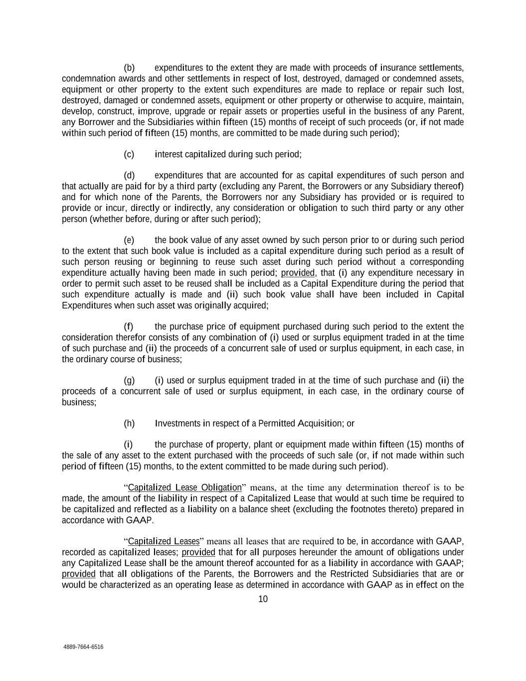 10 4889-7664-6516 (b) expenditures to the extent they are made with proceeds of insurance settlements, condemnation awards and other settlements in respect of lost, destroyed, damaged or condemned assets, equipment or other property to the extent such expenditures are made to replace or repair such lost, destroyed, damaged or condemned assets, equipment or other property or otherwise to acquire, maintain, develop, construct, improve, upgrade or repair assets or properties useful in the business of any Parent, any Borrower and the Subsidiaries within fifteen (15) months of receipt of such proceeds (or, if not made within such period of fifteen (15) months, are committed to be made during such period); (c) interest capitalized during such period; (d) expenditures that are accounted for as capital expenditures of such person and that actually are paid for by a third party (excluding any Parent, the Borrowers or any Subsidiary thereof) and for which none of the Parents, the Borrowers nor any Subsidiary has provided or is required to provide or incur, directly or indirectly, any consideration or obligation to such third party or any other person (whether before, during or after such period); (e) the book value of any asset owned by such person prior to or during such period to the extent that such book value is included as a capital expenditure during such period as a result of such person reusing or beginning to reuse such asset during such period without a corresponding expenditure actually having been made in such period; provided, that (i) any expenditure necessary in order to permit such asset to be reused shall be included as a Capital Expenditure during the period that such expenditure actually is made and (ii) such book value shall have been included in Capital Expenditures when such asset was originally acquired; (f) the purchase price of equipment purchased during such period to the extent the consideration therefor consists of any combination of (i) used or surplus equipment traded in at the time of such purchase and (ii) the proceeds of a concurrent sale of used or surplus equipment, in each case, in the ordinary course of business; (g) (i) used or surplus equipment traded in at the time of such purchase and (ii) the proceeds of a concurrent sale of used or surplus equipment, in each case, in the ordinary course of business; (h) Investments in respect of a Permitted Acquisition; or (i) the purchase of property, plant or equipment made within fifteen (15) months of the sale of any asset to the extent purchased with the proceeds of such sale (or, if not made within such period of fifteen (15) months, to the extent committed to be made during such period). “Capitalized Lease Obligation” means, at the time any determination thereof is to be made, the amount of the liability in respect of a Capitalized Lease that would at such time be required to be capitalized and reflected as a liability on a balance sheet (excluding the footnotes thereto) prepared in accordance with GAAP. “Capitalized Leases” means all leases that are required to be, in accordance with GAAP, recorded as capitalized leases; provided that for all purposes hereunder the amount of obligations under any Capitalized Lease shall be the amount thereof accounted for as a liability in accordance with GAAP; provided that all obligations of the Parents, the Borrowers and the Restricted Subsidiaries that are or would be characterized as an operating lease as determined in accordance with GAAP as in effect on the
