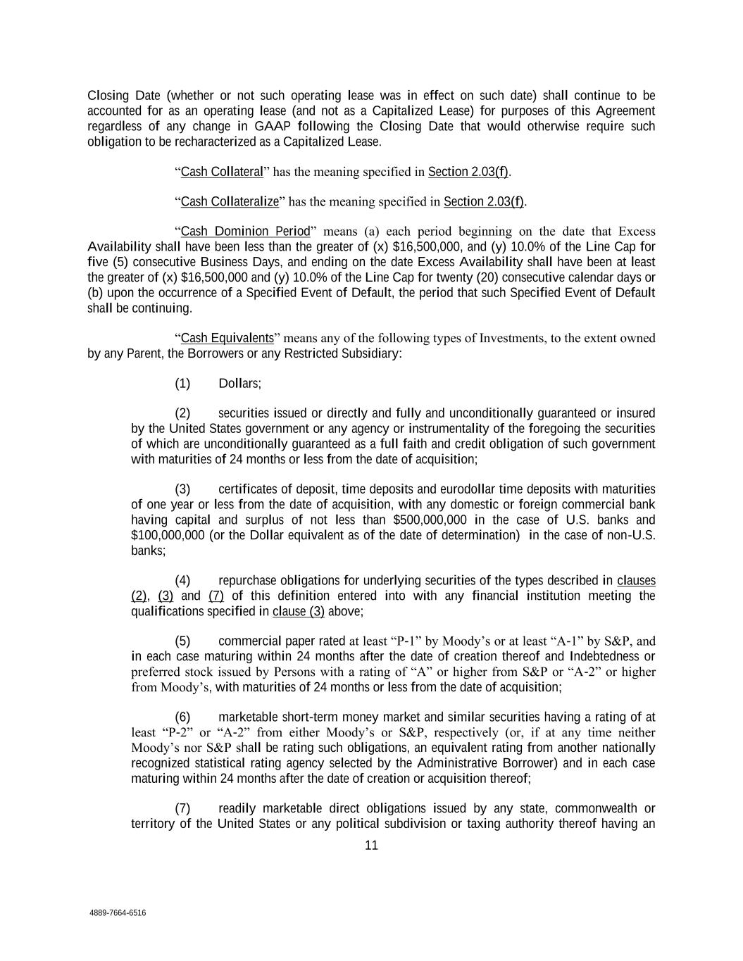 11 4889-7664-6516 Closing Date (whether or not such operating lease was in effect on such date) shall continue to be accounted for as an operating lease (and not as a Capitalized Lease) for purposes of this Agreement regardless of any change in GAAP following the Closing Date that would otherwise require such obligation to be recharacterized as a Capitalized Lease. “Cash Collateral” has the meaning specified in Section 2.03(f). “Cash Collateralize” has the meaning specified in Section 2.03(f). “Cash Dominion Period” means (a) each period beginning on the date that Excess Availability shall have been less than the greater of (x) $16,500,000, and (y) 10.0% of the Line Cap for five (5) consecutive Business Days, and ending on the date Excess Availability shall have been at least the greater of (x) $16,500,000 and (y) 10.0% of the Line Cap for twenty (20) consecutive calendar days or (b) upon the occurrence of a Specified Event of Default, the period that such Specified Event of Default shall be continuing. “Cash Equivalents” means any of the following types of Investments, to the extent owned by any Parent, the Borrowers or any Restricted Subsidiary: (1) Dollars; (2) securities issued or directly and fully and unconditionally guaranteed or insured by the United States government or any agency or instrumentality of the foregoing the securities of which are unconditionally guaranteed as a full faith and credit obligation of such government with maturities of 24 months or less from the date of acquisition; (3) certificates of deposit, time deposits and eurodollar time deposits with maturities of one year or less from the date of acquisition, with any domestic or foreign commercial bank having capital and surplus of not less than $500,000,000 in the case of U.S. banks and $100,000,000 (or the Dollar equivalent as of the date of determination) in the case of non-U.S. banks; (4) repurchase obligations for underlying securities of the types described in clauses (2), (3) and (7) of this definition entered into with any financial institution meeting the qualifications specified in clause (3) above; (5) commercial paper rated at least “P-1” by Moody’s or at least “A-1” by S&P, and in each case maturing within 24 months after the date of creation thereof and Indebtedness or preferred stock issued by Persons with a rating of “A” or higher from S&P or “A-2” or higher from Moody’s, with maturities of 24 months or less from the date of acquisition; (6) marketable short-term money market and similar securities having a rating of at least “P-2” or “A-2” from either Moody’s or S&P, respectively (or, if at any time neither Moody’s nor S&P shall be rating such obligations, an equivalent rating from another nationally recognized statistical rating agency selected by the Administrative Borrower) and in each case maturing within 24 months after the date of creation or acquisition thereof; (7) readily marketable direct obligations issued by any state, commonwealth or territory of the United States or any political subdivision or taxing authority thereof having an
