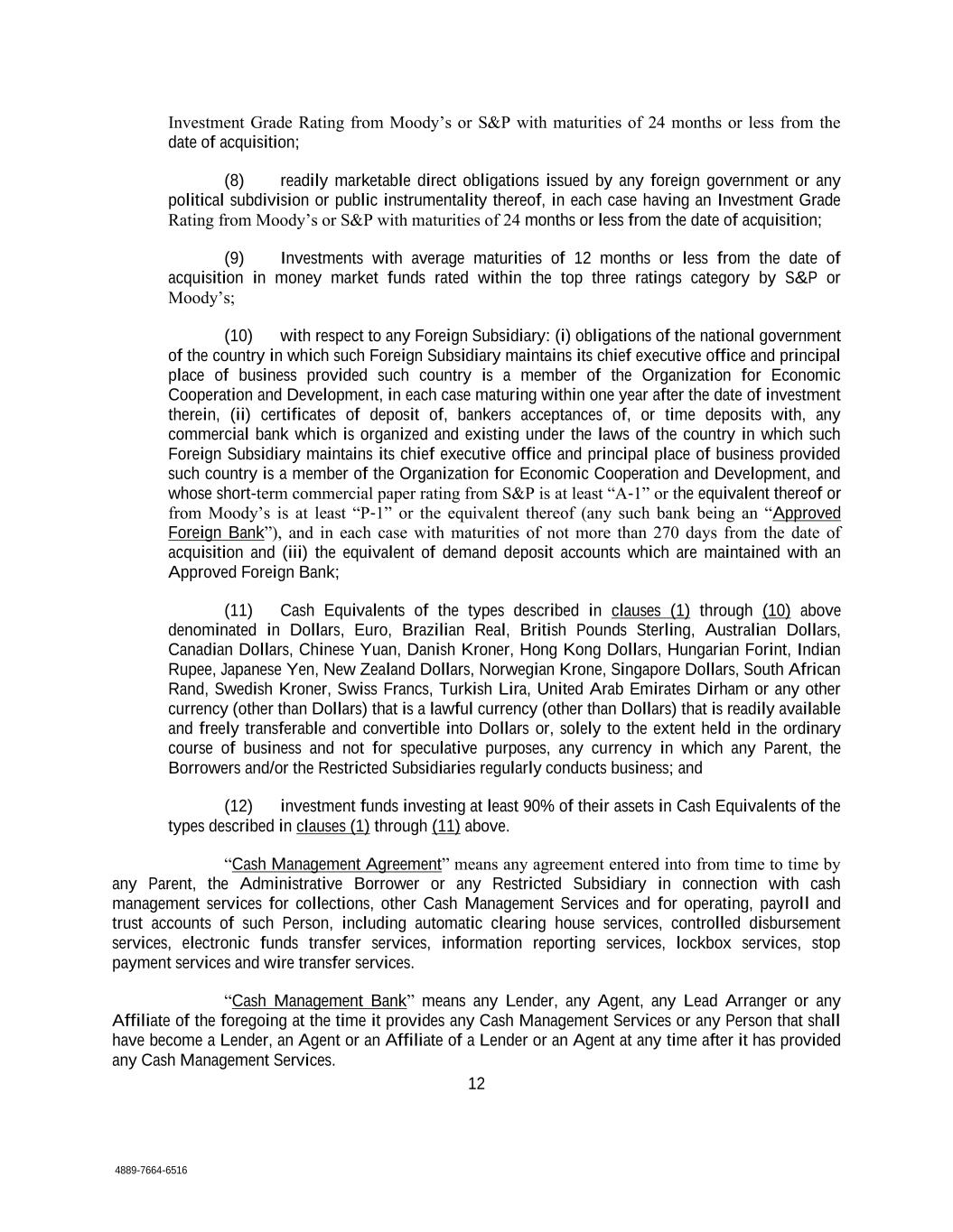 12 4889-7664-6516 Investment Grade Rating from Moody’s or S&P with maturities of 24 months or less from the date of acquisition; (8) readily marketable direct obligations issued by any foreign government or any political subdivision or public instrumentality thereof, in each case having an Investment Grade Rating from Moody’s or S&P with maturities of 24 months or less from the date of acquisition; (9) Investments with average maturities of 12 months or less from the date of acquisition in money market funds rated within the top three ratings category by S&P or Moody’s; (10) with respect to any Foreign Subsidiary: (i) obligations of the national government of the country in which such Foreign Subsidiary maintains its chief executive office and principal place of business provided such country is a member of the Organization for Economic Cooperation and Development, in each case maturing within one year after the date of investment therein, (ii) certificates of deposit of, bankers acceptances of, or time deposits with, any commercial bank which is organized and existing under the laws of the country in which such Foreign Subsidiary maintains its chief executive office and principal place of business provided such country is a member of the Organization for Economic Cooperation and Development, and whose short-term commercial paper rating from S&P is at least “A-1” or the equivalent thereof or from Moody’s is at least “P-1” or the equivalent thereof (any such bank being an “Approved Foreign Bank”), and in each case with maturities of not more than 270 days from the date of acquisition and (iii) the equivalent of demand deposit accounts which are maintained with an Approved Foreign Bank; (11) Cash Equivalents of the types described in clauses (1) through (10) above denominated in Dollars, Euro, Brazilian Real, British Pounds Sterling, Australian Dollars, Canadian Dollars, Chinese Yuan, Danish Kroner, Hong Kong Dollars, Hungarian Forint, Indian Rupee, Japanese Yen, New Zealand Dollars, Norwegian Krone, Singapore Dollars, South African Rand, Swedish Kroner, Swiss Francs, Turkish Lira, United Arab Emirates Dirham or any other currency (other than Dollars) that is a lawful currency (other than Dollars) that is readily available and freely transferable and convertible into Dollars or, solely to the extent held in the ordinary course of business and not for speculative purposes, any currency in which any Parent, the Borrowers and/or the Restricted Subsidiaries regularly conducts business; and (12) investment funds investing at least 90% of their assets in Cash Equivalents of the types described in clauses (1) through (11) above. “Cash Management Agreement” means any agreement entered into from time to time by any Parent, the Administrative Borrower or any Restricted Subsidiary in connection with cash management services for collections, other Cash Management Services and for operating, payroll and trust accounts of such Person, including automatic clearing house services, controlled disbursement services, electronic funds transfer services, information reporting services, lockbox services, stop payment services and wire transfer services. “Cash Management Bank” means any Lender, any Agent, any Lead Arranger or any Affiliate of the foregoing at the time it provides any Cash Management Services or any Person that shall have become a Lender, an Agent or an Affiliate of a Lender or an Agent at any time after it has provided any Cash Management Services.