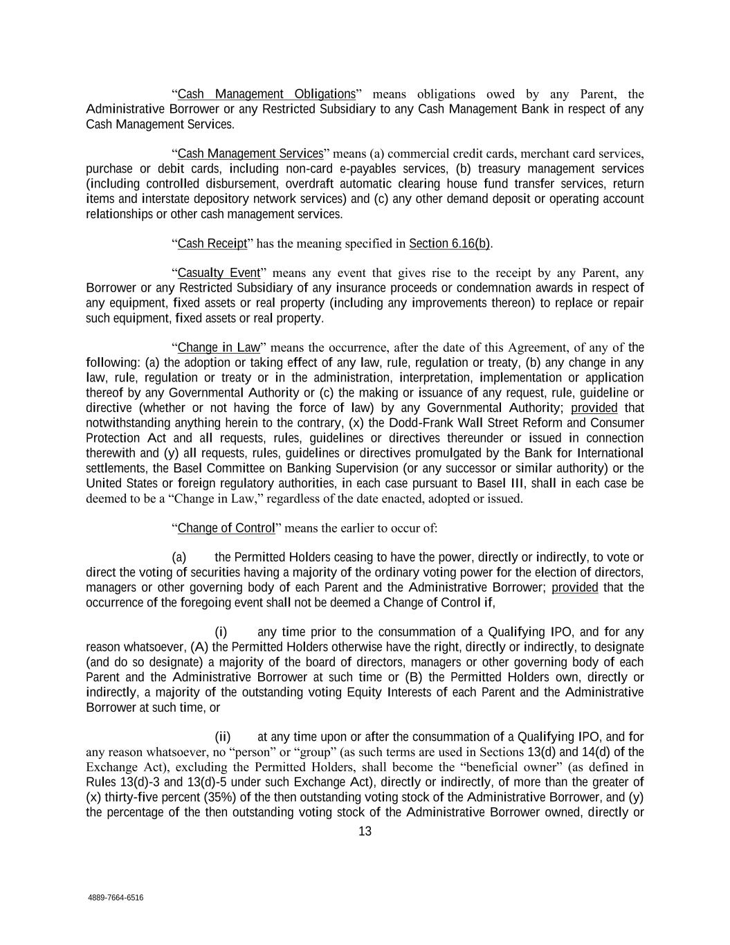 13 4889-7664-6516 “Cash Management Obligations” means obligations owed by any Parent, the Administrative Borrower or any Restricted Subsidiary to any Cash Management Bank in respect of any Cash Management Services. “Cash Management Services” means (a) commercial credit cards, merchant card services, purchase or debit cards, including non-card e-payables services, (b) treasury management services (including controlled disbursement, overdraft automatic clearing house fund transfer services, return items and interstate depository network services) and (c) any other demand deposit or operating account relationships or other cash management services. “Cash Receipt” has the meaning specified in Section 6.16(b). “Casualty Event” means any event that gives rise to the receipt by any Parent, any Borrower or any Restricted Subsidiary of any insurance proceeds or condemnation awards in respect of any equipment, fixed assets or real property (including any improvements thereon) to replace or repair such equipment, fixed assets or real property. “Change in Law” means the occurrence, after the date of this Agreement, of any of the following: (a) the adoption or taking effect of any law, rule, regulation or treaty, (b) any change in any law, rule, regulation or treaty or in the administration, interpretation, implementation or application thereof by any Governmental Authority or (c) the making or issuance of any request, rule, guideline or directive (whether or not having the force of law) by any Governmental Authority; provided that notwithstanding anything herein to the contrary, (x) the Dodd-Frank Wall Street Reform and Consumer Protection Act and all requests, rules, guidelines or directives thereunder or issued in connection therewith and (y) all requests, rules, guidelines or directives promulgated by the Bank for International settlements, the Basel Committee on Banking Supervision (or any successor or similar authority) or the United States or foreign regulatory authorities, in each case pursuant to Basel III, shall in each case be deemed to be a “Change in Law,” regardless of the date enacted, adopted or issued. “Change of Control” means the earlier to occur of: (a) the Permitted Holders ceasing to have the power, directly or indirectly, to vote or direct the voting of securities having a majority of the ordinary voting power for the election of directors, managers or other governing body of each Parent and the Administrative Borrower; provided that the occurrence of the foregoing event shall not be deemed a Change of Control if, (i) any time prior to the consummation of a Qualifying IPO, and for any reason whatsoever, (A) the Permitted Holders otherwise have the right, directly or indirectly, to designate (and do so designate) a majority of the board of directors, managers or other governing body of each Parent and the Administrative Borrower at such time or (B) the Permitted Holders own, directly or indirectly, a majority of the outstanding voting Equity Interests of each Parent and the Administrative Borrower at such time, or (ii) at any time upon or after the consummation of a Qualifying IPO, and for any reason whatsoever, no “person” or “group” (as such terms are used in Sections 13(d) and 14(d) of the Exchange Act), excluding the Permitted Holders, shall become the “beneficial owner” (as defined in Rules 13(d)-3 and 13(d)-5 under such Exchange Act), directly or indirectly, of more than the greater of (x) thirty-five percent (35%) of the then outstanding voting stock of the Administrative Borrower, and (y) the percentage of the then outstanding voting stock of the Administrative Borrower owned, directly or